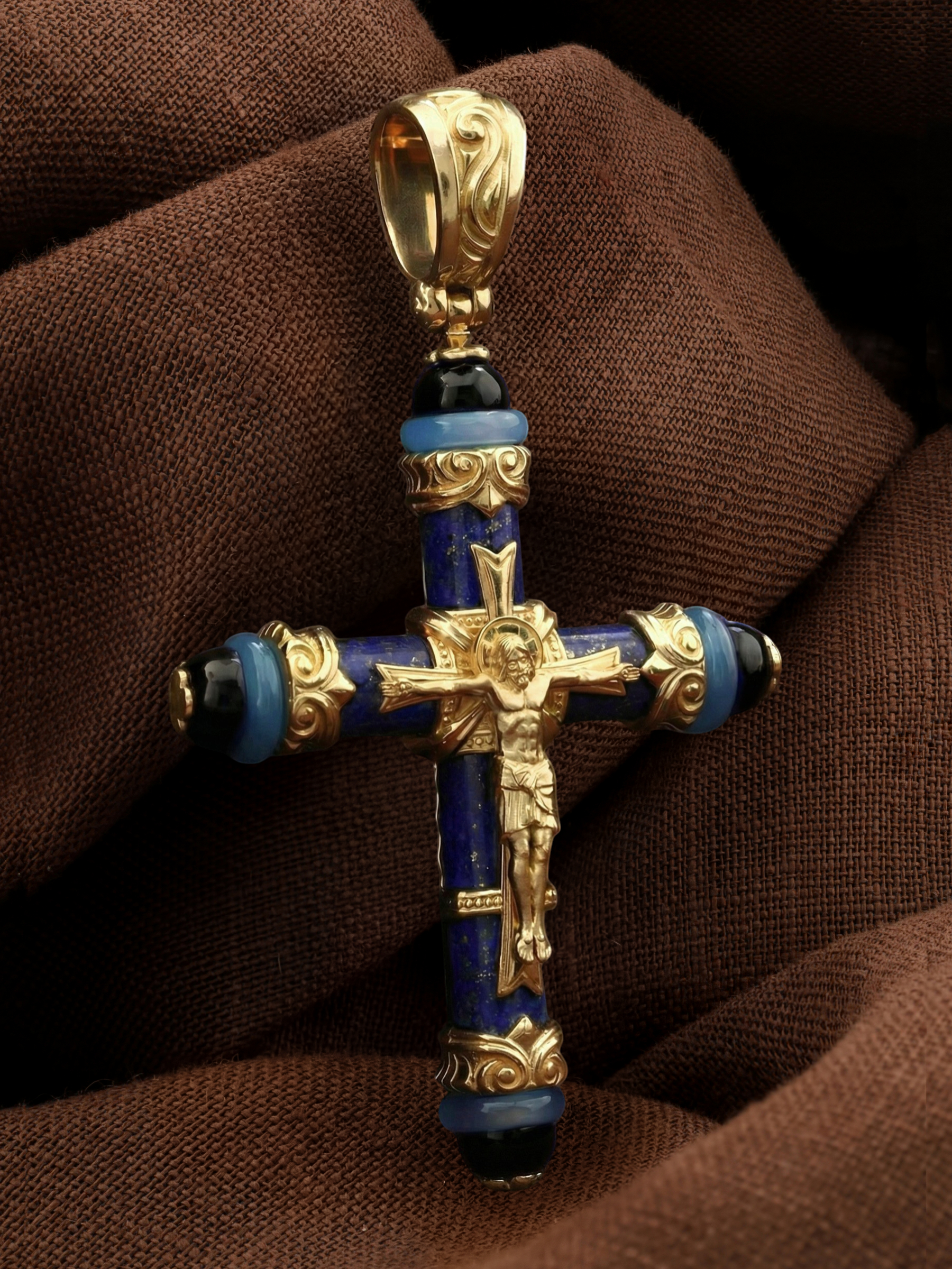 Крест из лимонного золота c ониксом, агатом и лазуритом