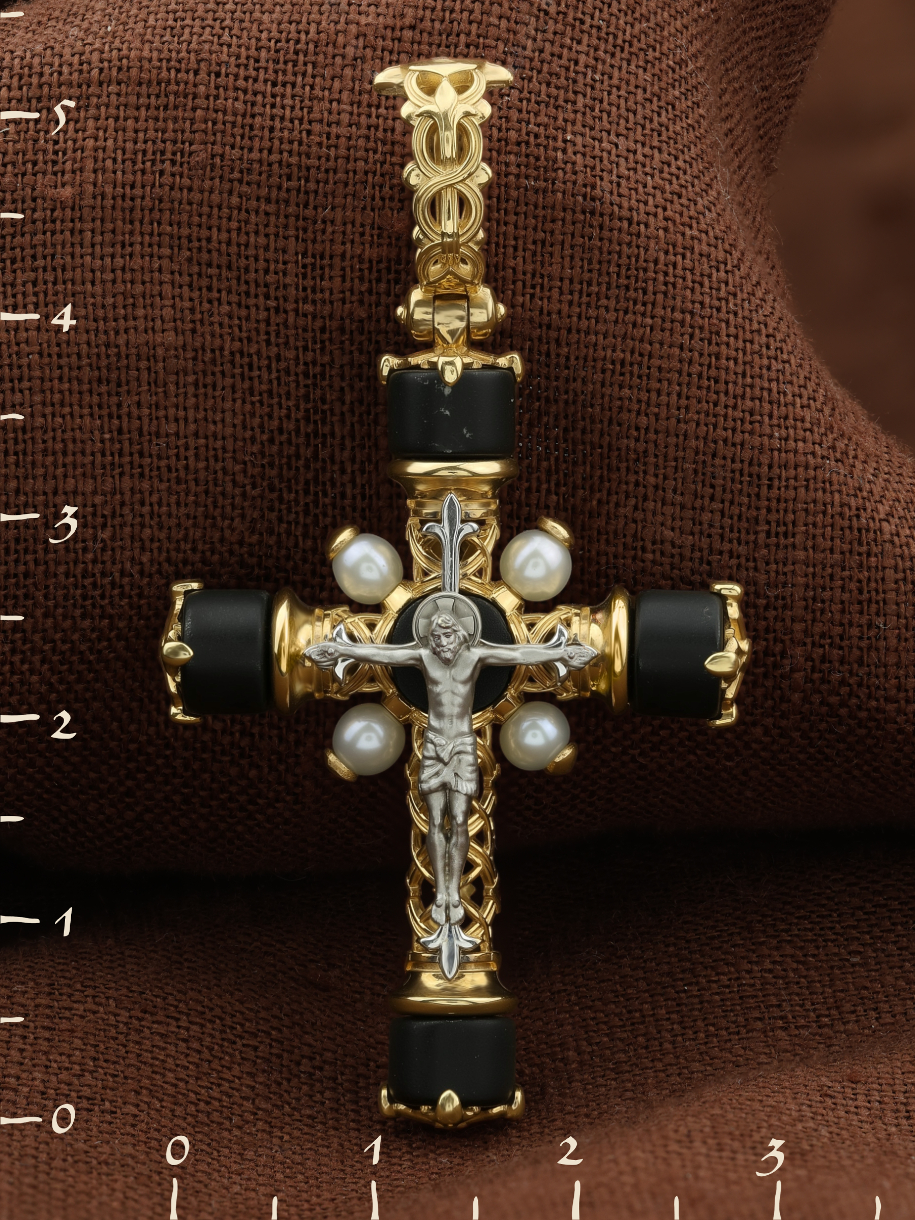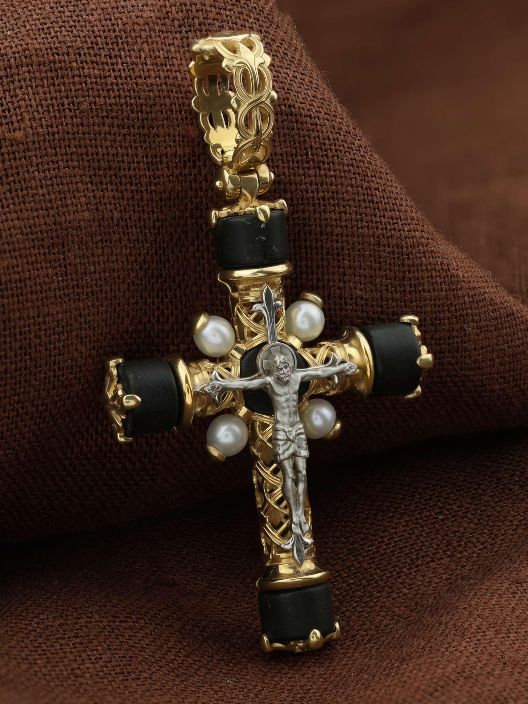 Крест из лимонного золота 585 пробы c жемчугом и ониксом