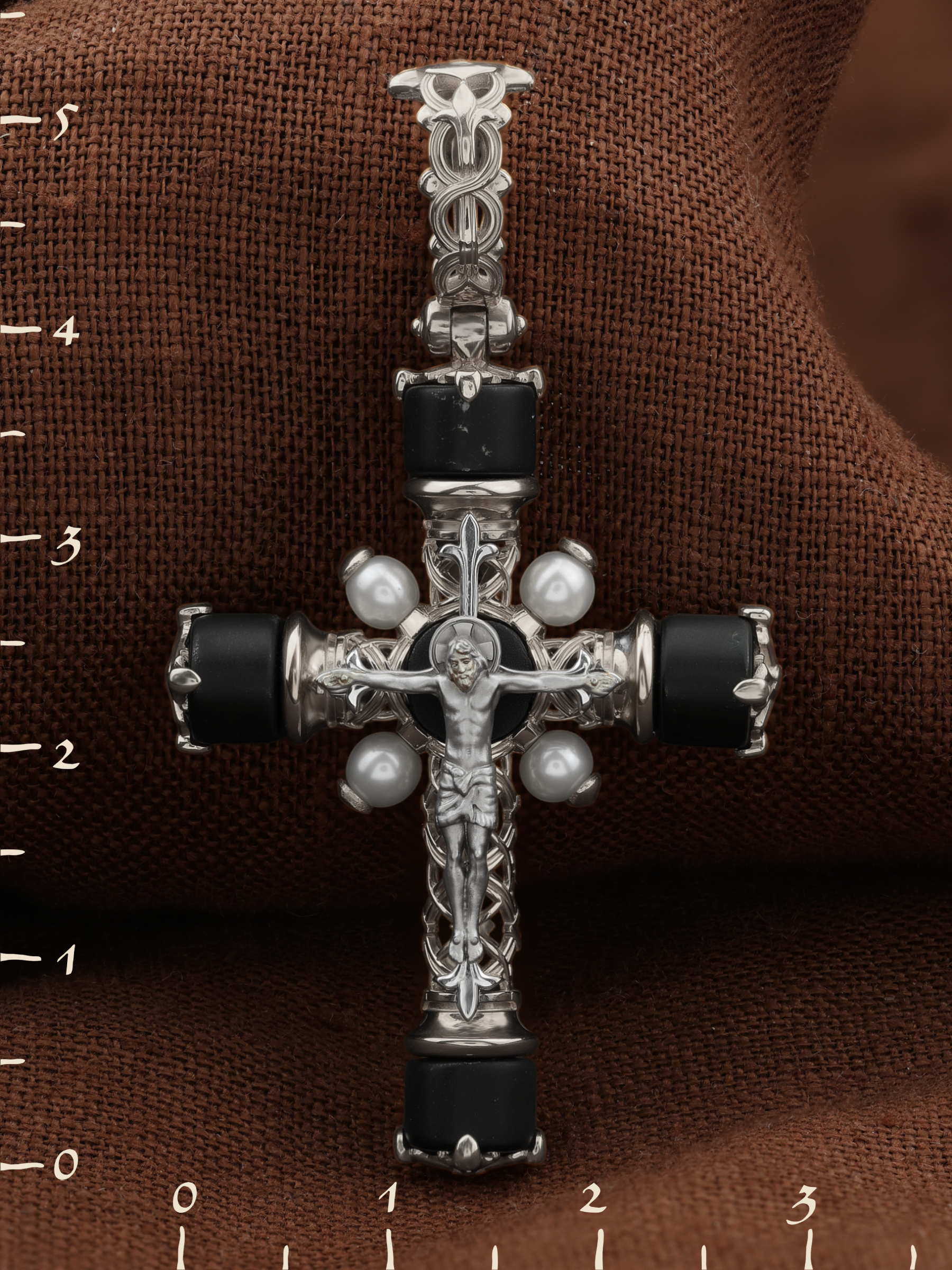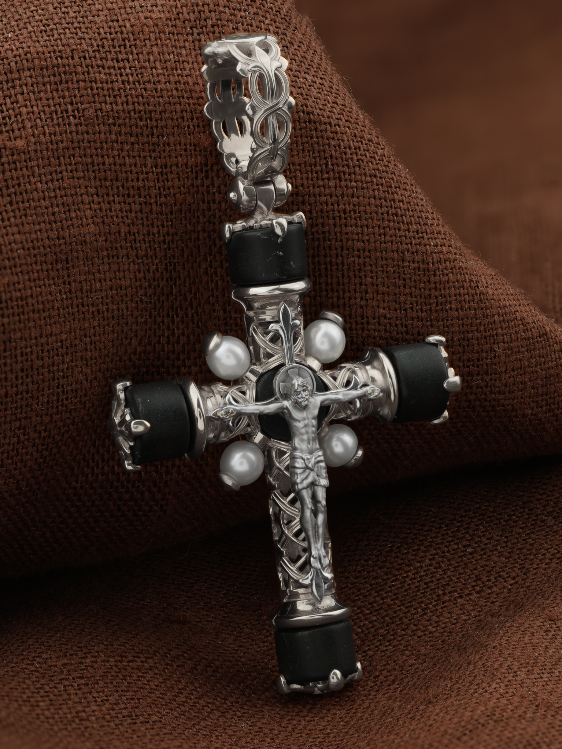 Крест из белого золота 585 пробы c жемчугом и ониксом