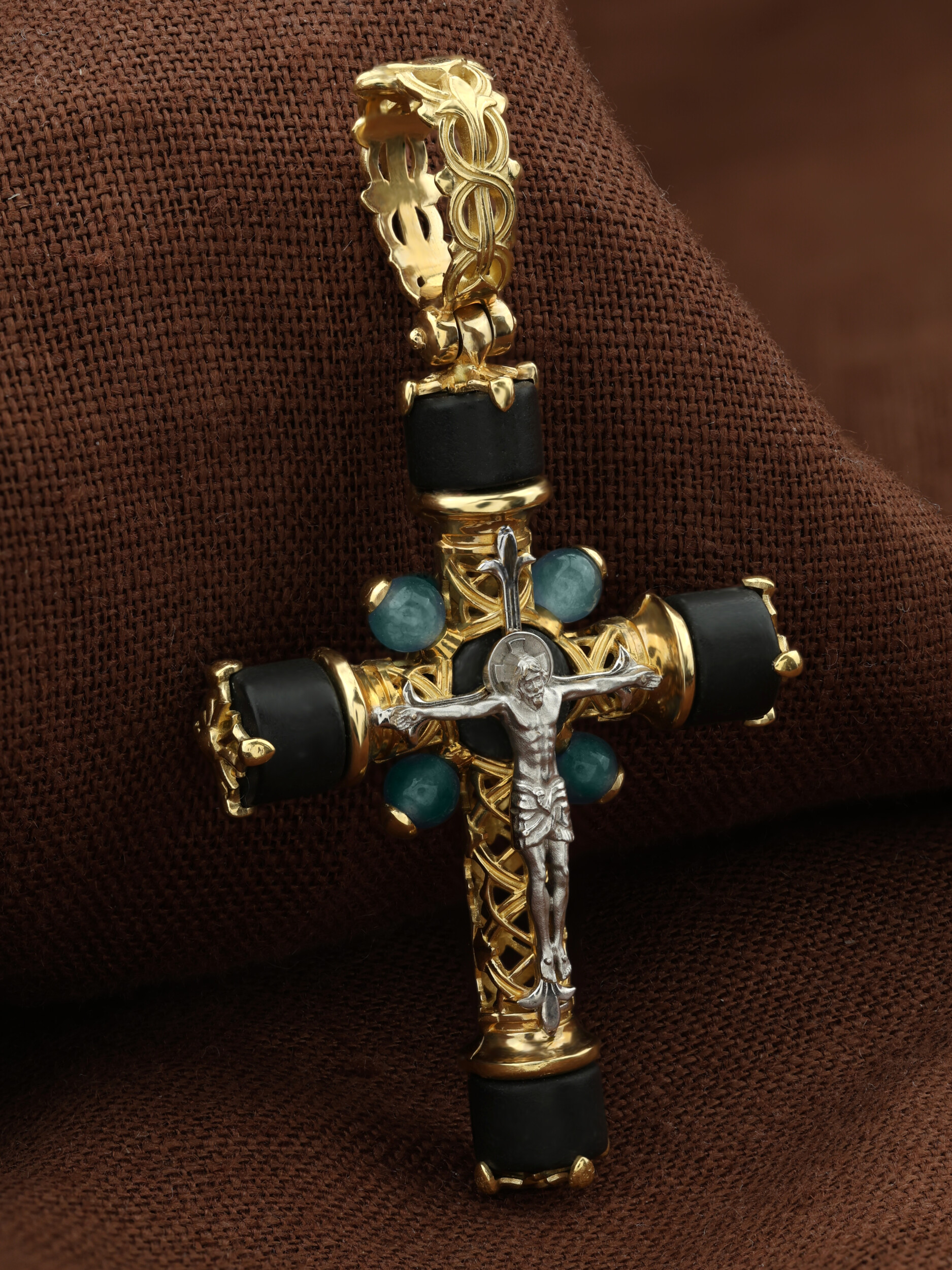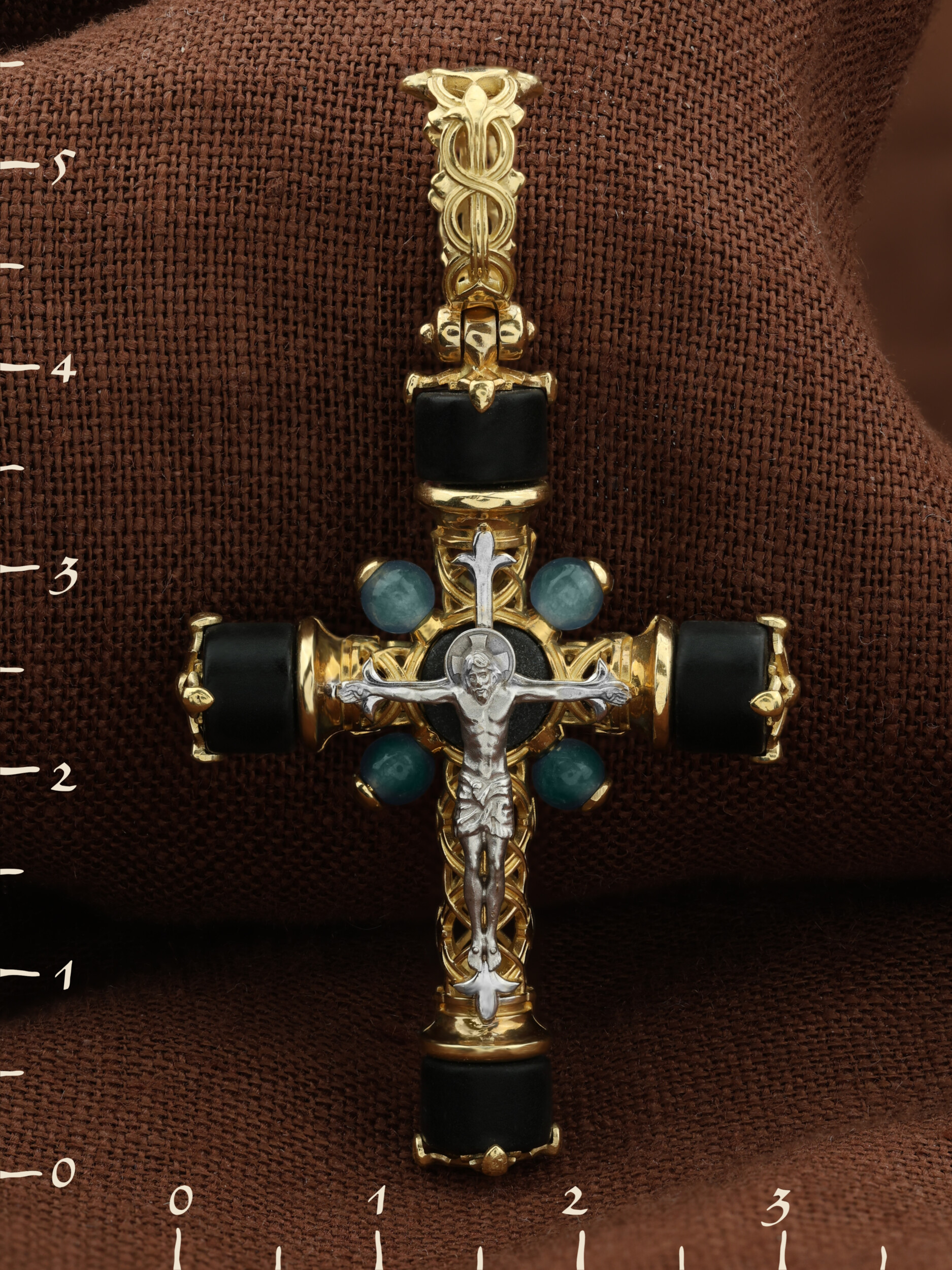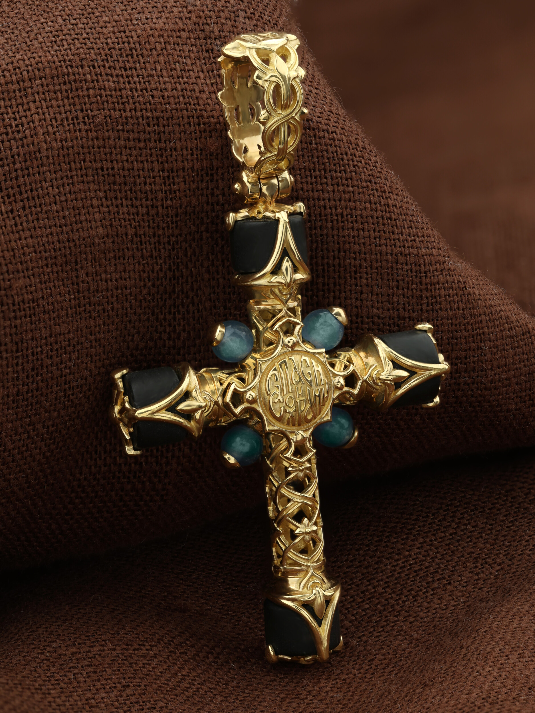 Крест из лимонного золота 585 пробы c ониксом и жадеитом