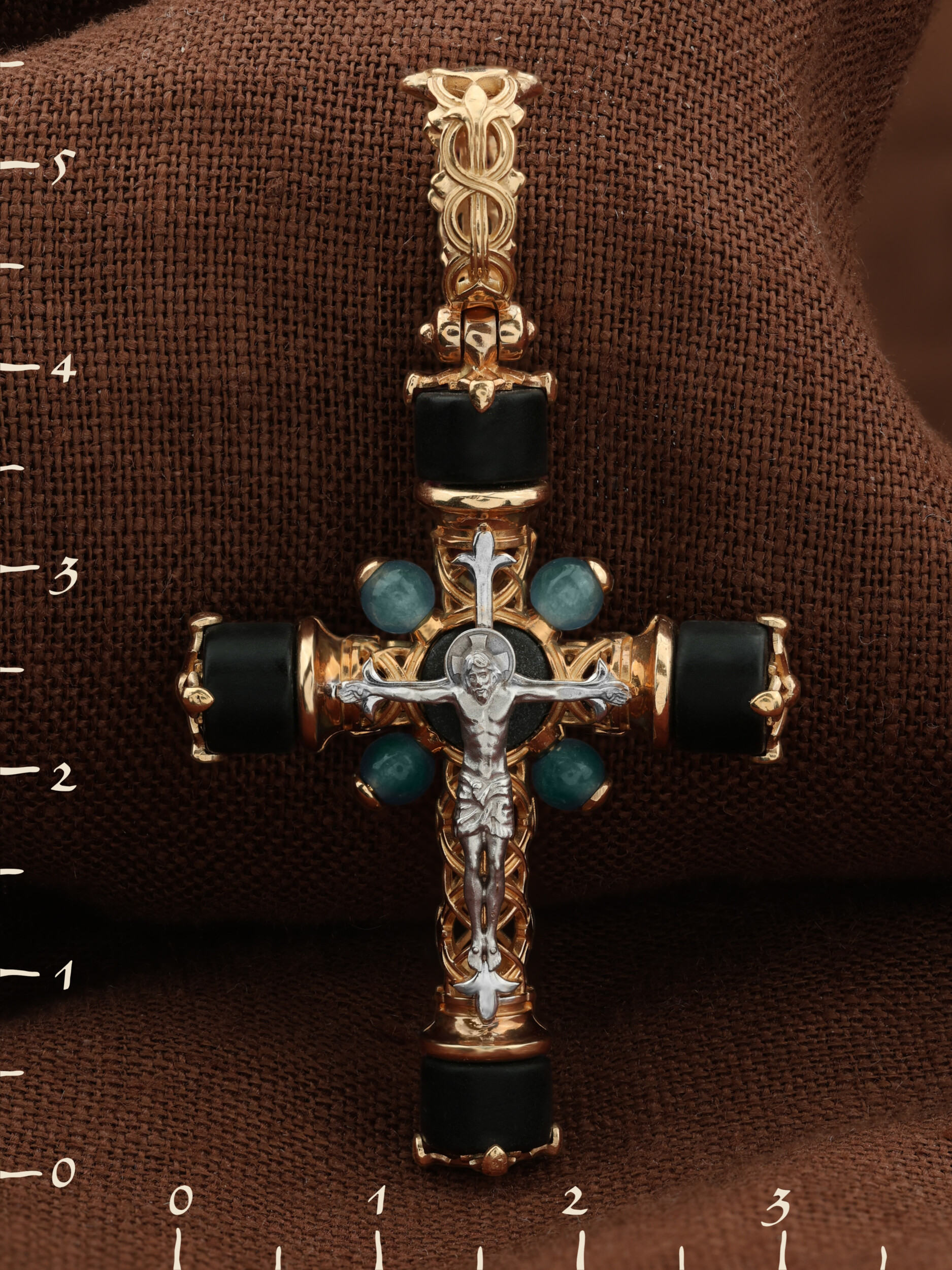 Крест из красного золота 585 пробы c ониксом и жадеитом