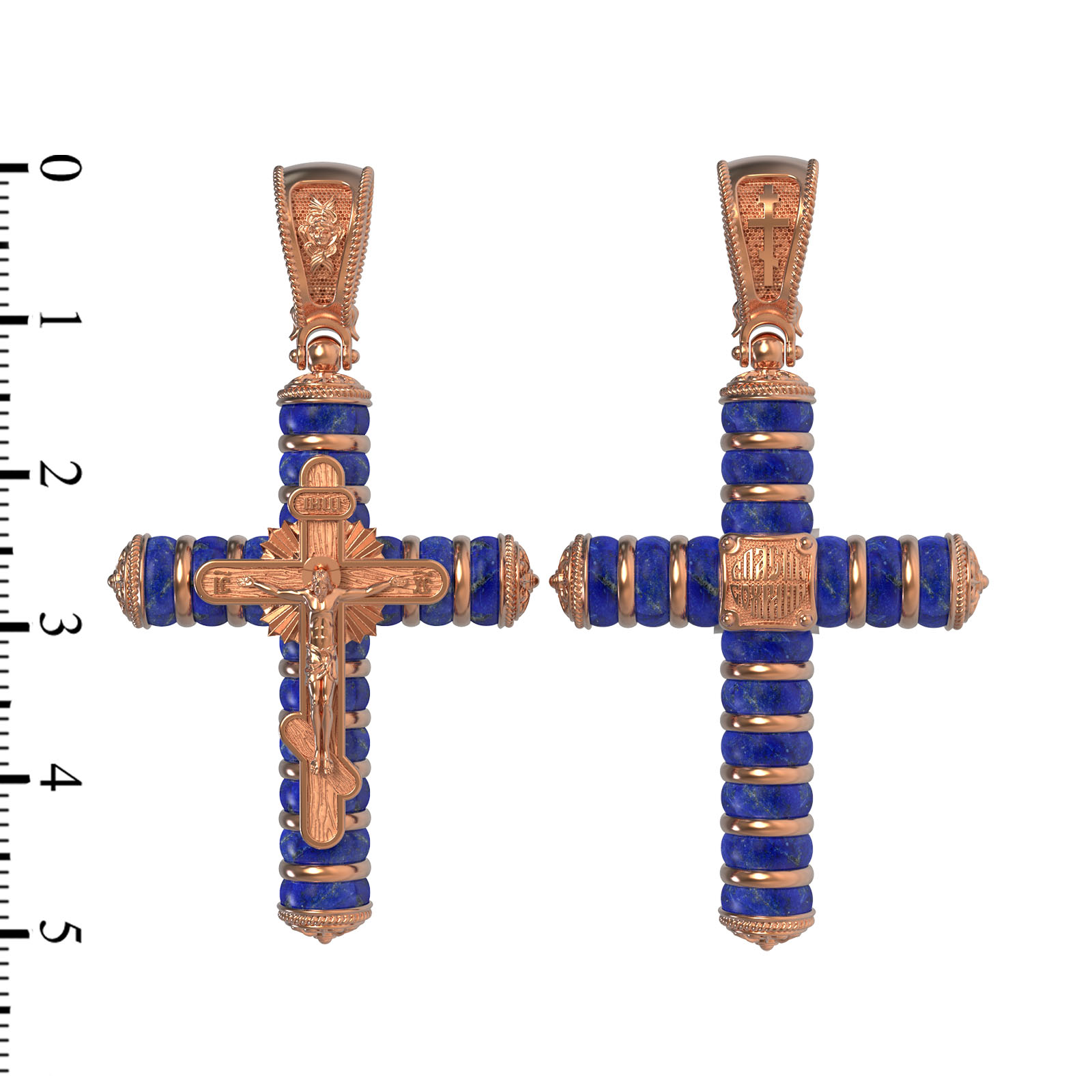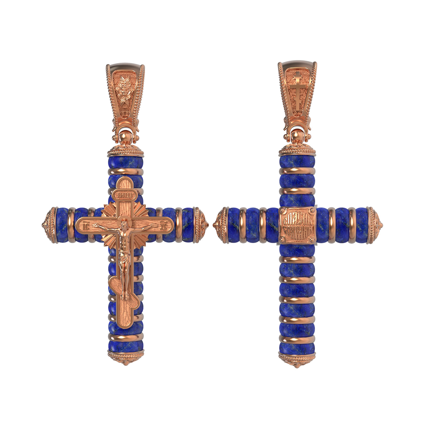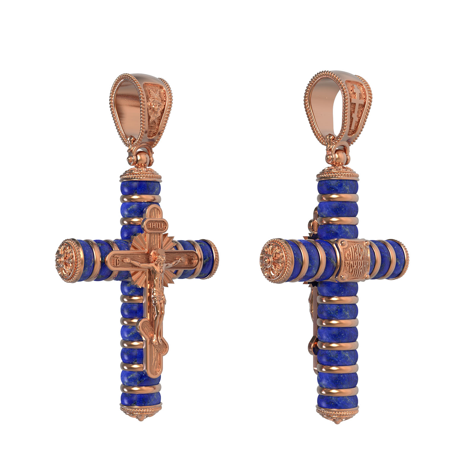 На лицевой стороне креста изображено Распятие Господа и Спасителя нашего Иисуса Христа. Своими крестными страданиями Господь смыл наши грехи, покрыл наш долг перед Богом или, на языке Писания, нас «искупил». В Голгофе сокрыта непостижимая тайна бесконечной правды и любви Бога. Крест стал символом победы добра над злом, жизни над смертью, напоминанием бесконечной Божьей любви, предметом радости. Воплотившийся Сын Божий Своею кровью освятил крест и сделал его проводником Своей благодати, источником освящения верующих. Господь сказал: кто хочет идти за Мною, отвергнись себя, и возьми крест свой, и следуй за Мною. (Мк. 8: 34). На верхней табличке, выше головы Иисуса, расположена надпись, составленная Понтием Пилатом — «IНЦI». Она означает «Иисус Назорей, Царь Иудейский». Надпись «IC» «ХC», означает Иисус Христос, помещается на разных сторонах поперечной перекладины креста. На православном кресте Христос не умирает, а свободно простирает руки, ладони Иисуса открыты, будто он хочет обнять все человечество, даря им свою любовь и открывая путь к вечной жизни. На кулонном кольце изображен шестикрылый Ангел Серафим.