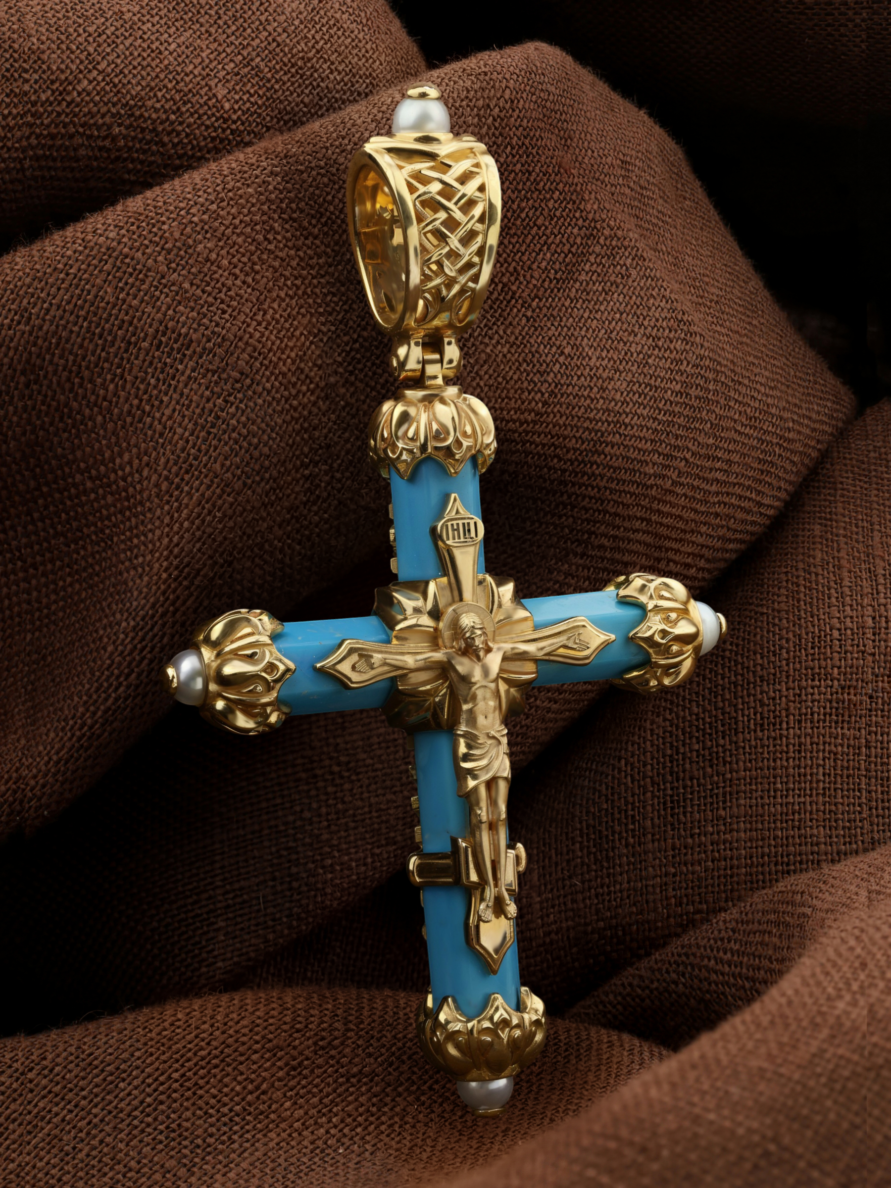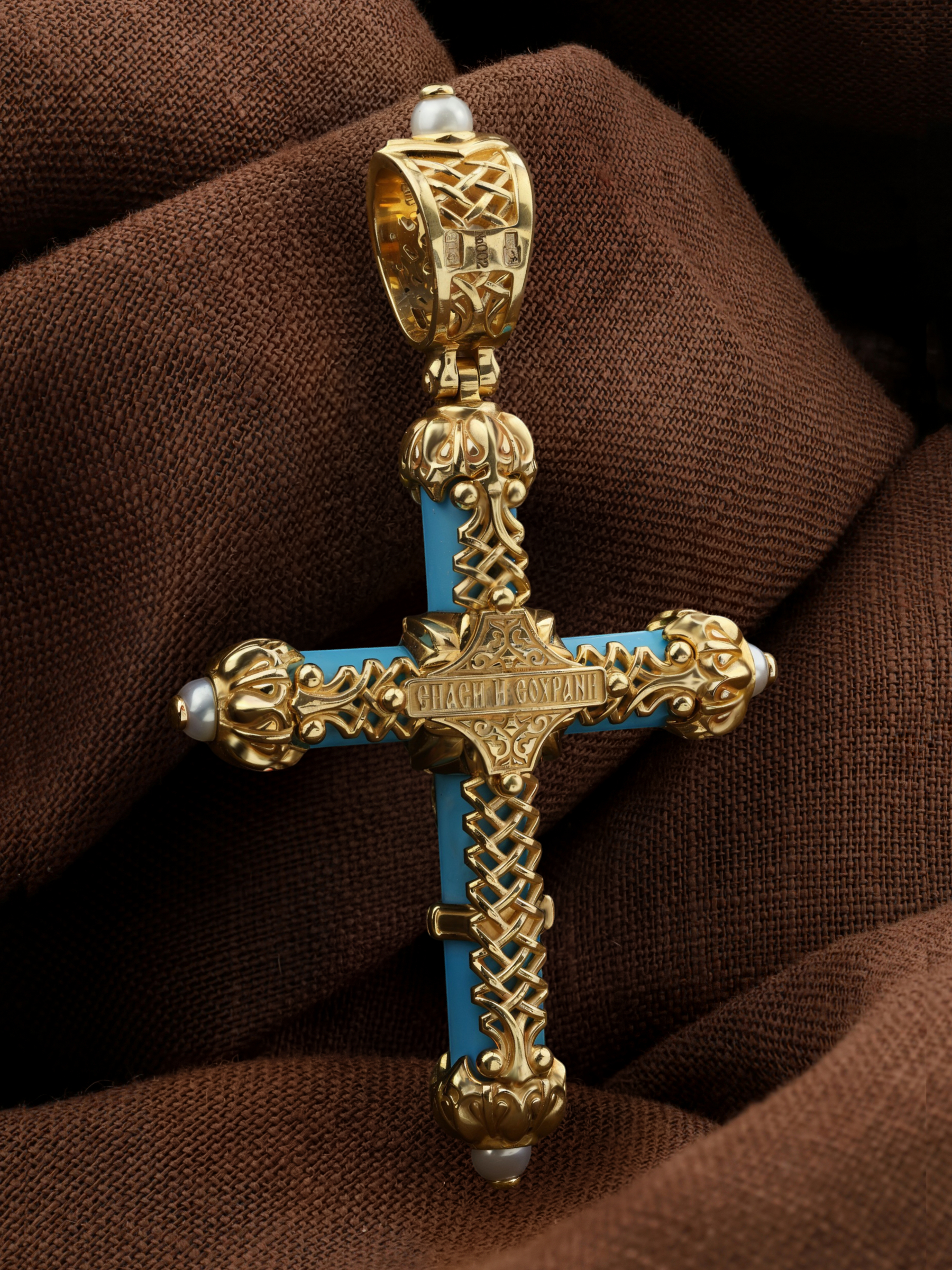 Крест из лимонного золота c жемчугом и бирюзой