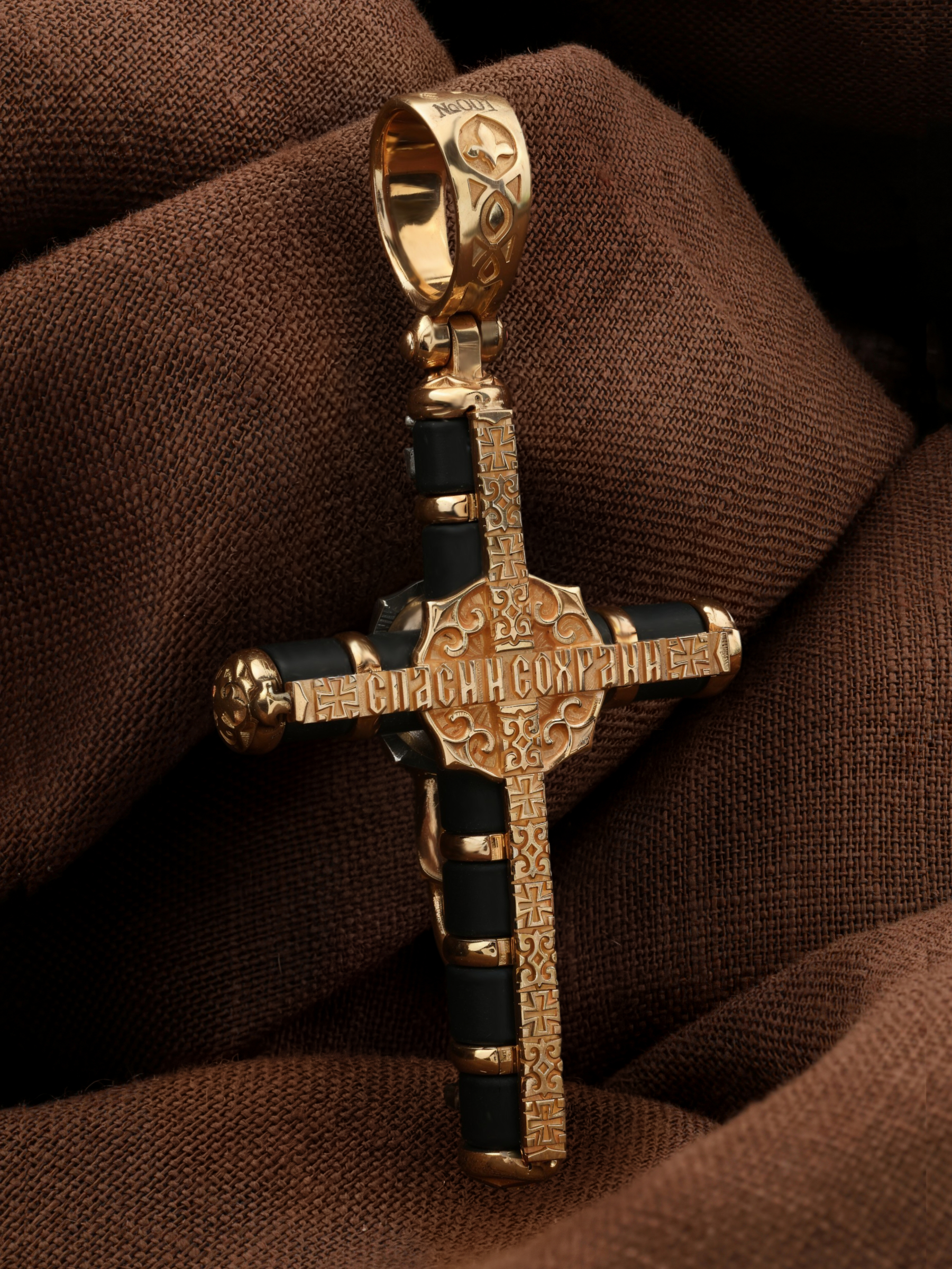 На оборотной стороне креста помещена молитва: «Спаси и сохрани». Крест украшен орнаментом.