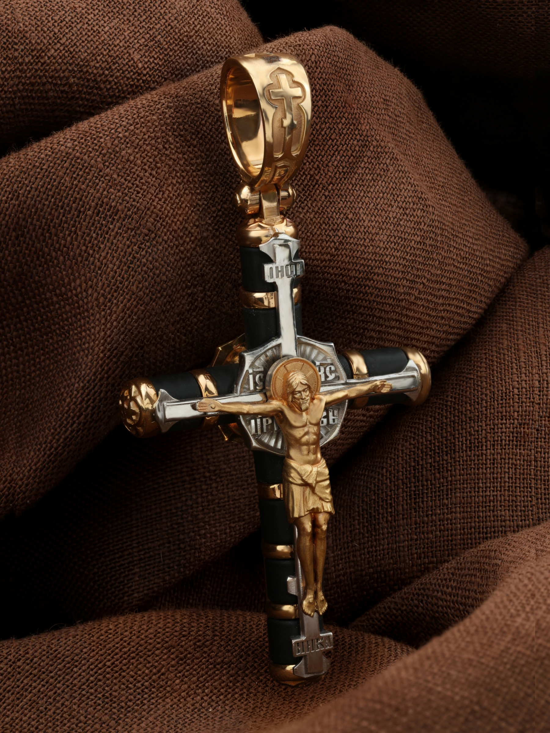 На лицевой стороне креста изображено Распятие Господа и Спасителя нашего Иисуса Христа, отдавшего Себя на смерть, для искупления грехов мира. Крест является символом жертвенной любви всеблагого Бога к падшим людям, всепобеждающим духовным оружием христиан, основанием и средоточием церковной жизни. Верхняя перекладина символизирует титло — табличку, на которой, согласно Евангелию, было начертано: Иисус Назорей Царь Иудейский (IНЦI). Надпись «IС» « ХС» означает Иисус Христос и размещена над поперечной перекладиной. Слева от Распятия изображена Пресвятая Богородица, справа — апостол и евангелист Иоанн Богослов, один из ближайших учеников Иисуса Христа. Возвышение, на котором стоит Крест, символизирует гору Голгофу, на которой произошло Распятие. Под подножием Креста изображена покоящаяся голова (череп) Адама. Под Распятием помещено изображение Духа Святого в виде голубя.