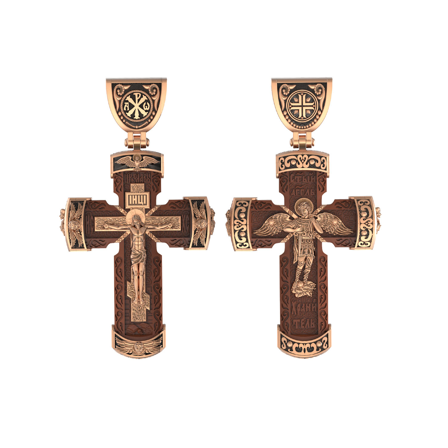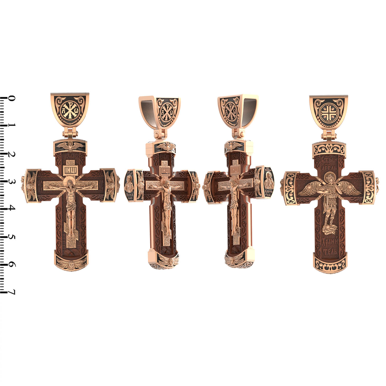 В центре оборота креста изображен Ангела Хранителя с традиционными атрибутами в руках: крестом, которым он осеняет человека, и мечом для прогнания бесов. По Православному учению, каждому, принявшему святое крещение, дается Господом Ангел Хранитель, который сопровождает человека всю его жизнь, помогая в добрых делах и охраняя от нападок злых духов. Святые отцы утверждают, что только верующий человек имеет рядом с собой Ангела Хранителя: «Тем, которые сподобились крещения и возносятся на высоту добродетелей, даны от Бога Ангелы, заботящиеся о них и содействующие им. В этом уверяет нас Господь, когда говорит, что есть Ангелы Хранители у всякого, кто верует в Него» (преп. Анастасий Синаит). Но Ангел Хранитель пребывает с христианином, если только мы не прогоним его греховными делами, поскольку «как дым разгоняет пчел, так и грех прогоняет от нас Ангела Хранителя» (свт. Василий Великий). Но и после завершения земного пути Ангел Хранитель не покидает христианина, а помогает душе преодолеть воздушные мытарства на пути в Царство Небесное.