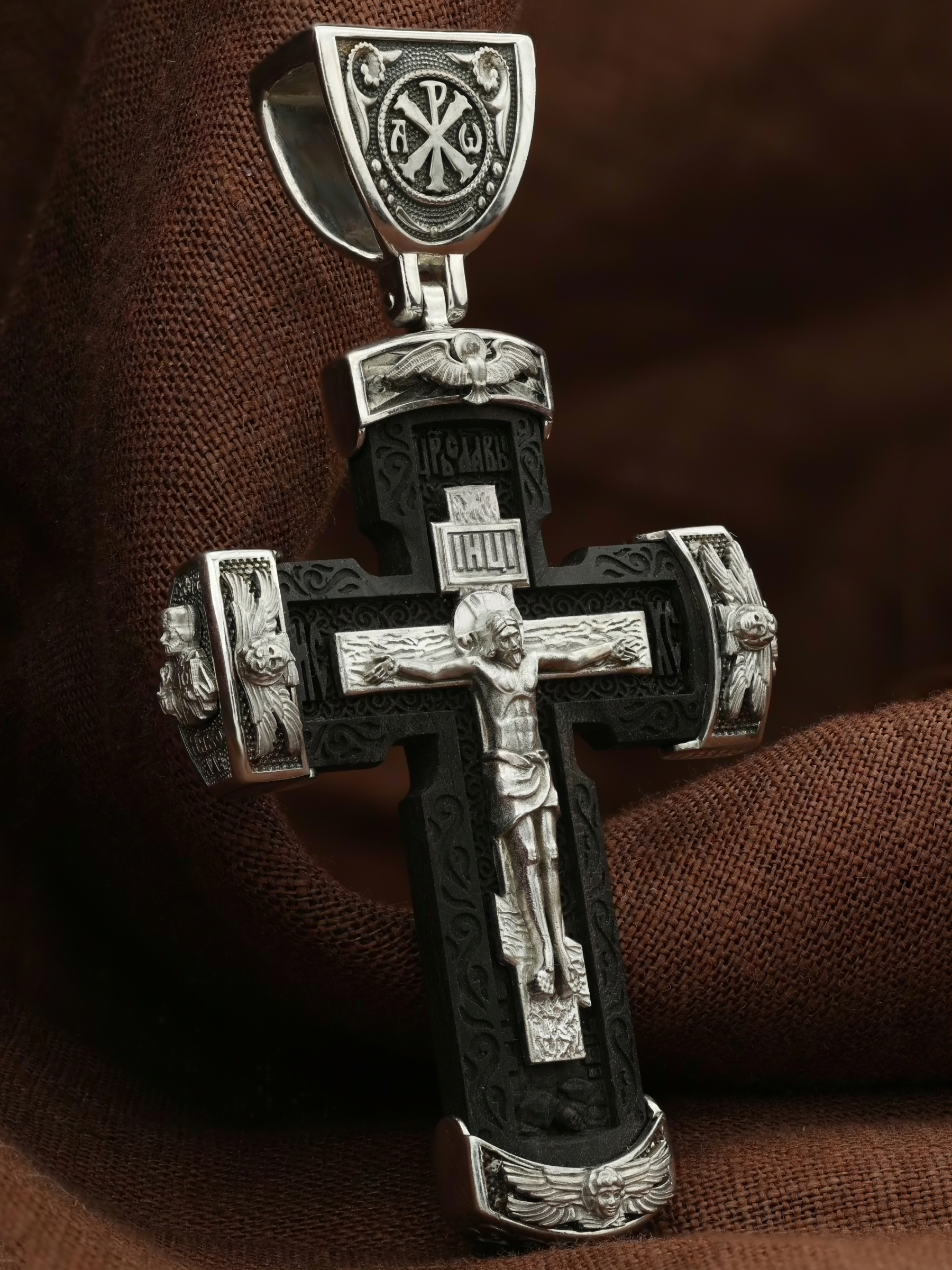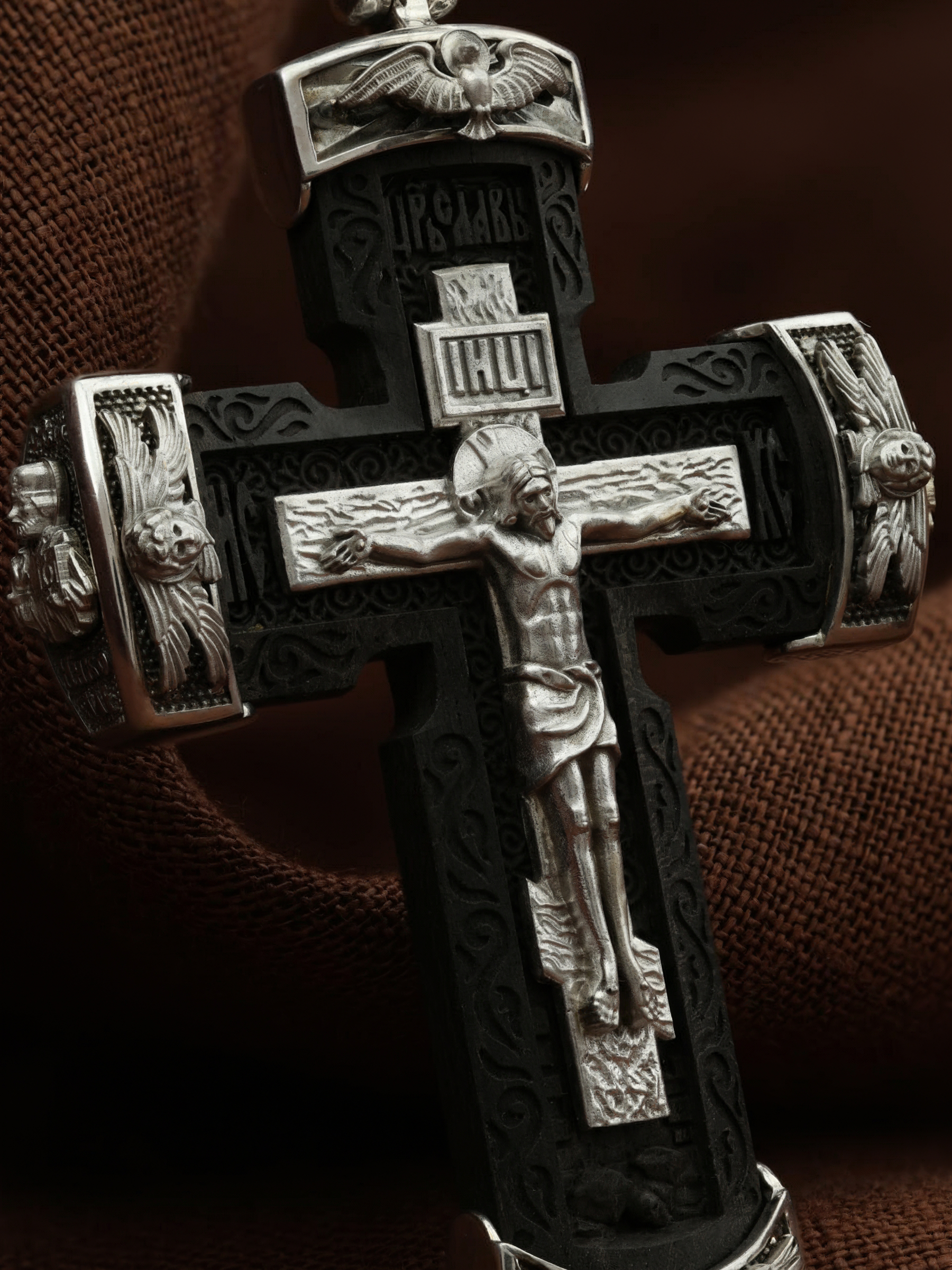 На лицевой стороне креста изображено Распятие, потому что это орудие казни Иисус Христос сделал орудием победы над грехом и смертью. Своими страданиями Он искупил грехи человечества, умерев и сошествовав во ад, победил сатану, освободил души праведников от вечной смерти и открыл им небесные врата рая. Жертва Христа сделала возможным спасение для каждого человека. На православном кресте Христос не умирает, а свободно простирает руки, ладони Иисуса открыты, будто он хочет обнять все человечество, даря им свою любовь и открывая путь к вечной жизни.