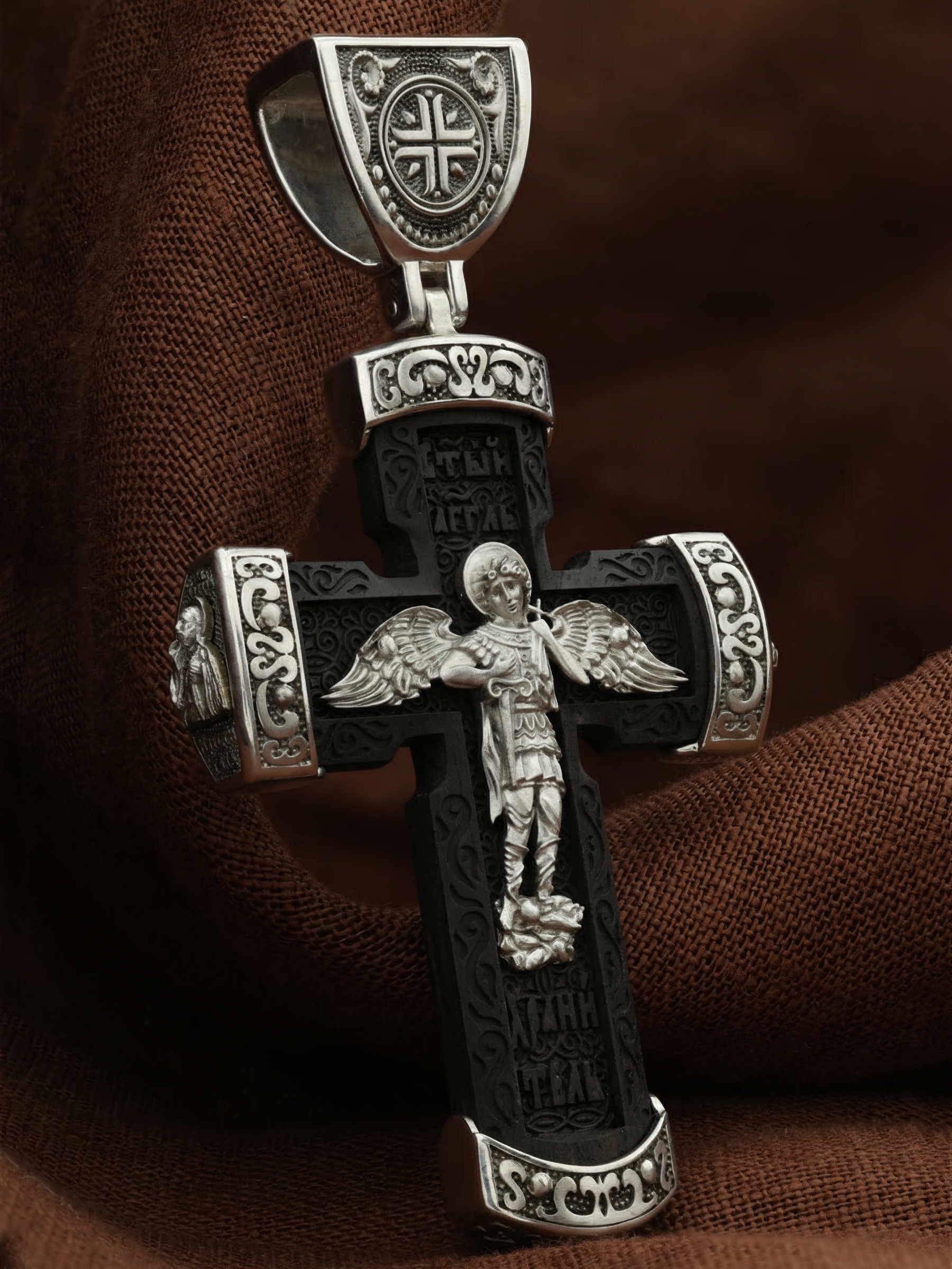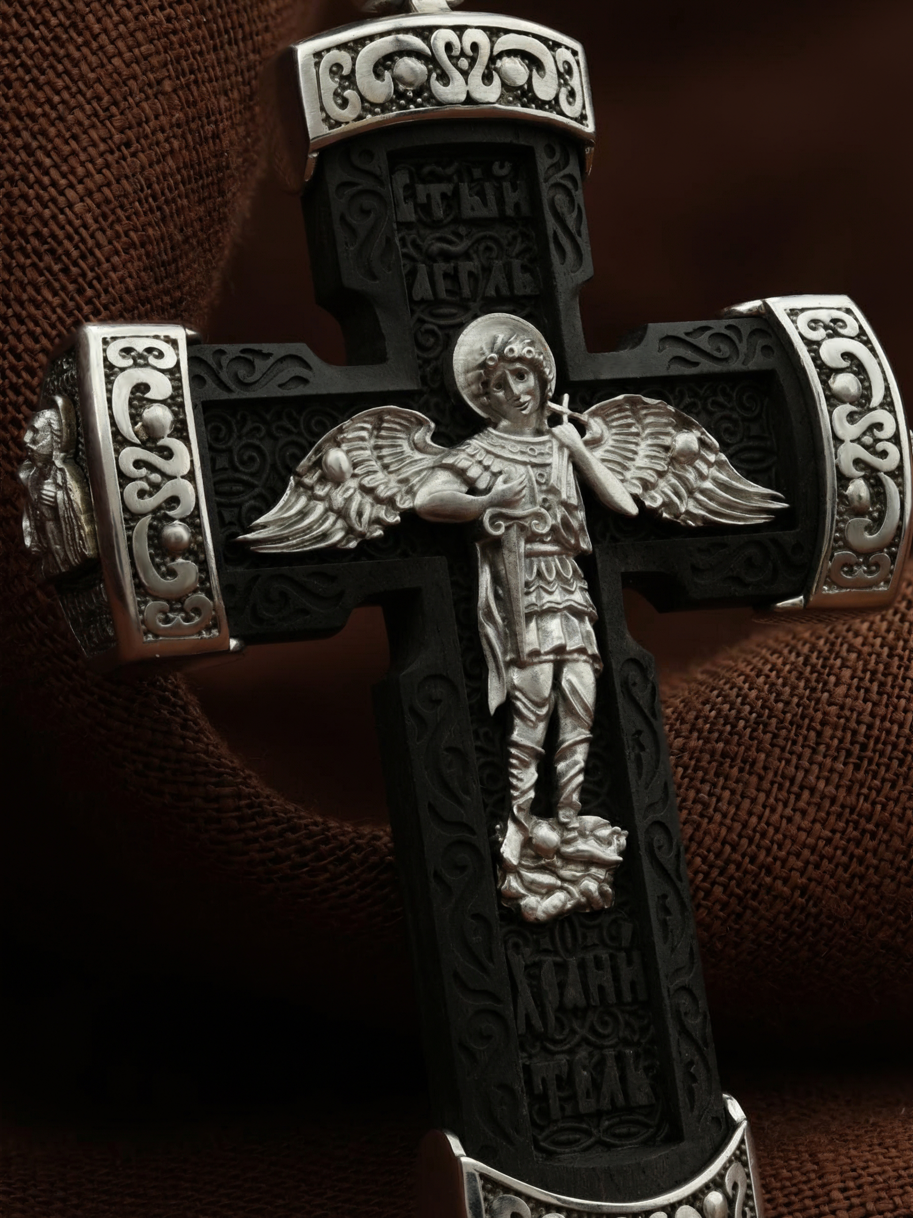В центре оборота креста изображен Ангела Хранителя с традиционными атрибутами в руках: крестом, которым он осеняет человека, и мечом для прогнания бесов. По Православному учению, каждому, принявшему святое крещение, дается Господом Ангел Хранитель, который сопровождает человека всю его жизнь, помогая в добрых делах и охраняя от нападок злых духов. Святые отцы утверждают, что только верующий человек имеет рядом с собой Ангела Хранителя: «Тем, которые сподобились крещения и возносятся на высоту добродетелей, даны от Бога Ангелы, заботящиеся о них и содействующие им. В этом уверяет нас Господь, когда говорит, что есть Ангелы Хранители у всякого, кто верует в Него» (преп. Анастасий Синаит). Но Ангел Хранитель пребывает с христианином, если только мы не прогоним его греховными делами, поскольку «как дым разгоняет пчел, так и грех прогоняет от нас Ангела Хранителя» (свт. Василий Великий). Но и после завершения земного пути Ангел Хранитель не покидает христианина, а помогает душе преодолеть воздушные мытарства на пути в Царство Небесное.