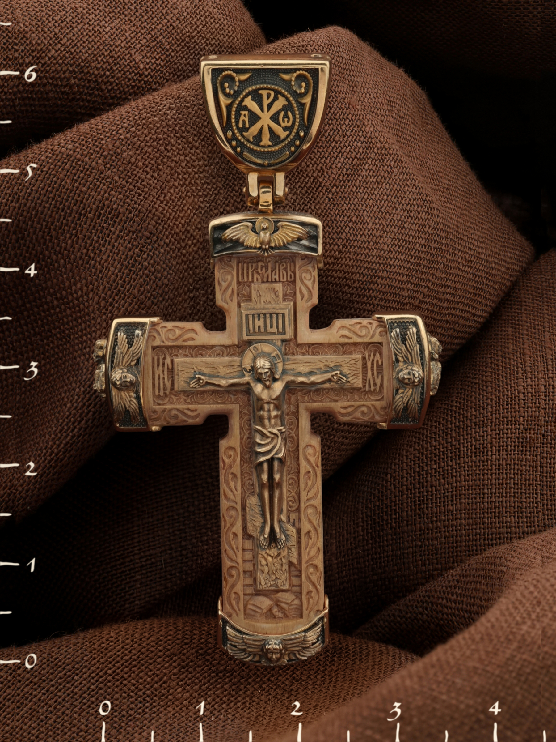 Над Распятием изображен парящий голубь — символ Святого Духа и Его благодати.