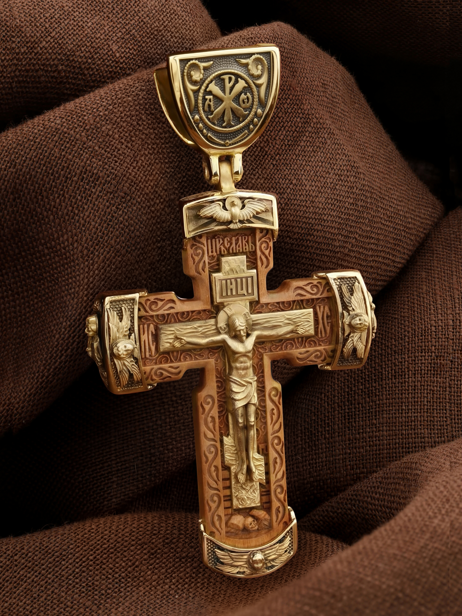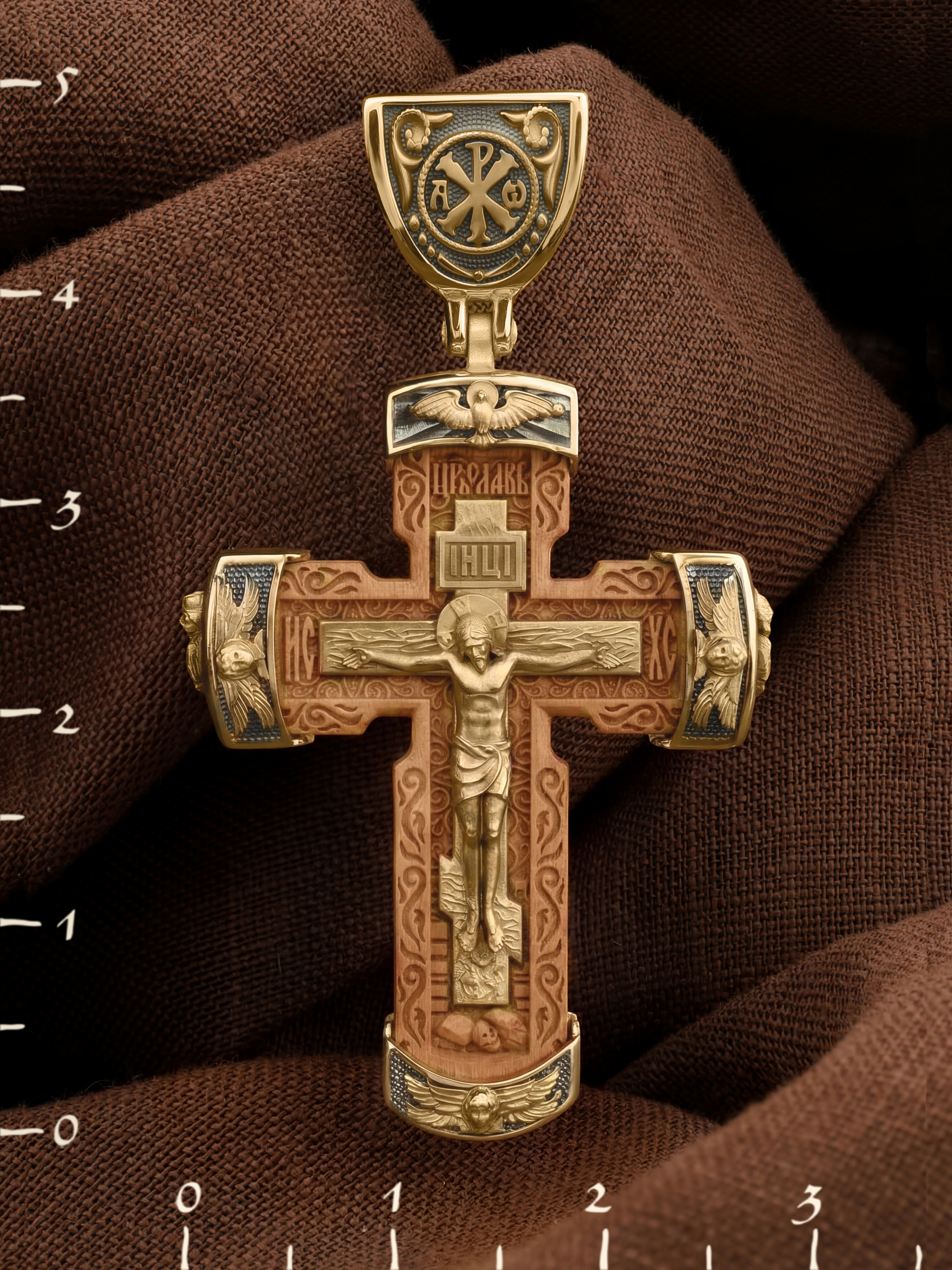 Над Распятием изображен парящий голубь — символ Святого Духа и Его благодати.