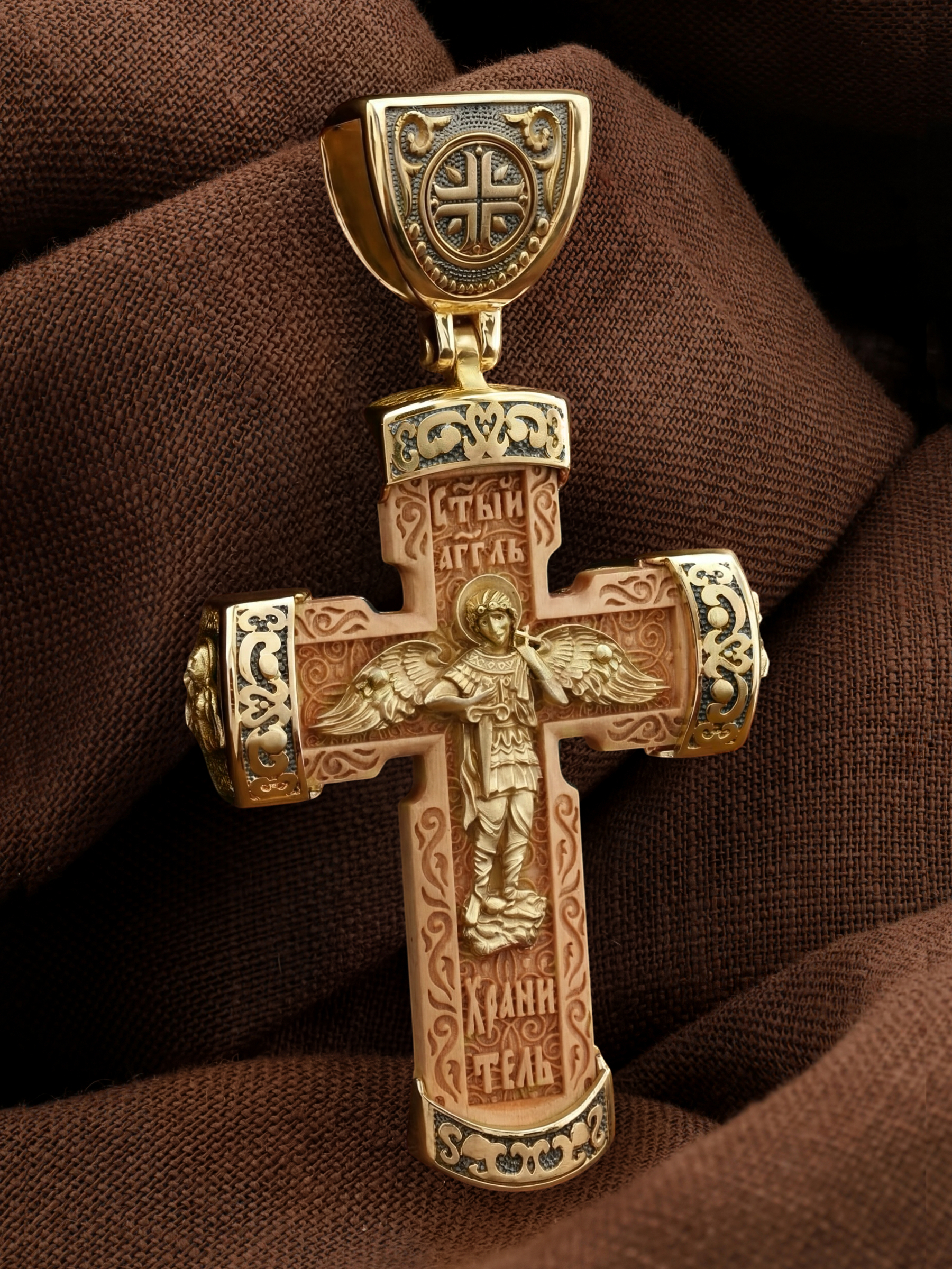 В центре оборота креста изображен Ангела Хранителя с традиционными атрибутами в руках: крестом, которым он осеняет человека, и мечом для прогнания бесов. По Православному учению, каждому, принявшему святое крещение, дается Господом Ангел Хранитель, который сопровождает человека всю его жизнь, помогая в добрых делах и охраняя от нападок злых духов. Святые отцы утверждают, что только верующий человек имеет рядом с собой Ангела Хранителя: «Тем, которые сподобились крещения и возносятся на высоту добродетелей, даны от Бога Ангелы, заботящиеся о них и содействующие им. В этом уверяет нас Господь, когда говорит, что есть Ангелы Хранители у всякого, кто верует в Него» (преп. Анастасий Синаит). Но Ангел Хранитель пребывает с христианином, если только мы не прогоним его греховными делами, поскольку «как дым разгоняет пчел, так и грех прогоняет от нас Ангела Хранителя» (свт. Василий Великий). Но и после завершения земного пути Ангел Хранитель не покидает христианина, а помогает душе преодолеть воздушные мытарства на пути в Царство Небесное.