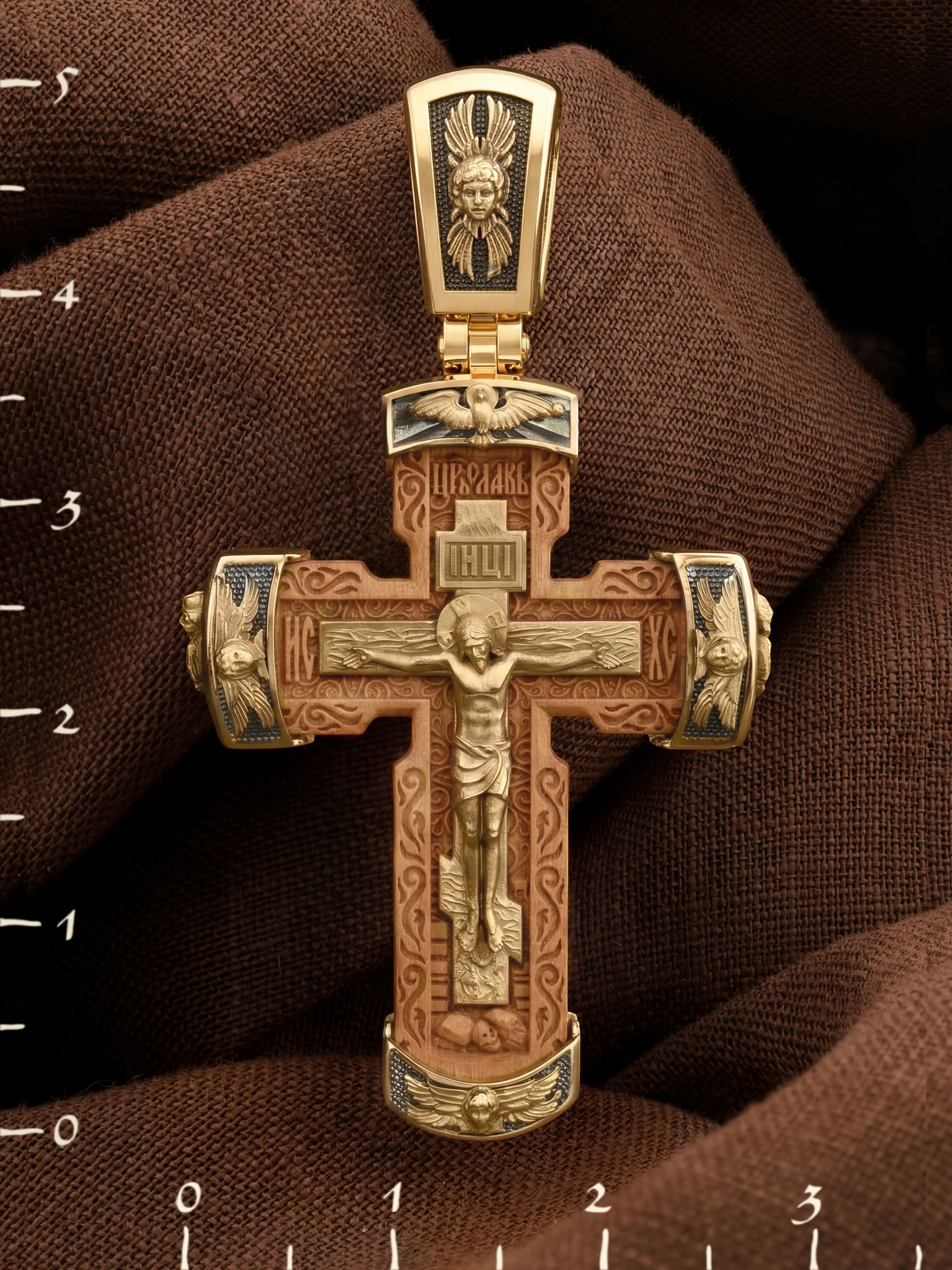 На лицевой стороне креста изображено Распятие, потому что это орудие казни Иисус Христос сделал орудием победы над грехом и смертью. Своими страданиями Он искупил грехи человечества, умерев и сошествовав во ад, победил сатану, освободил души праведников от вечной смерти и открыл им небесные врата рая. Жертва Христа сделала возможным спасение для каждого человека. На православном кресте Христос не умирает, а свободно простирает руки, ладони Иисуса открыты, будто он хочет обнять все человечество, даря им свою любовь и открывая путь к вечной жизни.