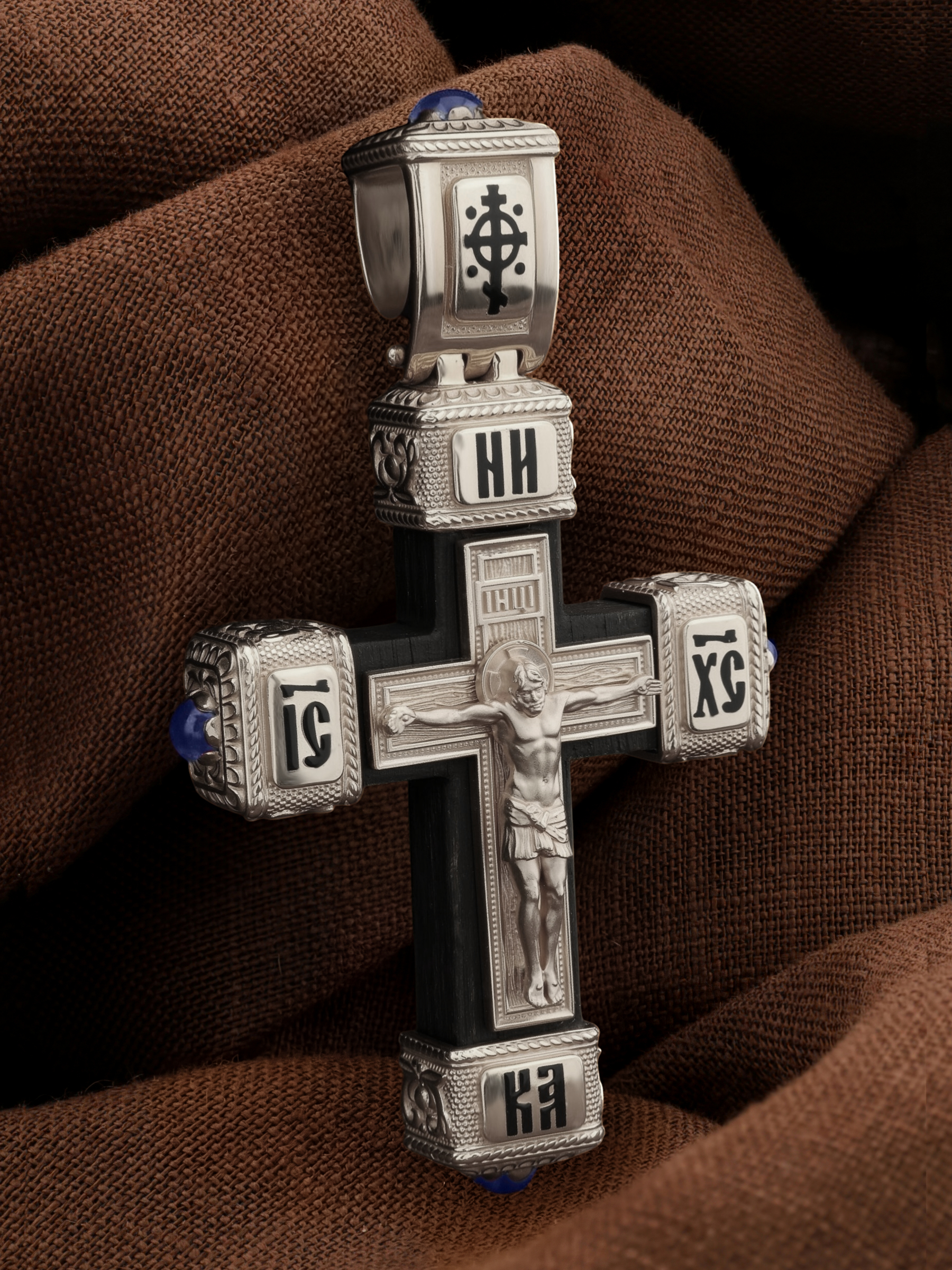 Крест из белого золота c эмалью, сапфиром и эбеновым деревом