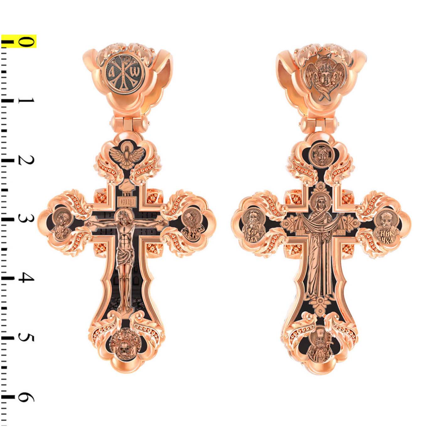 На лицевой стороне креста изображено Распятие Господа и Спасителя нашего Иисуса Христа. Крест- символ спасения и искупления рода человеческого, знамение победы над смертью и адом. Иисус Христос, как искупительная жертва освобождения человечества от власти греха, умер крестной смертью и в третий день воскрес. На верхней табличке, выше головы Иисуса, расположена надпись, составленная Понтием Пилатом — «ИНЦИ». Она означает «Иисус Назорей, Царь Иудейский». Над перекладиной написано сокращенно имя Спасителя «IC» «XC» — Иисус Христос. Ниже перекладины написано слово «НИКА» (греч. — Победитель). Крест стоит на горе камней, символизирующих Голгофу. В ее основании различается череп и надписи «Г.А.» — это голова Адама. Слева от Распятия помещен лик Пречистой Богородицы, скорой помощницы и заступницы рода Христианского. Слева изображен апостол и евангелист Иоанн Богослов, один из ближайших учеников Иисуса Христа. Над Распятием — изображение Духа Святого в виде голубя, сходящего с Небес. На кулонном кольце помещен крест.
