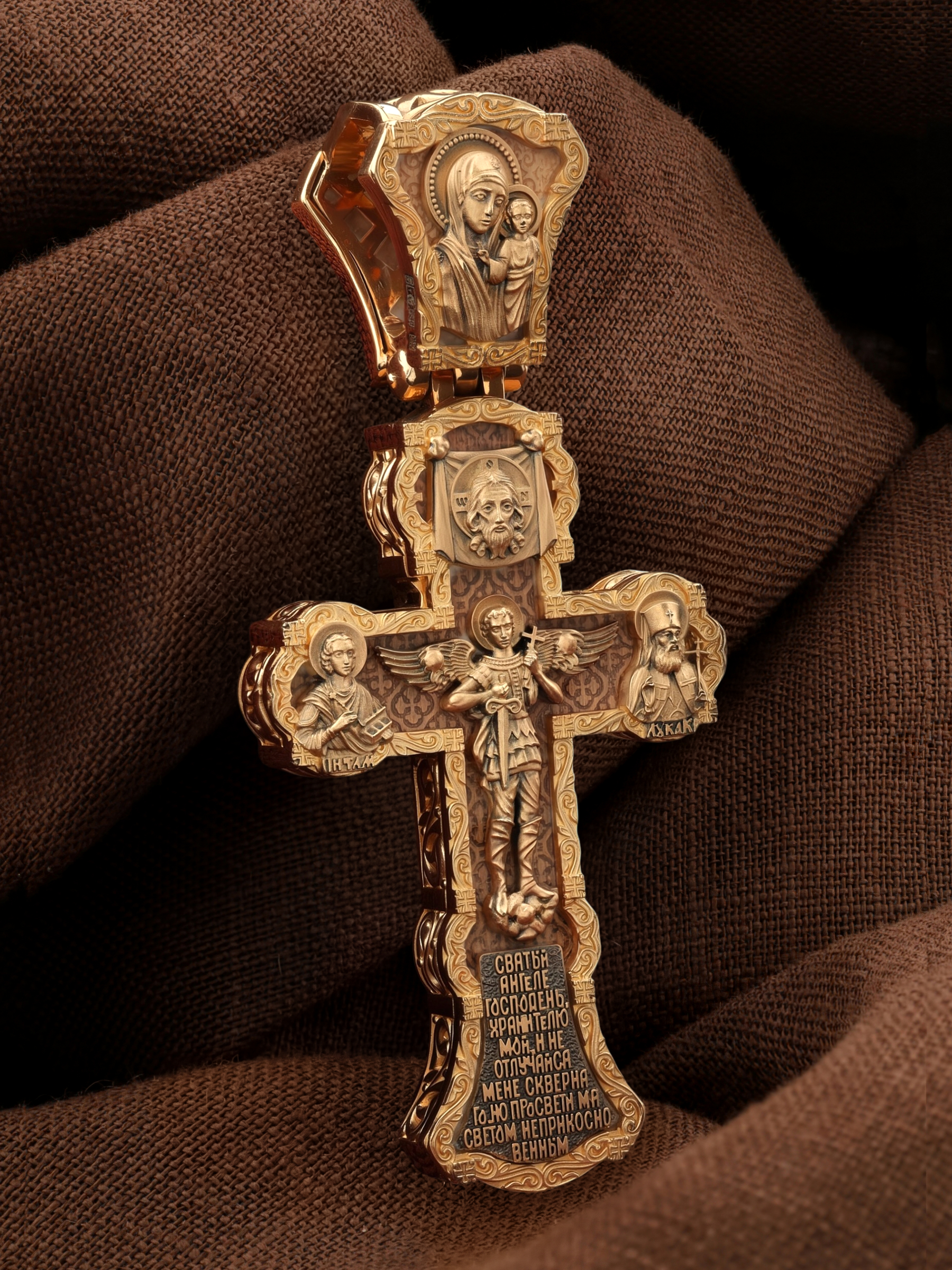 На центральной части оборотной стороны креста изображен Святой Ангел-Хранитель в виде прекрасного юноши держащего в правой руке крест, а в левой — мечь. Ангел-Хранитель — это Ангел приставляемый Богом к человеку при крещении для охраны и помощи в добрых делах. Невидимо пребывая при нас постоянно, он, руководствуя нас ко спасению, не только по нашему желанию таинственно наставляет нас на все доброе и полезное, не только возносит наши молитвы к Богу, но еще и сам от себя охраняют и защищают нас от врагов видимых и невидимых и ходатайствует за нас пред Богом. Ниже образа написана молитва: «Святый Ангеле Господень, Хранитель мой, не отлучайся мене скверного, но просвети мя светом неприкосновенным.» Выше образа изображен Спас Нерукотворный — образ Господа и Спасителя нашего Иисуса Христа, чудесно отпечатавшийся на плате, котором Христос вытер свой лик. Слева — Свя¬той ве¬ли¬ко¬му¬че¬ник и це¬ли¬тель Пан¬те-ле¬и¬мон. Господь даровал удивительную силу его молитве. Ею он исцелял любые болезни, воскрешал мертвых. Справа — Святитель Лука (Войно-Ясенецкий). На кулонном кольце изображена Казанская икона Божией Матери — одна из самых любимых на Руси.