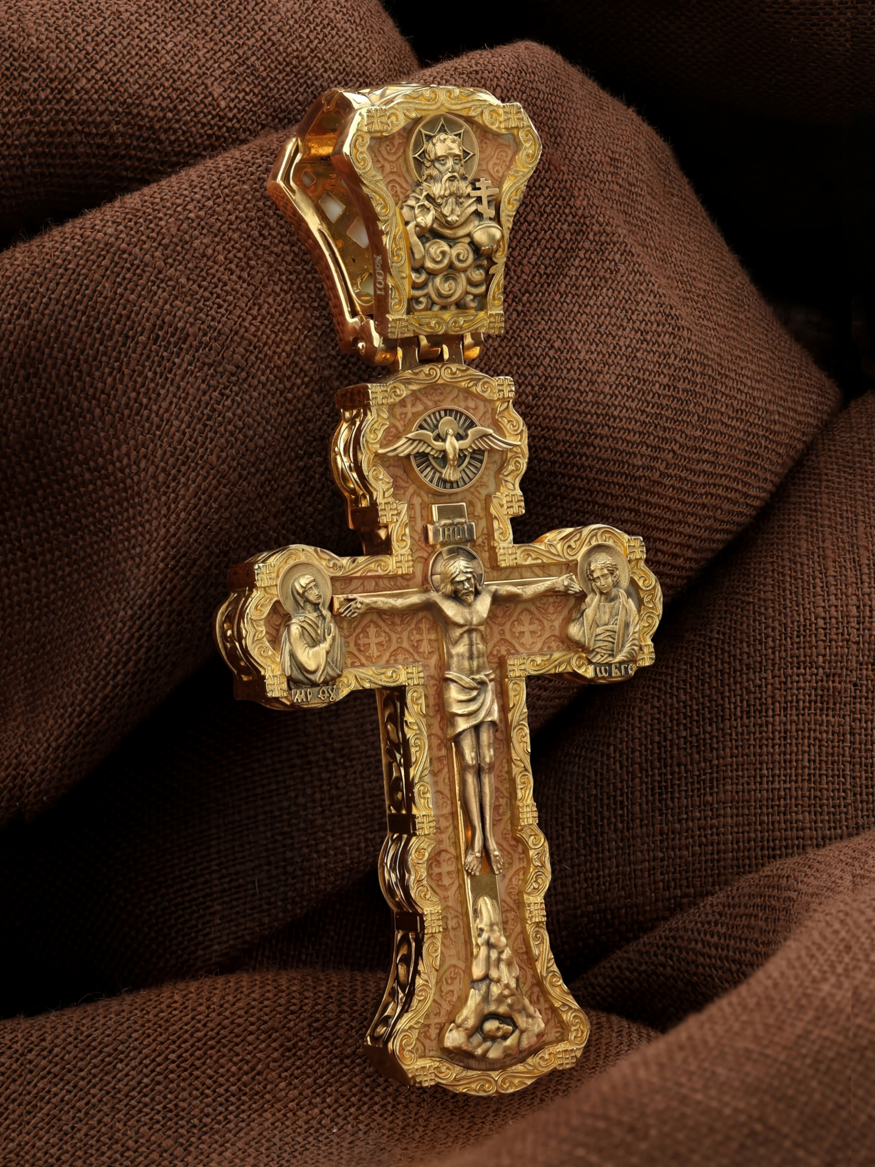 На лицевой стороне креста изображено Распятие Господа и Спасителя нашего Иисуса Христа. Христос, подвергнутый на кресте мучительной казни, своими страданиями искупил нас от древнего греха и даровал нам жизнь вечную. Без Распятия не было бы Воскресения Христова, и поэтому Крест из орудия казни обратился в святыню, в которой действует Благодать Божия. Через крестную жертву Бог раскрывает нам Свою безмерную любовь и призывает к ответной любви. На верхней табличке, выше головы Иисуса, расположена надпись, составленная Понтием Пилатом на трех языках — «IНЦI». Она означает «Иисус Назорей, Царь Иудейский». Надпись «IС ХС» означает Иисус Христос и помещается на разных сторонах поперечной (большой) перекладины креста. Крест стоит на горе камней, символизирующих Голгофу. В ее основании различается череп– это голова Адама. У Креста стоят оплакивающие Господа Божия Матерь и апостол Иоанн Богослов. Из всех апостолов об одном лишь Иоанне Богослове говорится, что он стоял на Голгофе у креста Спасителя, не заботясь о собственной безопасности. Он услышал обращенные к Ней с высоты Креста слова Распятого Господа: «Жено, се сын Твой» и к нему: «Се Мати твоя». С этого времени Иоанн взял Матерь Божию к себе, и Она жила в его доме до самой смерти. Над Распятием — изображение Духа Святого в виде голубя, сходящего с Небес. На кулонном кольце изображен Бог Отец.