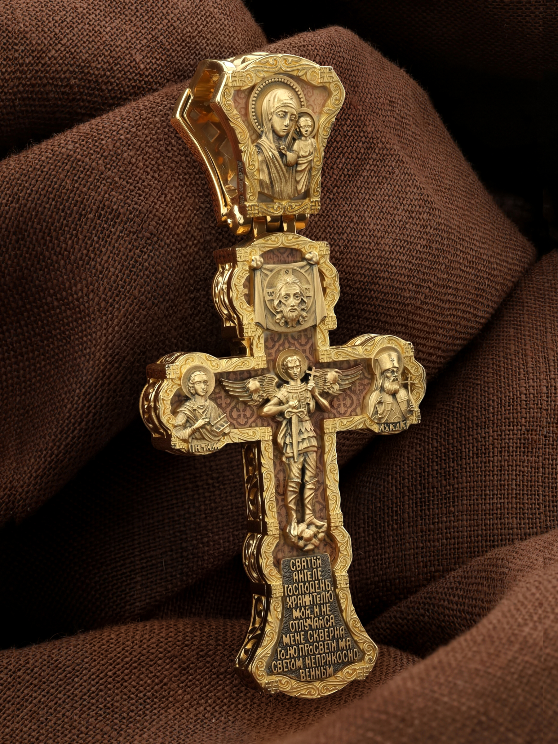На центральной части оборотной стороны креста изображен Святой Ангел-Хранитель в виде прекрасного юноши держащего в правой руке крест, а в левой — мечь. Ангел-Хранитель — это Ангел приставляемый Богом к человеку при крещении для охраны и помощи в добрых делах. Невидимо пребывая при нас постоянно, он, руководствуя нас ко спасению, не только по нашему желанию таинственно наставляет нас на все доброе и полезное, не только возносит наши молитвы к Богу, но еще и сам от себя охраняют и защищают нас от врагов видимых и невидимых и ходатайствует за нас пред Богом. Ниже образа написана молитва: «Святый Ангеле Господень, Хранитель мой, не отлучайся мене скверного, но просвети мя светом неприкосновенным.» Выше образа изображен Спас Нерукотворный — образ Господа и Спасителя нашего Иисуса Христа, чудесно отпечатавшийся на плате, котором Христос вытер свой лик. Слева — Свя¬той ве¬ли¬ко¬му¬че¬ник и це¬ли¬тель Пан¬те-ле¬и¬мон. Господь даровал удивительную силу его молитве. Ею он исцелял любые болезни, воскрешал мертвых. Справа — Святитель Лука (Войно-Ясенецкий). На кулонном кольце изображена Казанская икона Божией Матери — одна из самых любимых на Руси.