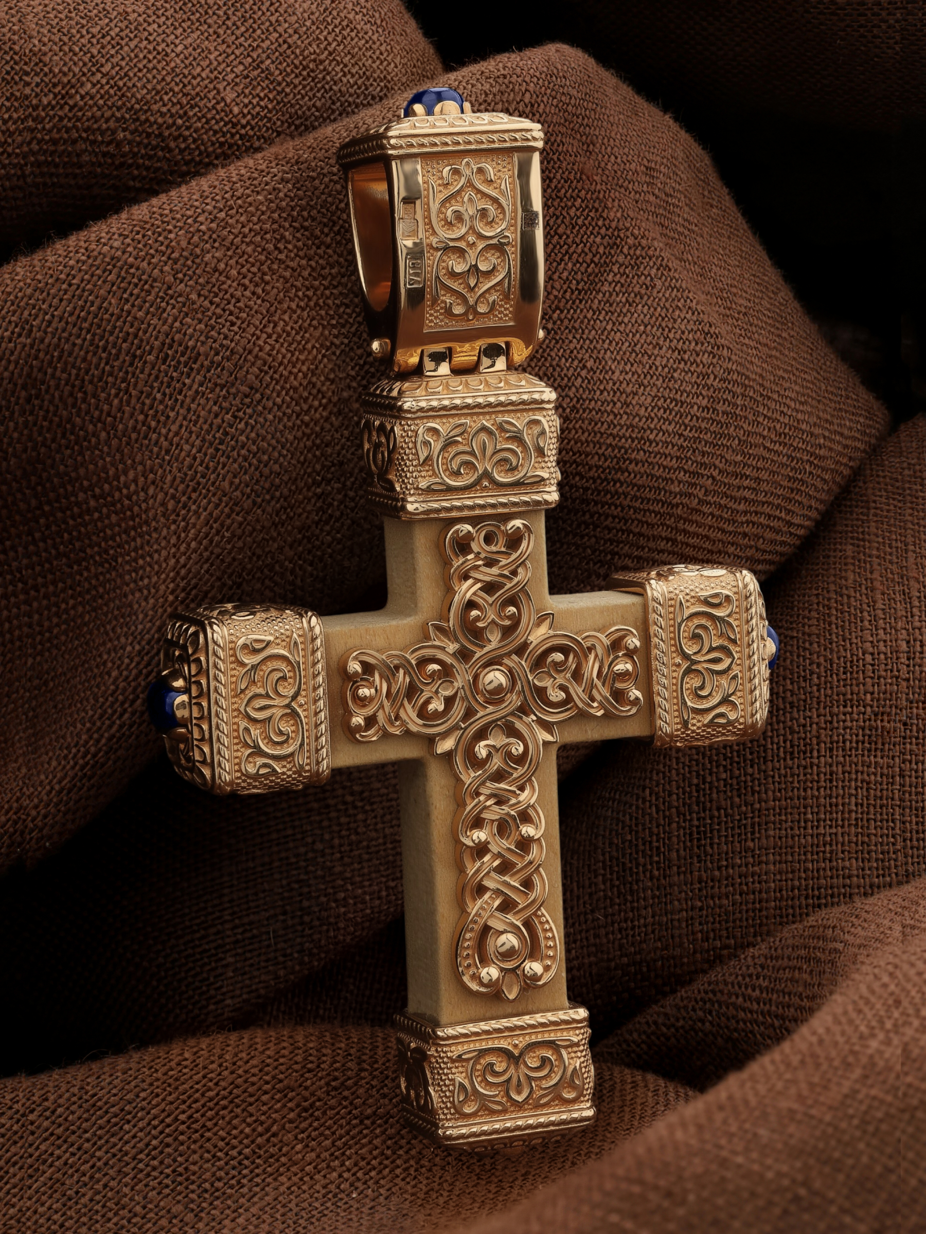На лицевой стороне креста изображено Распятие Господа и Спасителя нашего Иисуса Христа. Крест- символ спасения и искупления рода человеческого, знамение победы над смертью и адом. Иисус Христос, как искупительная жертва освобождения человечества от власти греха, умер крестной смертью и в третий день воскрес. На верхней табличке, выше головы Иисуса, расположена надпись, составленная Понтием Пилатом — «ИНЦИ». Она означает «Иисус Назорей, Царь Иудейский». Надпись «IС ХС» означает Иисус Христос помещается на разных сторонах поперечной перекладины креста. Надпись –«НИКА» означает победитель. На кулонном кольце помещен крест «терновый венец». Этот крест имеет форму восьмиконечного креста, вторая перекладина которого в центре обведена кругом с остриями по краю, символизирующими терновый венец. «Воины, сплетши венец из терна, возложили ему на голову, — говорится в Евангелии, — и ранами Его мы исцелились» (Ис. 53, 5). Вот почему терновый венок стал для христиан символом победы и награды, «венцом правды» (2 Тим. 4, 8), «венцом славы» (1 Пет. 5, 4), «венцом жизни» (Иак. 1, 12;.Апок. 2, 10).