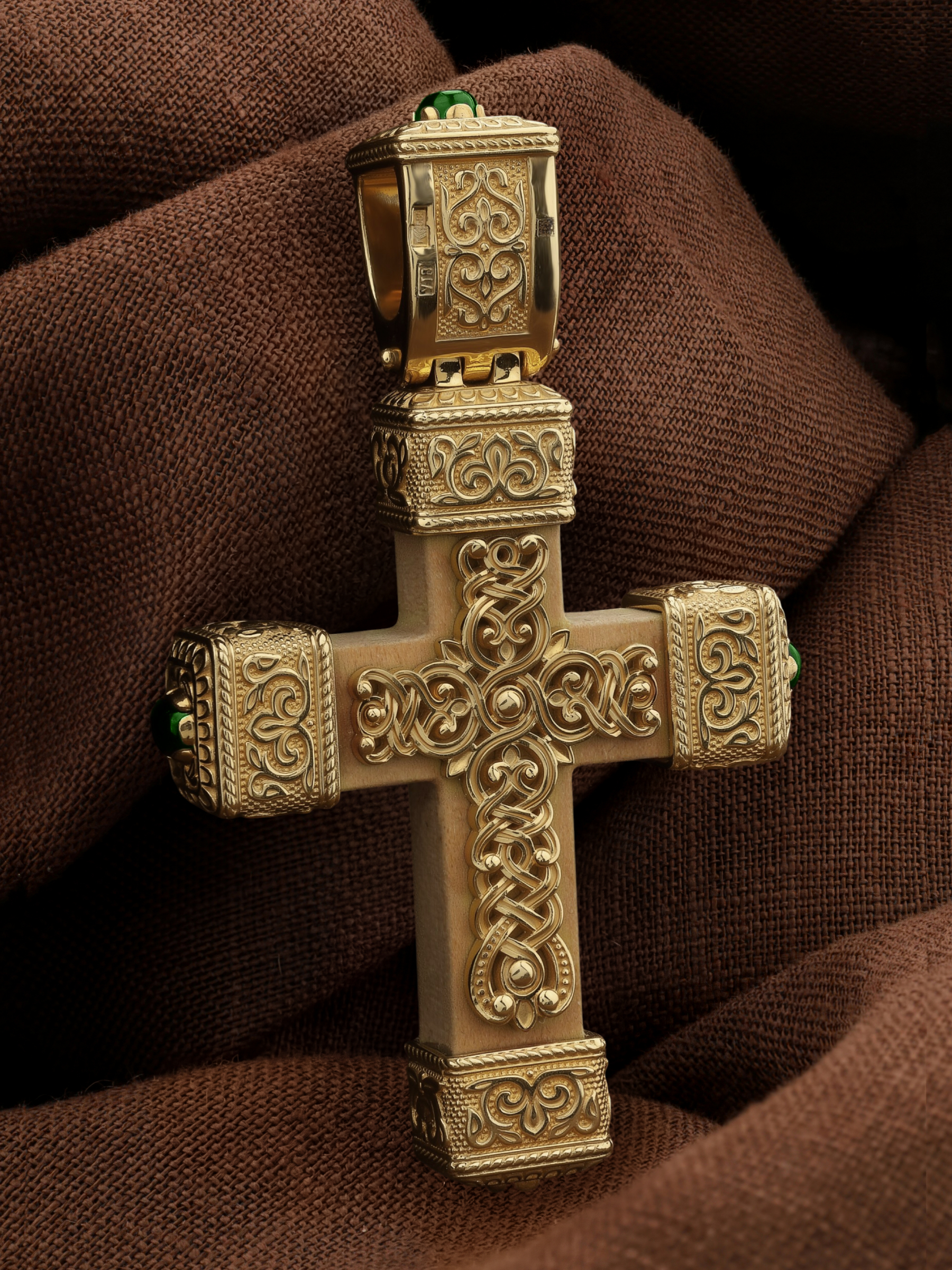 Крест из лимонного золота c эмалью, хризопразом и деревом груши