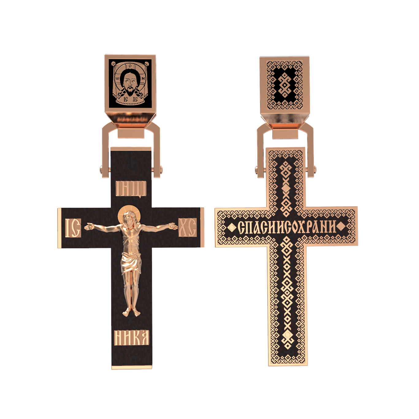 На лицевой стороне креста изображено Распятие Господа и Спасителя нашего Иисуса Христа. В Голгофе сокрыта непостижимая тайна бесконечной правды и любви Бога. Крест стал символом победы добра над злом, жизни над смертью, напоминанием бесконечной Божьей любви, предметом радости. Воплотившийся Сын Божий Своею кровью освятил крест и сделал его проводником Своей благодати, источником освящения верующих. На верхней табличке, выше головы Иисуса, расположена надпись, составленная Понтием Пилатом — «IНЦI». Она означает «Иисус Назорей, Царь Иудейский». Надпись «IС ХС» означает Иисус Христос размещается на разных сторонах поперечной перекладины креста. В нижней части креста находится надпись «НИКА», что в переводе с греческого означает «победитель». На православном кресте Христос не умирает, а свободно простирает руки, ладони Иисуса открыты, будто он хочет обнять все человечество, даря им свою любовь и открывая путь к вечной жизни. На кулонном кольце размещено изображение Спаса Нерукотворного — образ Спасителя, который Он запечатлел на плате и передал для исцеления больному проказой царю Эдессы. Ему придается победное и защитное значение.