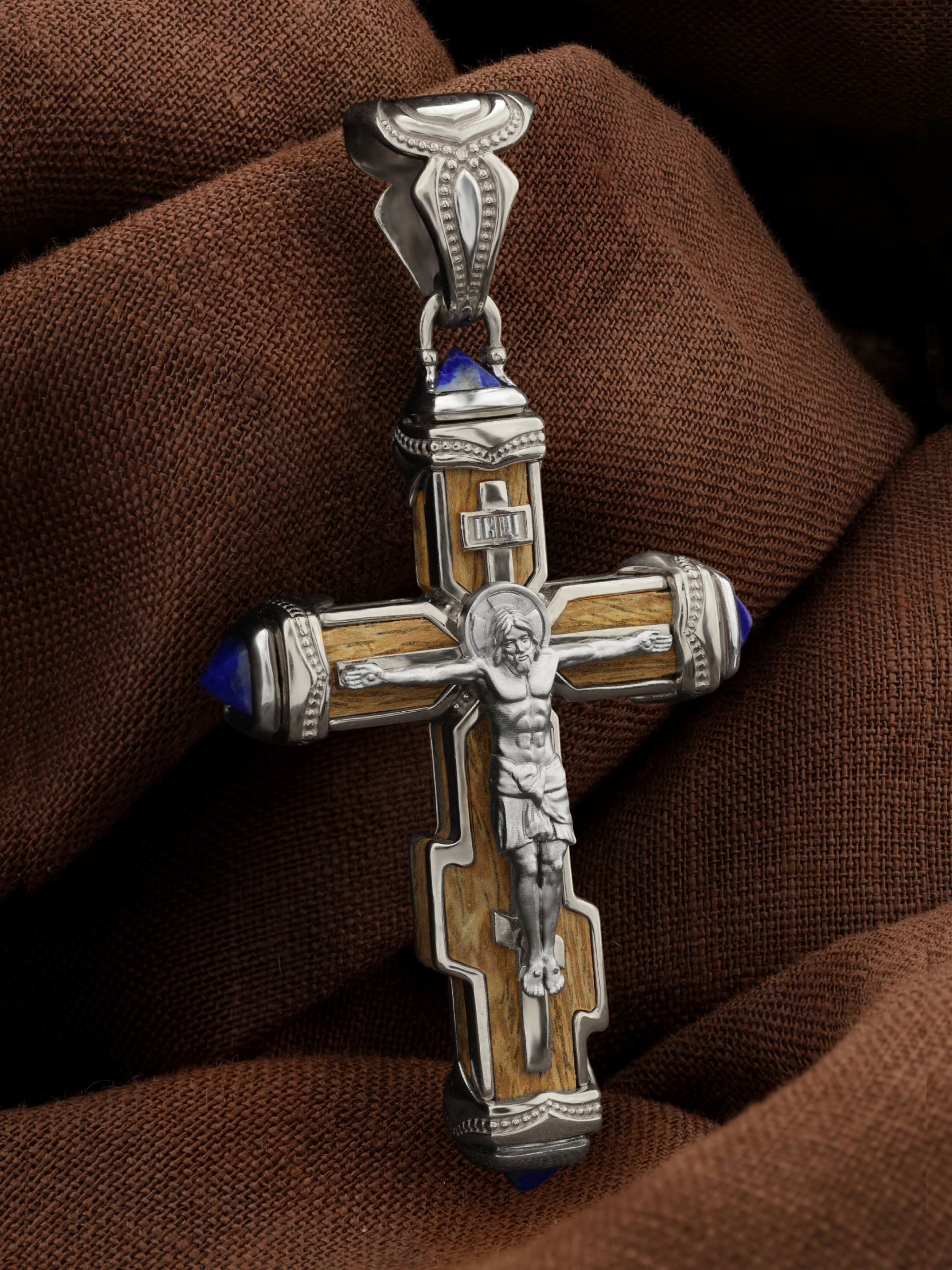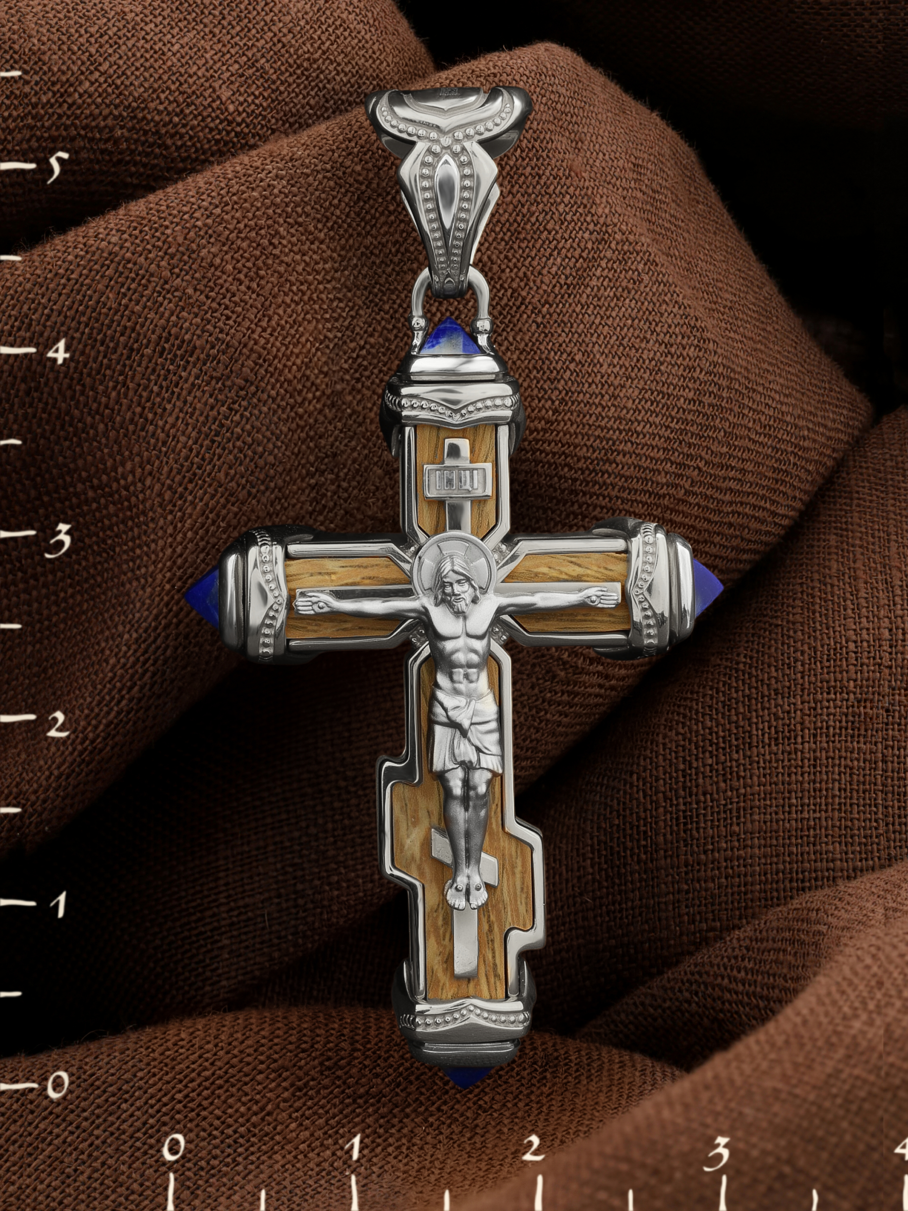 На лицевой стороне креста изображено Распятие Господа и Спасителя нашего Иисуса Христа. Своими крестными страданиями Господь смыл наши грехи, покрыл наш долг перед Богом или, на языке Писания, нас «искупил». В Голгофе сокрыта непостижимая тайна бесконечной правды и любви Бога. Крест стал символом победы добра над злом, жизни над смертью, напоминанием бесконечной Божьей любви, предметом радости. Воплотившийся Сын Божий Своею кровью освятил крест и сделал его проводником Своей благодати, источником освящения верующих. На верхней табличке, выше головы Иисуса, расположена надпись, составленная Понтием Пилатом — «IНЦI». Она означает «Иисус Назорей, Царь Иудейский». Надпись «IC» «ХC», означает Иисус Христос, помещаются на разных сторонах поперечной перекладины креста. Христос в Своей Божественной любви, над которой смерть не властна и которая, страдая, и не страдает в обычном смысле, простирает к людям со Креста Свои объятия, в которые призывается и привлекается весь мир. Поэтому Тело Его не висит, а торжественно покоится на Кресте.