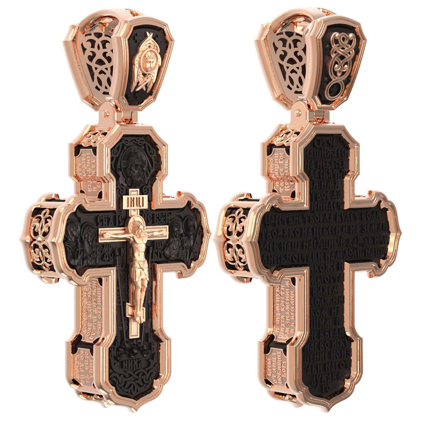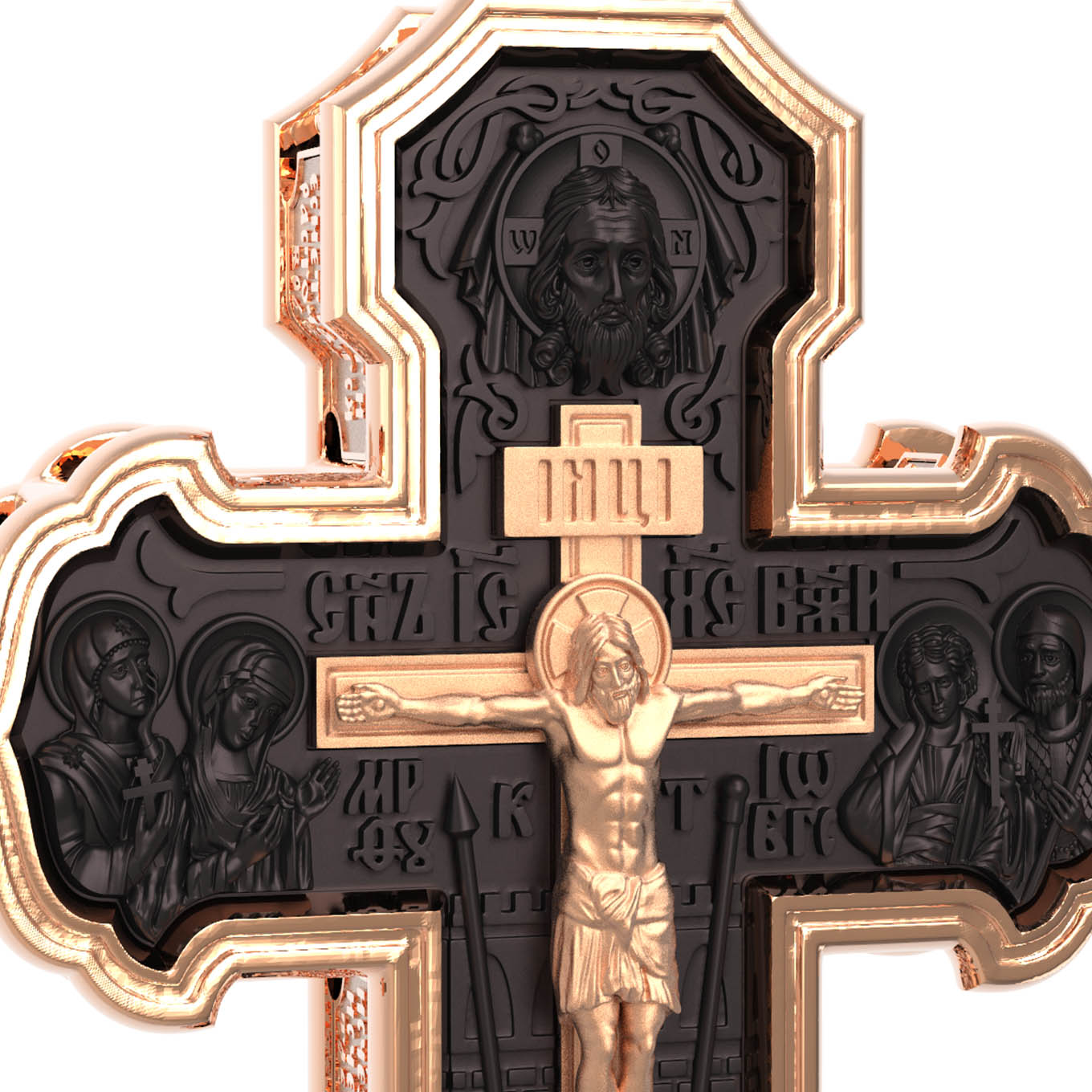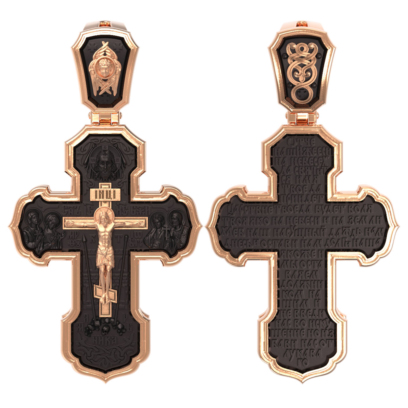 На лицевой стороне креста изображено Распятие Господа и Спасителя нашего Иисуса Христа. Крест- символ спасения и искупления рода человеческого, знамение победы над смертью и адом. Иисус Христос, как искупительная жертва освобождения человечества от власти греха, умер крестной смертью и в третий день воскрес. На верхней табличке, выше головы Иисуса, расположена надпись, составленная Понтием Пилатом — «IНЦI». Она означает «Иисус Назорей, Царь Иудейский». Надпись «IС» « ХС» означает Иисус Христос и помещается на разных сторонах поперечной (большой) перекладины креста. Рядом расположена надпись «Сын Божий». Выше Распятия изображен Нерукотворный образ Господа и Спасителя нашего Иисуса Христа. Слева от Распятия — Пресвятая Богородица и святая мироносица Мария Магдалина с крестом в руке. Справа — апостол и евангелист Иоанн Богослов, один из ближайших учеников Иисуса Христа и сотник Лонгин с крестом в правой руке и копьем — в левой. За крестом высится Иерусалимская стена. Крест стоит на горе камней, символизирующих Голгофу. В ее основании различается череп — это голова Адама. Вдоль креста изображены копие сотника Лонгина и трость с губкой и буквы «К» и «Т». Надпись «МЛРБ» — «место лобное рай бысть» означает, что место лобное стало раем и помещаются в нижней части креста. Рядом — слово «НИКА», что означает «победитель». На православном кресте Христос не умирает, а свободно простирает руки, ладони Иисуса открыты, будто он хочет обнять все человечество, даря им свою любовь и открывая путь к вечной жизни. На кулонном кольце изображен шестикрылый Серафим.