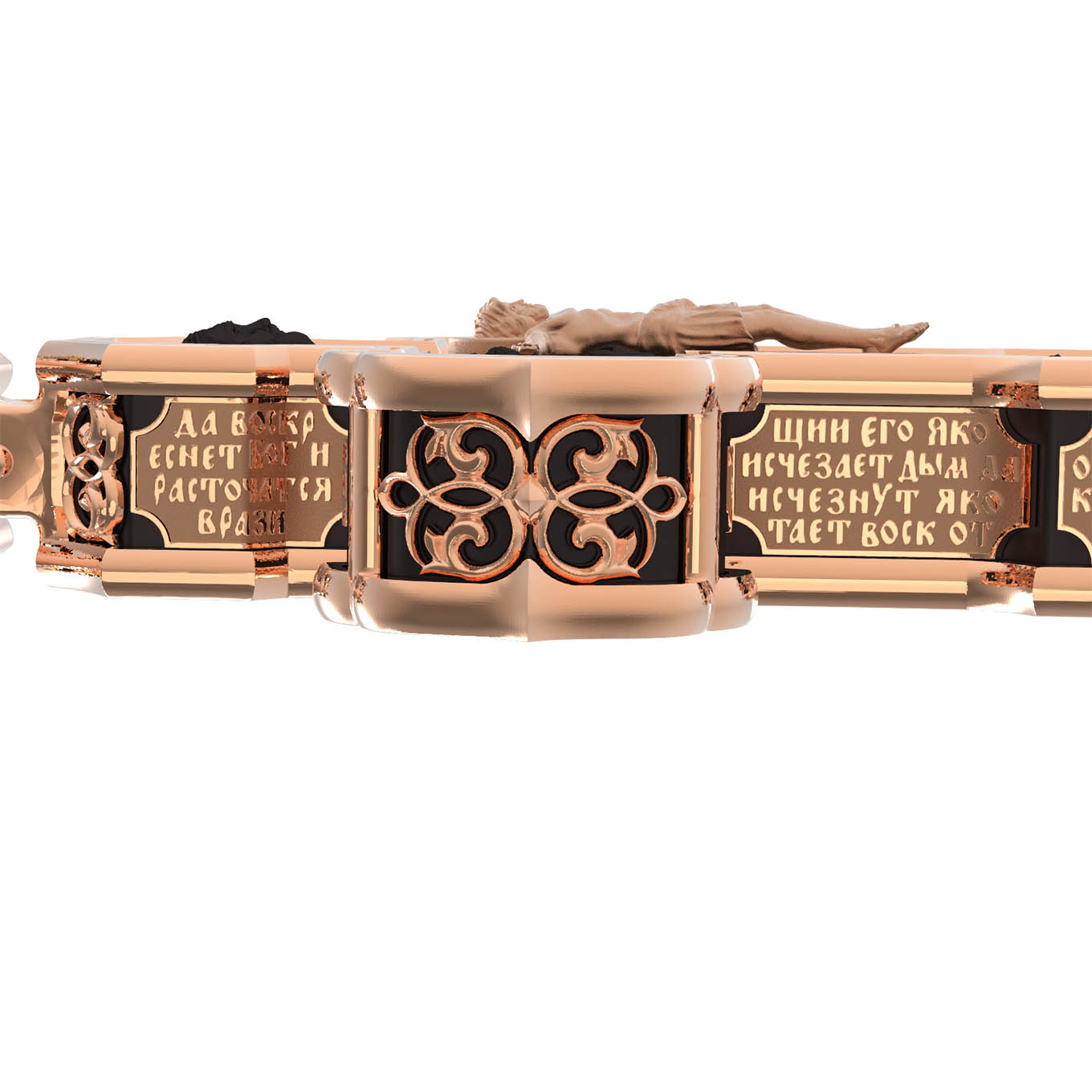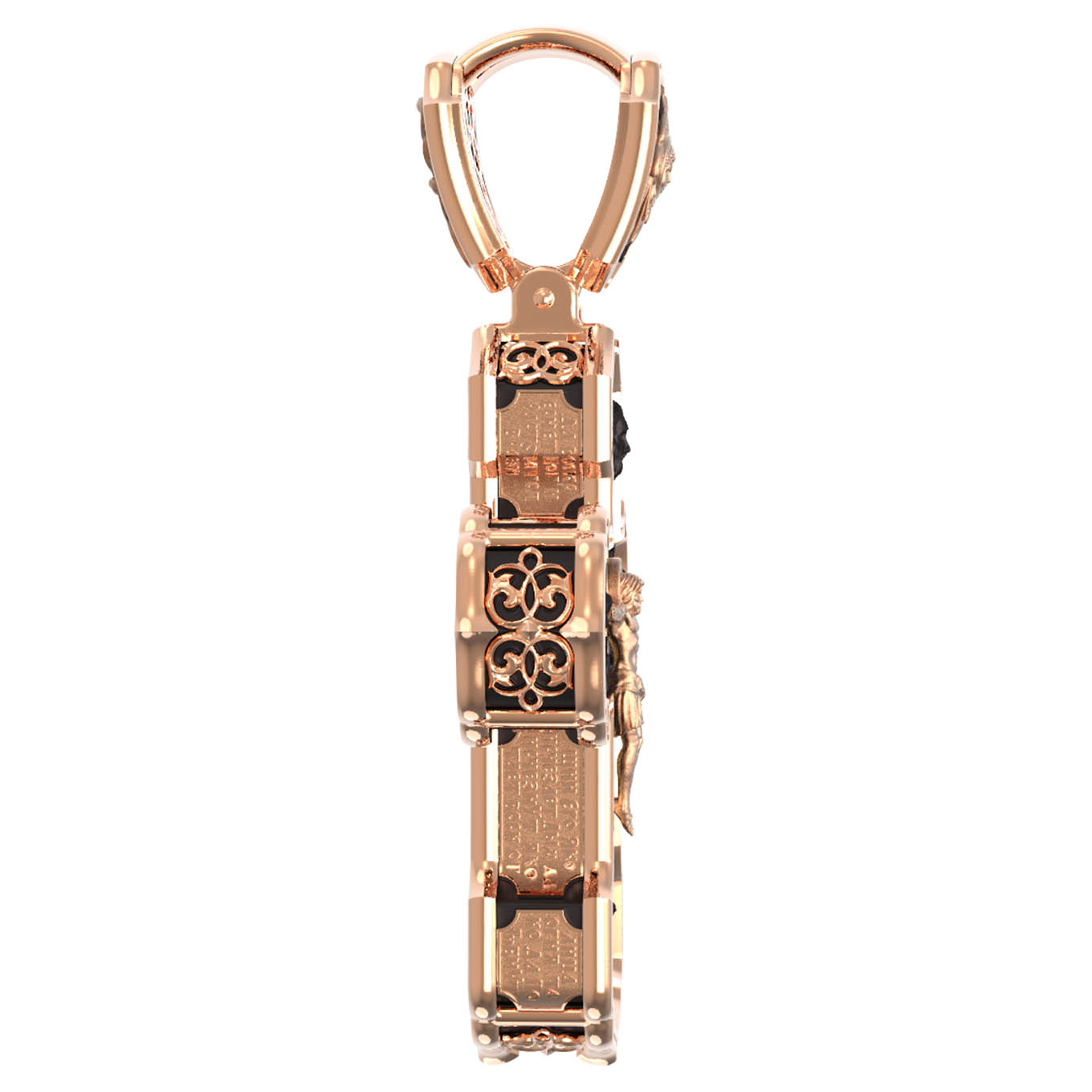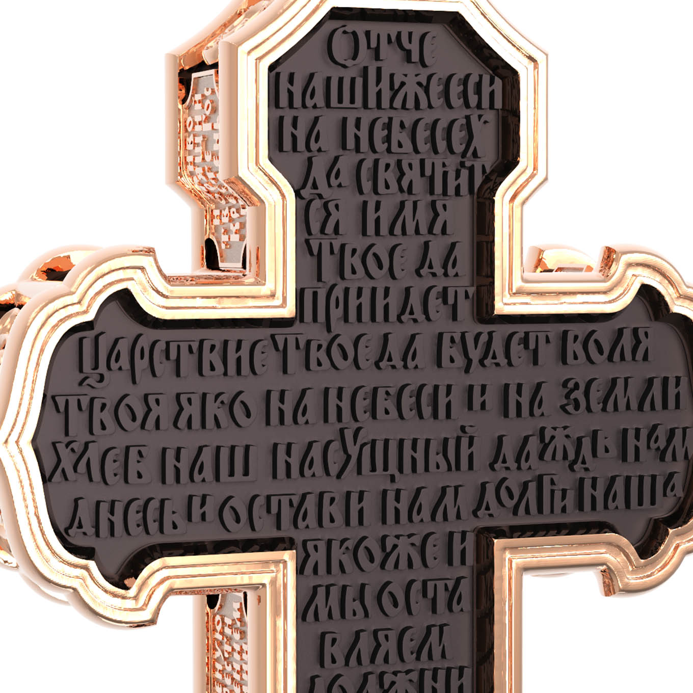 На лицевой стороне креста изображено Распятие Господа и Спасителя нашего Иисуса Христа. Крест- символ спасения и искупления рода человеческого, знамение победы над смертью и адом. Иисус Христос, как искупительная жертва освобождения человечества от власти греха, умер крестной смертью и в третий день воскрес. На верхней табличке, выше головы Иисуса, расположена надпись, составленная Понтием Пилатом — «IНЦI». Она означает «Иисус Назорей, Царь Иудейский». Надпись «IС» « ХС» означает Иисус Христос и помещается на разных сторонах поперечной (большой) перекладины креста. Рядом расположена надпись «Сын Божий». Выше Распятия изображен Нерукотворный образ Господа и Спасителя нашего Иисуса Христа. Слева от Распятия — Пресвятая Богородица и святая мироносица Мария Магдалина с крестом в руке. Справа — апостол и евангелист Иоанн Богослов, один из ближайших учеников Иисуса Христа и сотник Лонгин с крестом в правой руке и копьем — в левой. За крестом высится Иерусалимская стена. Крест стоит на горе камней, символизирующих Голгофу. В ее основании различается череп — это голова Адама. Вдоль креста изображены копие сотника Лонгина и трость с губкой и буквы «К» и «Т». Надпись «МЛРБ» — «место лобное рай бысть» означает, что место лобное стало раем и помещаются в нижней части креста. Рядом — слово «НИКА», что означает «победитель». На православном кресте Христос не умирает, а свободно простирает руки, ладони Иисуса открыты, будто он хочет обнять все человечество, даря им свою любовь и открывая путь к вечной жизни. На кулонном кольце изображен шестикрылый Серафим.