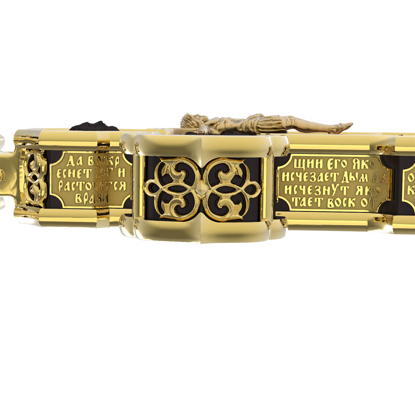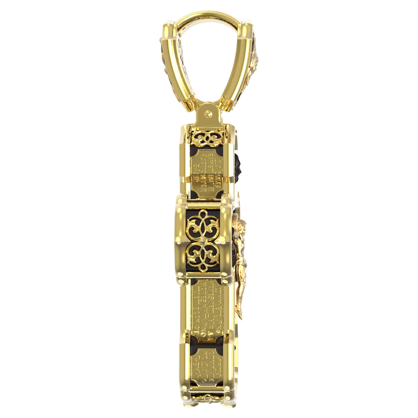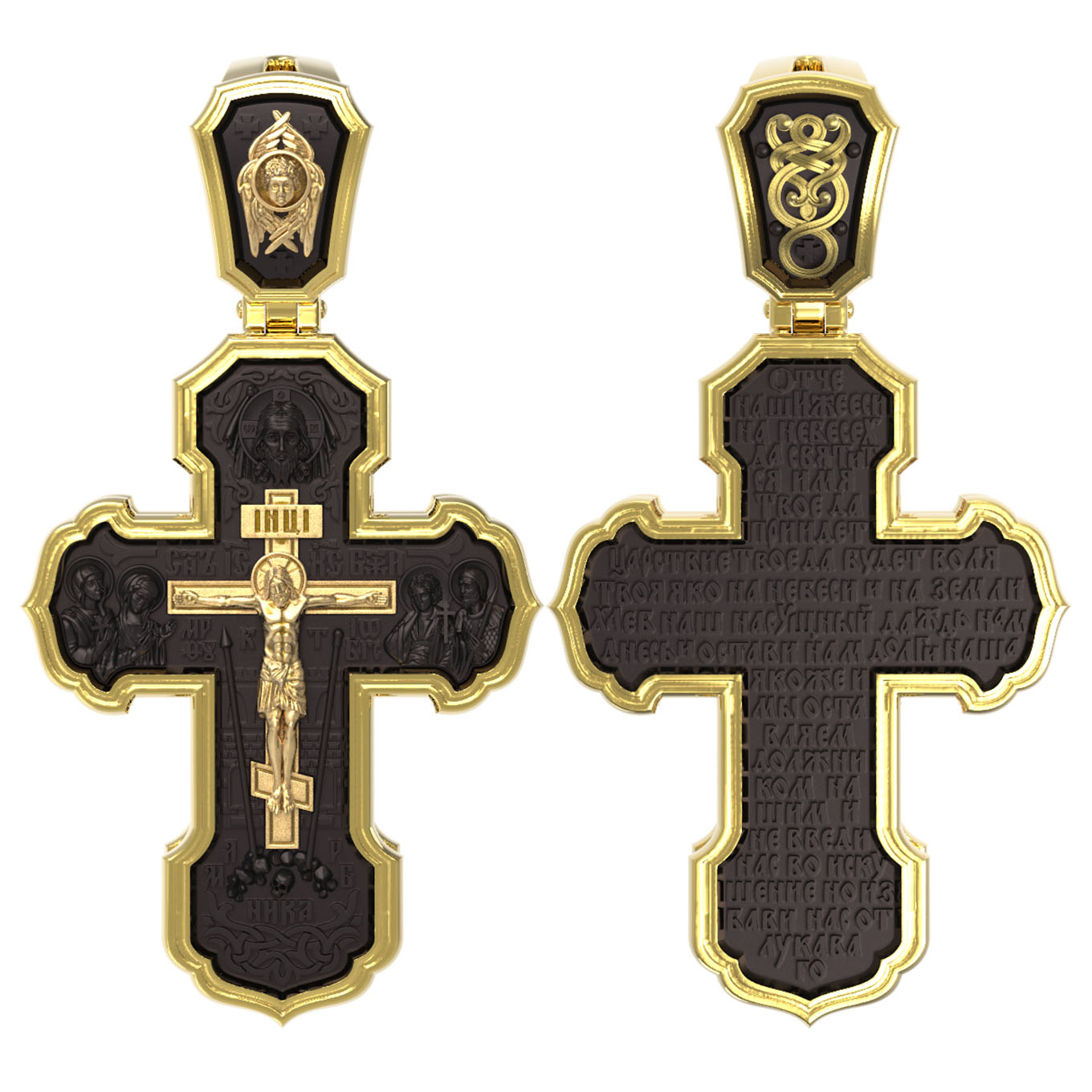 На лицевой стороне креста изображено Распятие Господа и Спасителя нашего Иисуса Христа. Крест- символ спасения и искупления рода человеческого, знамение победы над смертью и адом. Иисус Христос, как искупительная жертва освобождения человечества от власти греха, умер крестной смертью и в третий день воскрес. На верхней табличке, выше головы Иисуса, расположена надпись, составленная Понтием Пилатом — «IНЦI». Она означает «Иисус Назорей, Царь Иудейский». Надпись «IС» « ХС» означает Иисус Христос и помещается на разных сторонах поперечной (большой) перекладины креста. Рядом расположена надпись «Сын Божий». Выше Распятия изображен Нерукотворный образ Господа и Спасителя нашего Иисуса Христа. Слева от Распятия — Пресвятая Богородица и святая мироносица Мария Магдалина с крестом в руке. Справа — апостол и евангелист Иоанн Богослов, один из ближайших учеников Иисуса Христа и сотник Лонгин с крестом в правой руке и копьем — в левой. За крестом высится Иерусалимская стена. Крест стоит на горе камней, символизирующих Голгофу. В ее основании различается череп — это голова Адама. Вдоль креста изображены копие сотника Лонгина и трость с губкой и буквы «К» и «Т». Надпись «МЛРБ» — «место лобное рай бысть» означает, что место лобное стало раем и помещаются в нижней части креста. Рядом — слово «НИКА», что означает «победитель». На православном кресте Христос не умирает, а свободно простирает руки, ладони Иисуса открыты, будто он хочет обнять все человечество, даря им свою любовь и открывая путь к вечной жизни. На кулонном кольце изображен шестикрылый Серафим.