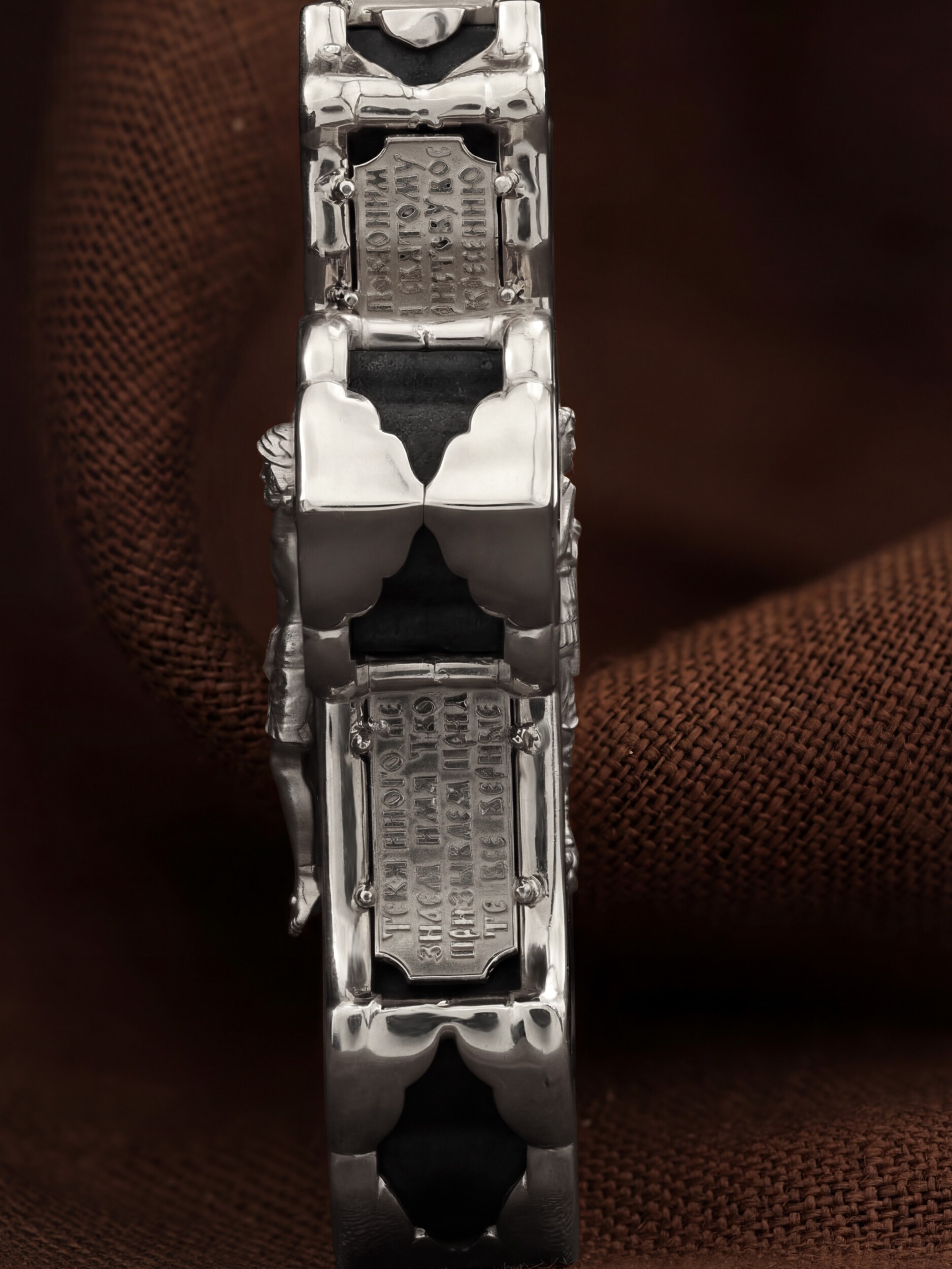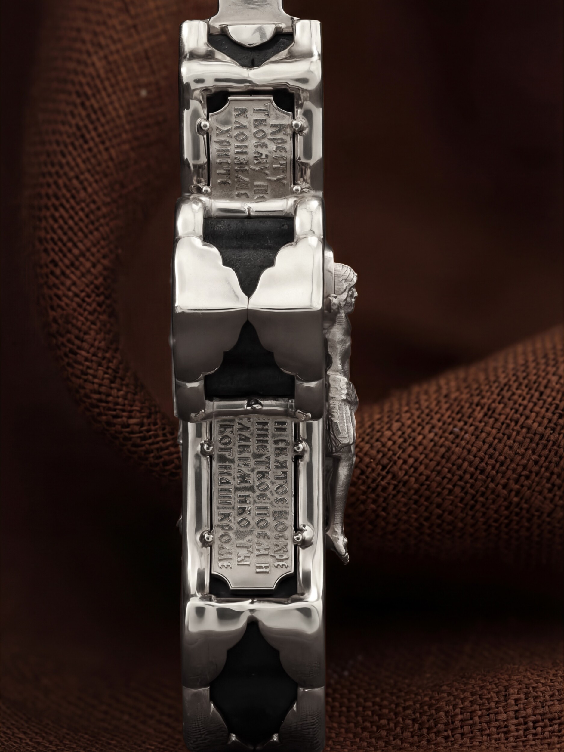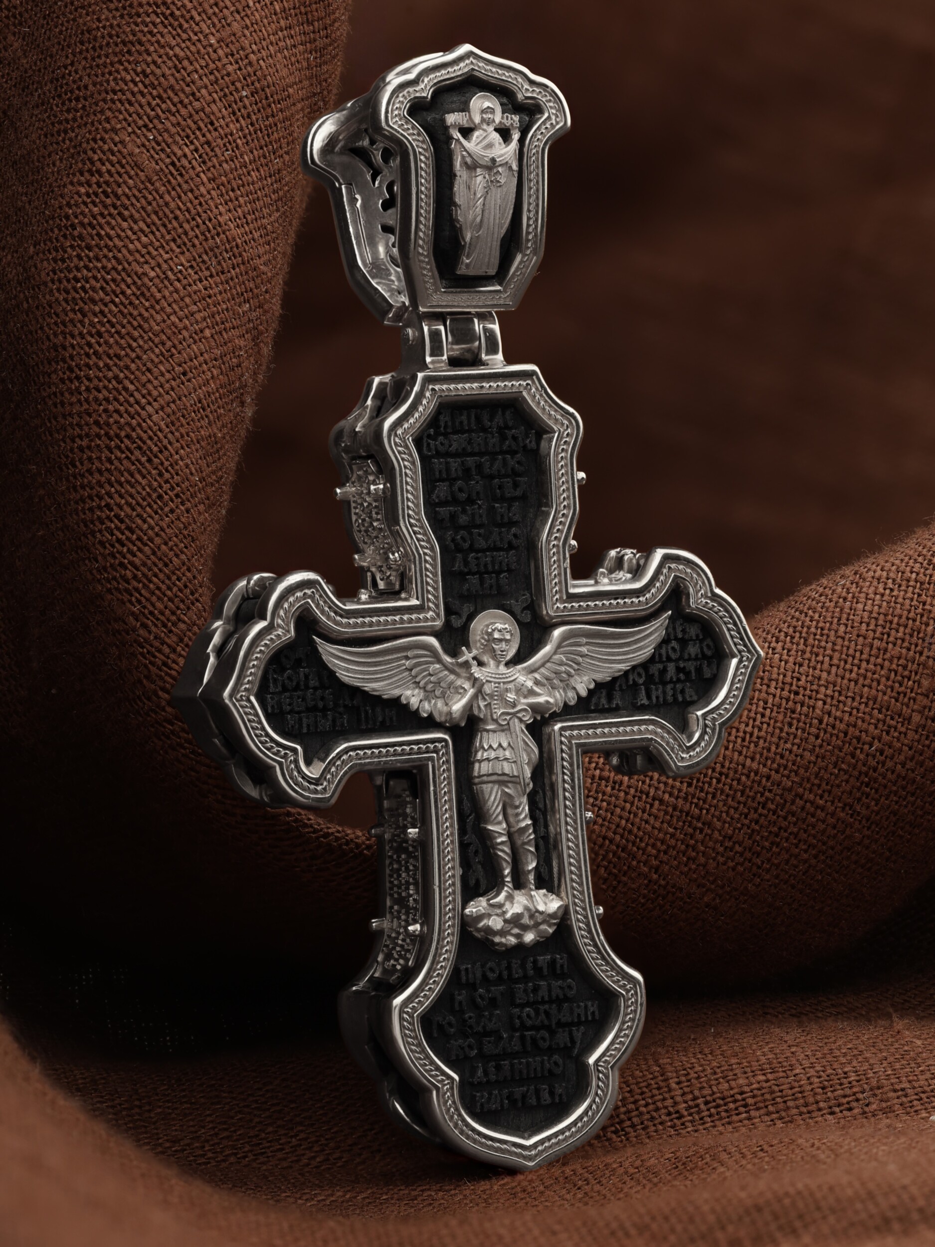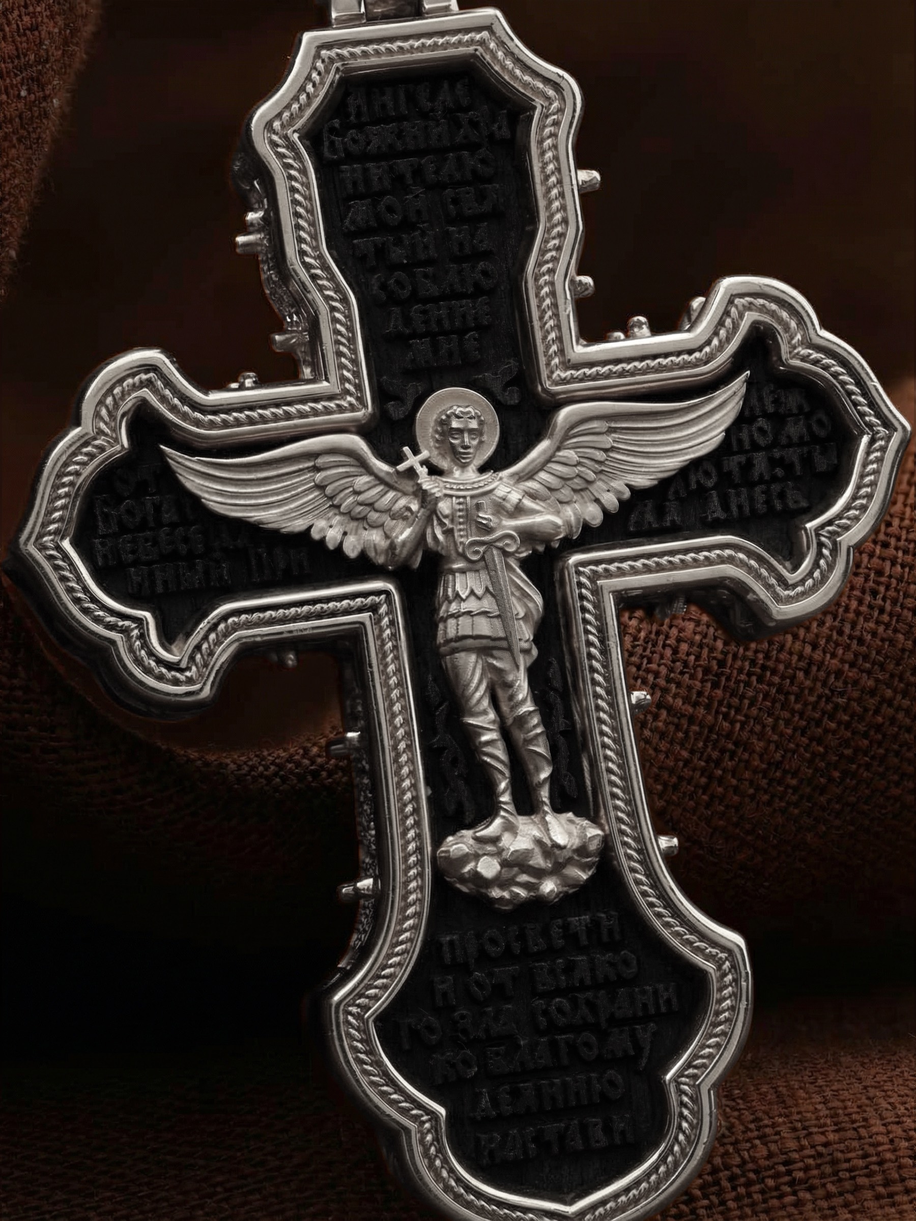 В центре оборотной стороне креста изображен Святой Агнгел-Хранитель в виде юноши держащего в правой руке крест, а в левой — мечь. Агнгел-Хранитель — это Ангел приставляемый Богом к человеку при крещении для охраны и помощи в добрых делах. Он невидимо находится при человеке на протяжении всей его жизни, если человек сохраняет в себе любовь к Богу и истинную веру перед Ним. По сторонам от изображения помещена молитва: «Ангеле Божий, хранителю мой святый, на соблюдение мне от Бога с небесе данный! Прилежно молю тя: ты мя днесь просвети, и от всякаго зла сохрани, ко благому деянию настави…». На кулонном кольце изображена икона Божией Матери «Покров Пресвятой Богородицы».