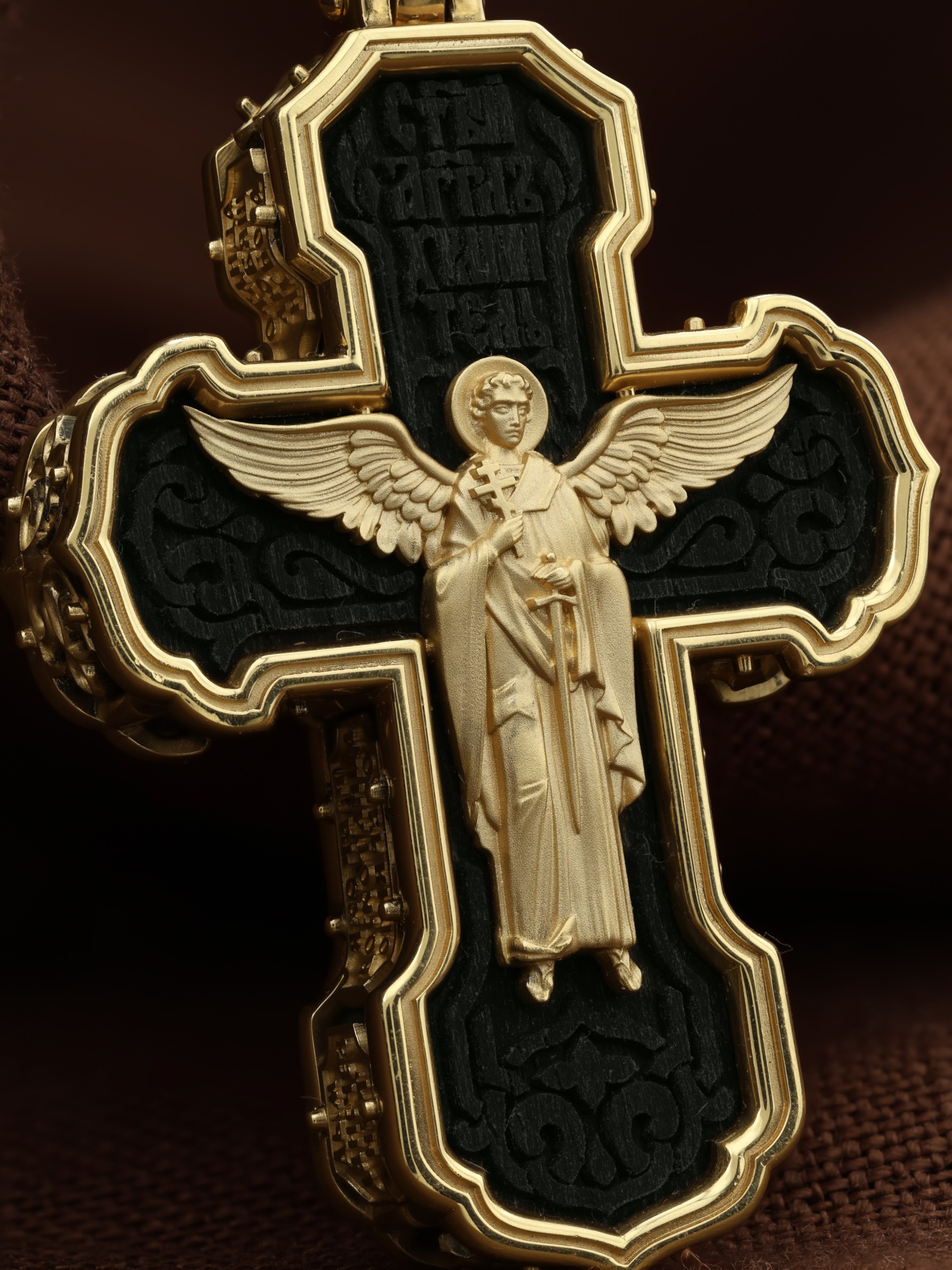 На оборотной стороне креста изображен Святой Ангел-Хранитель в виде прекрасного юноши держащего в правой руке крест, а в левой — мечь. Ангел-Хранитель — это Ангел приставляемый Богом к человеку при крещении для охраны и помощи в добрых делах. Он невидимо находится при человеке на протяжении всей его жизни, если человек сохраняет в себе любовь к Богу и истинную веру перед Ним. Ангел-Xранитель делают для нас все, что служит к истинному нашему благу и спасению. Одного лишь каждому из нас он желает — спасения души; к этому он направляет все свои заботы.