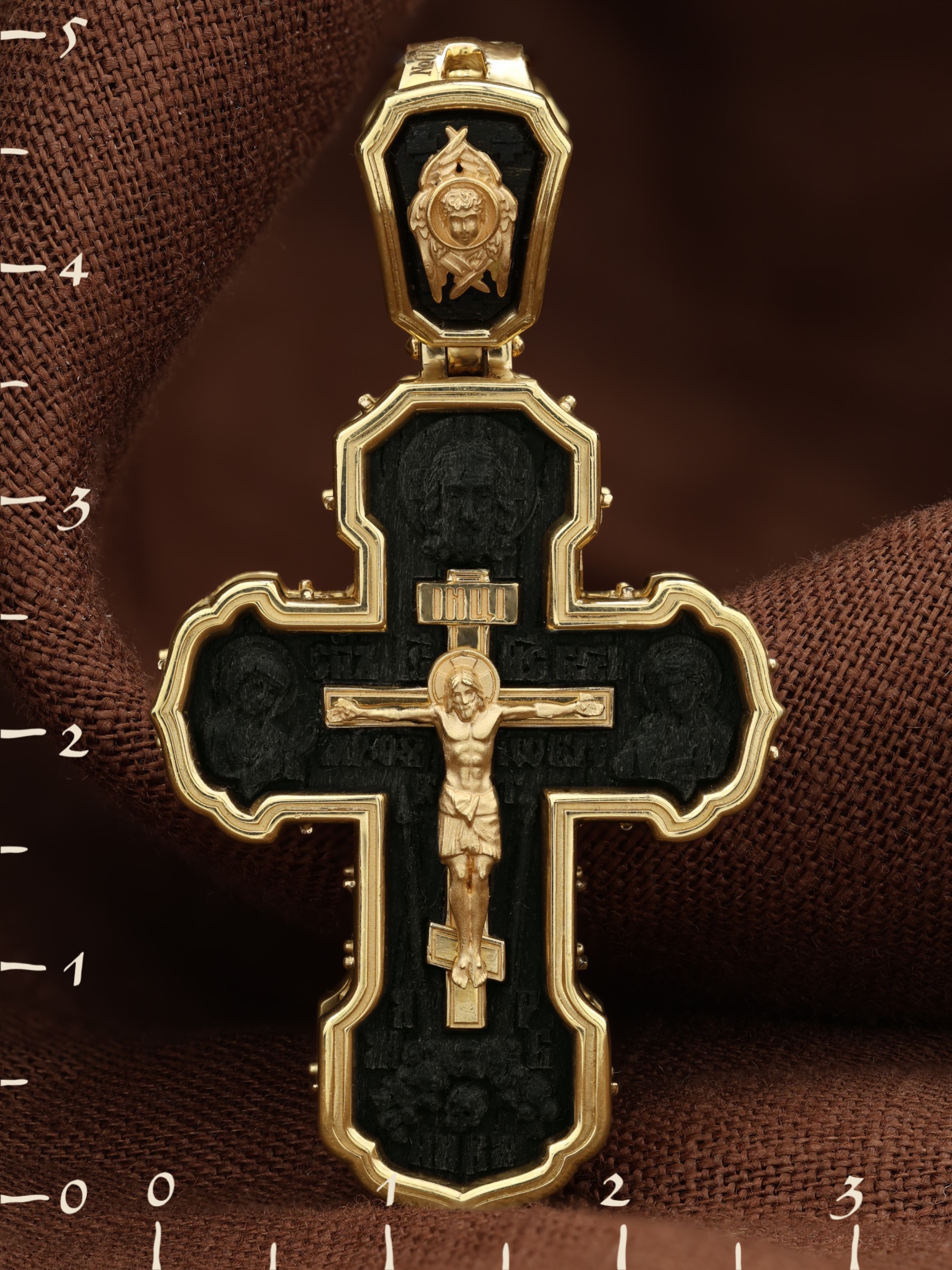На лицевой стороне креста изображено Распятие Господа и Спасителя нашего Иисуса Христа. Крест- символ спасения и искупления рода человеческого, знамение победы над смертью и адом. Иисус Христос, как искупительная жертва освобождения человечества от власти греха, умер крестной смертью и в третий день воскрес. На верхней табличке, выше головы Иисуса, расположена надпись, составленная Понтием Пилатом — «IНЦI». Она означает «Иисус Назорей, Царь Иудейский». Надпись «IС» « ХС» означает Иисус Христос и помещается на разных сторонах поперечной (большой) перекладины креста. Рядом расположена надпись «Сын Божий». Выше Распятия изображен Нерукотворный образ Господа и Спасителя нашего Иисуса Христа. Слева от Распятия изображена Пресвятая Богородица, справа — апостол и евангелист Иоанн Богослов, один из ближайших учеников Иисуса Христа. Крест стоит на горе камней, символизирующих Голгофу. В ее основании различается череп — это голова Адама. Вдоль креста изображены копие сотника Лонгина и трость с губкой и буквы «К» и «Т». Надпись «МЛРБ» — «место лобное рай бысть» означает, что место лобное стало раем и помещаются в нижней части креста. Рядом — слово «НИКА», что означает «победитель». На православном кресте Христос не умирает, а свободно простирает руки, ладони Иисуса открыты, будто он хочет обнять все человечество, даря им свою любовь и открывая путь к вечной жизни. На кулонном кольце изображен шестикрылый Серафим.