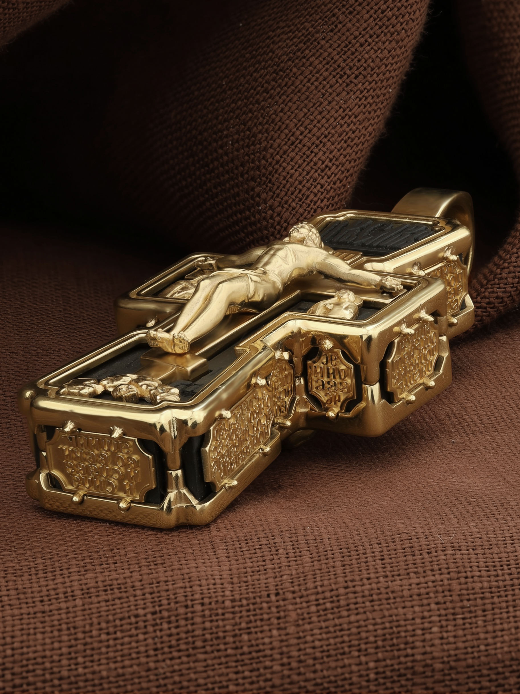 На лицевой стороне креста изображено Распятие Господа и Спасителя нашего Иисуса Христа. В Голгофе сокрыта непостижимая тайна бесконечной правды и любви Бога. Крест стал символом победы добра над злом, жизни над смертью, напоминанием бесконечной Божьей любви, предметом радости. Воплотившийся Сын Божий Своею кровью освятил крест и сделал его проводником Своей благодати, источником освящения верующих. Господь сказал: кто хочет идти за Мною, отвергнись себя, и возьми крест свой, и следуй за Мною. (Мк. 8: 34). Над Распятием помещена надпись «Царь Славы». Ниже расположена надпись «IC» «ХC», означает Иисус Христос. Слева от Распятия изображена Пресвятая Богородица, справа — апостол и евангелист Иоанн Богослов, один из ближайших учеников Иисуса Христа. В нижней части креста помещено слово «НИКА», что означает «победитель». Крест стоит на горе камней, символизирующих Голгофу. В ее основании различается череп — это голова Адама.