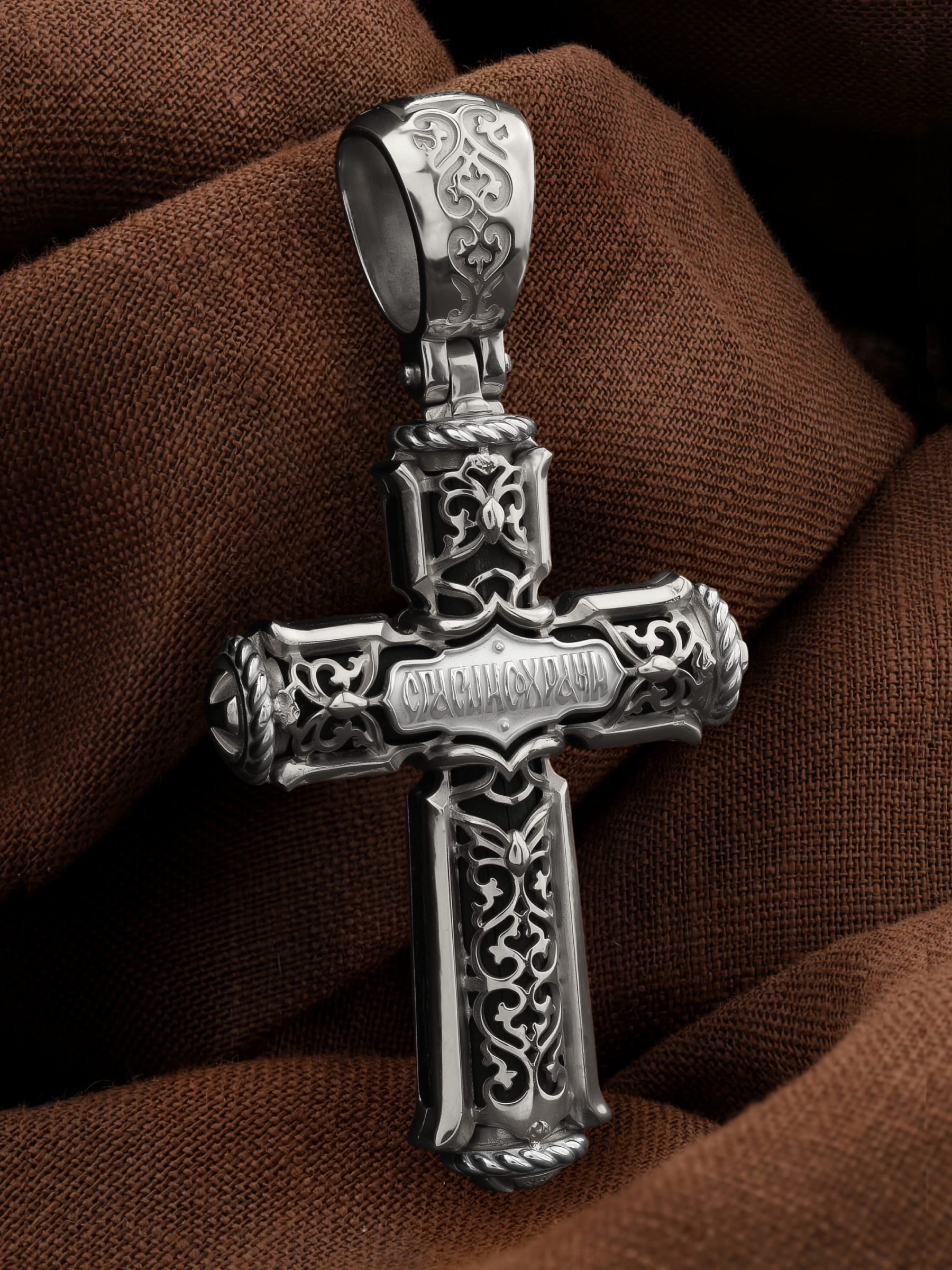 На оборотной стороне креста помещена молитва: «Спаси и сохрани». Крест украшен орнаментом.