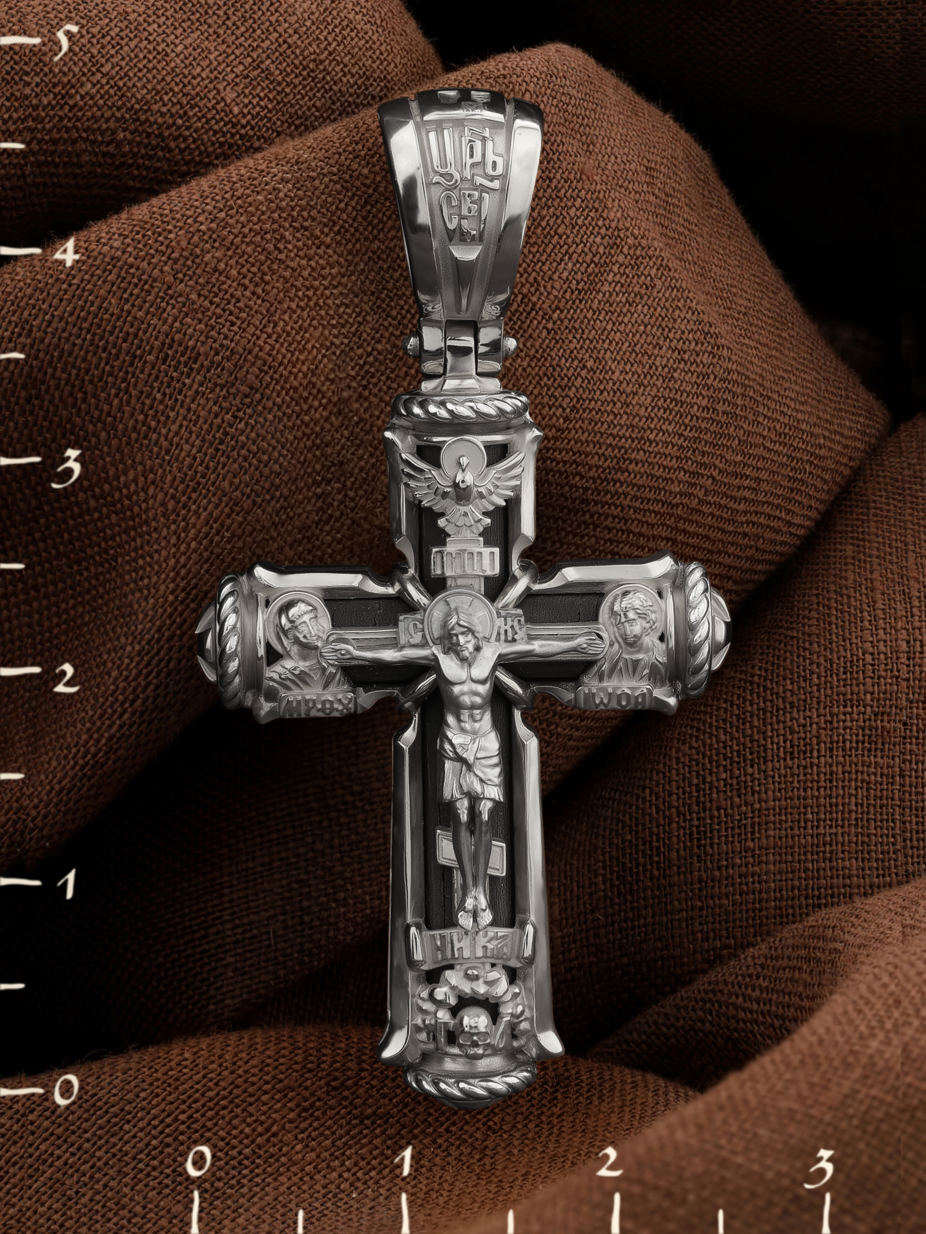 На лицевой стороне креста изображено Распятие Господа и Спасителя нашего Иисуса Христа, отдавшего Себя на смерть, для искупления грехов мира. Крест является символом жертвенной любви всеблагого Бога к падшим людям, всепобеждающим духовным оружием христиан, основанием и средоточием церковной жизни. Верхняя перекладина символизирует титло — табличку, на которой, согласно Евангелию, было начертано: Иисус Назорей Царь Иудейский (IНЦI). Надпись «IС» « ХС» означает Иисус Христос и размещена над поперечной перекладиной. Слева от Распятия изображена Пресвятая Богородица, справа — апостол и евангелист Иоанн Богослов, один из ближайших учеников Иисуса Христа. Возвышение, на котором стоит Крест, символизирует гору Голгофу, на которой произошло Распятие. Под подножием Креста изображена покоящаяся голова (череп) Адама. Под Распятием помещено изображение Духа Святого в виде голубя.