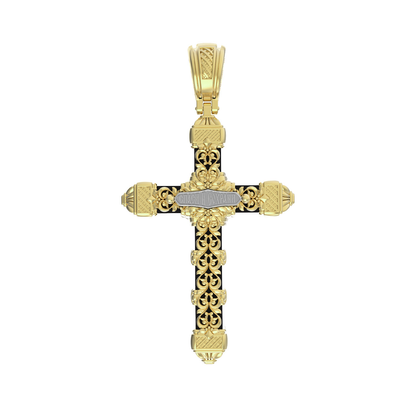 На оборотной стороне креста помещена молитва: «Спаси и сохрани». Крест украшен орнаментом.