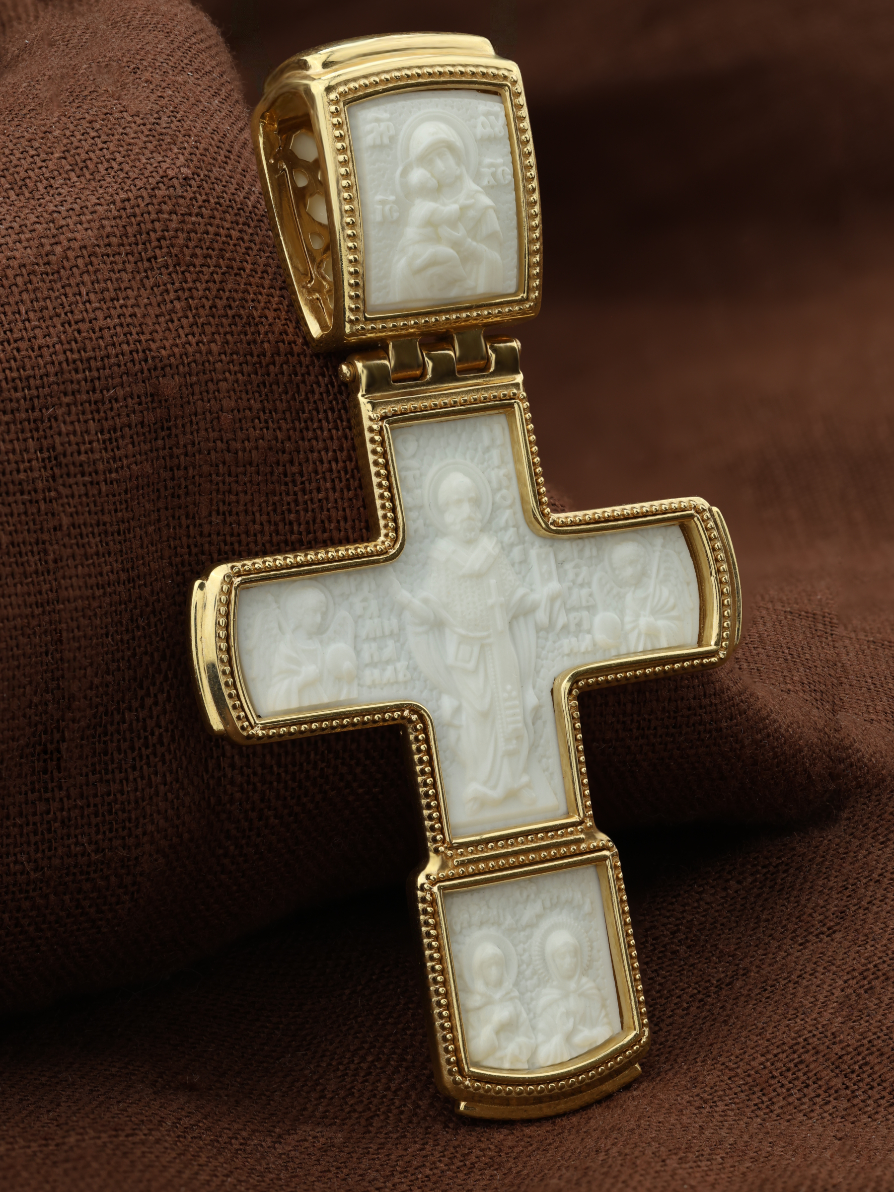 В центре на обороте — самый почитаемый в Православной Церкви святой, Николай Чудотворец, которого еще называют Николай Угодник за то, что он угодил своей жизнью Богу. Ему молятся, отправляясь в путешествие, особенно по морю, просят исцеления в различных недугах, помощи в торговых делах, учебе и поисках достойного супруга. С двух сторон от Николая Чудотворца помещены образы архангелов Михаила и Гавриила. Вверху — Владимирская икона Божией Матери — самая великая русская святыня, многие века бывшая олицетворением нашей земли. Перед ней венчались на царство государи, избирались патриархи. Пречистой Богородице Владимирской клялись в верности Отечеству солдаты и за нее умирали на поле брани. Именно на ее защиту более всего уповала Россия в самые страшные периоды своей истории. В нижнем клейме — иконы двух святых помощниц от всех недугов, блаженных Ксении Петербургской и Матроны Московской.