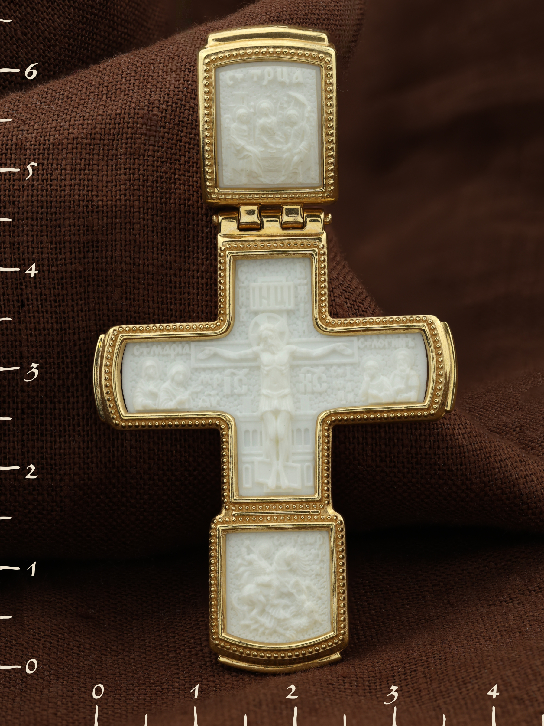 На кресте изображено Распятие Господа нашего Иисуса Христа. Ему предстоят Святая Мария Магдалина, Пресвятая Богородица, апостол Иоанн и Святой Иосиф, свидетели крестных страданий Господа. На оглавии помещена икона Святой Троицы, на которой запечатлено явление Триединого Бога праотцу Аврааму в виде трех ангелов. В нижнем клейме изображено Чудо Святого Георгия о змие. Великомученик Георгий почитается как покровитель воинов, защитник от злых сил, помощник в духовной борьбе.