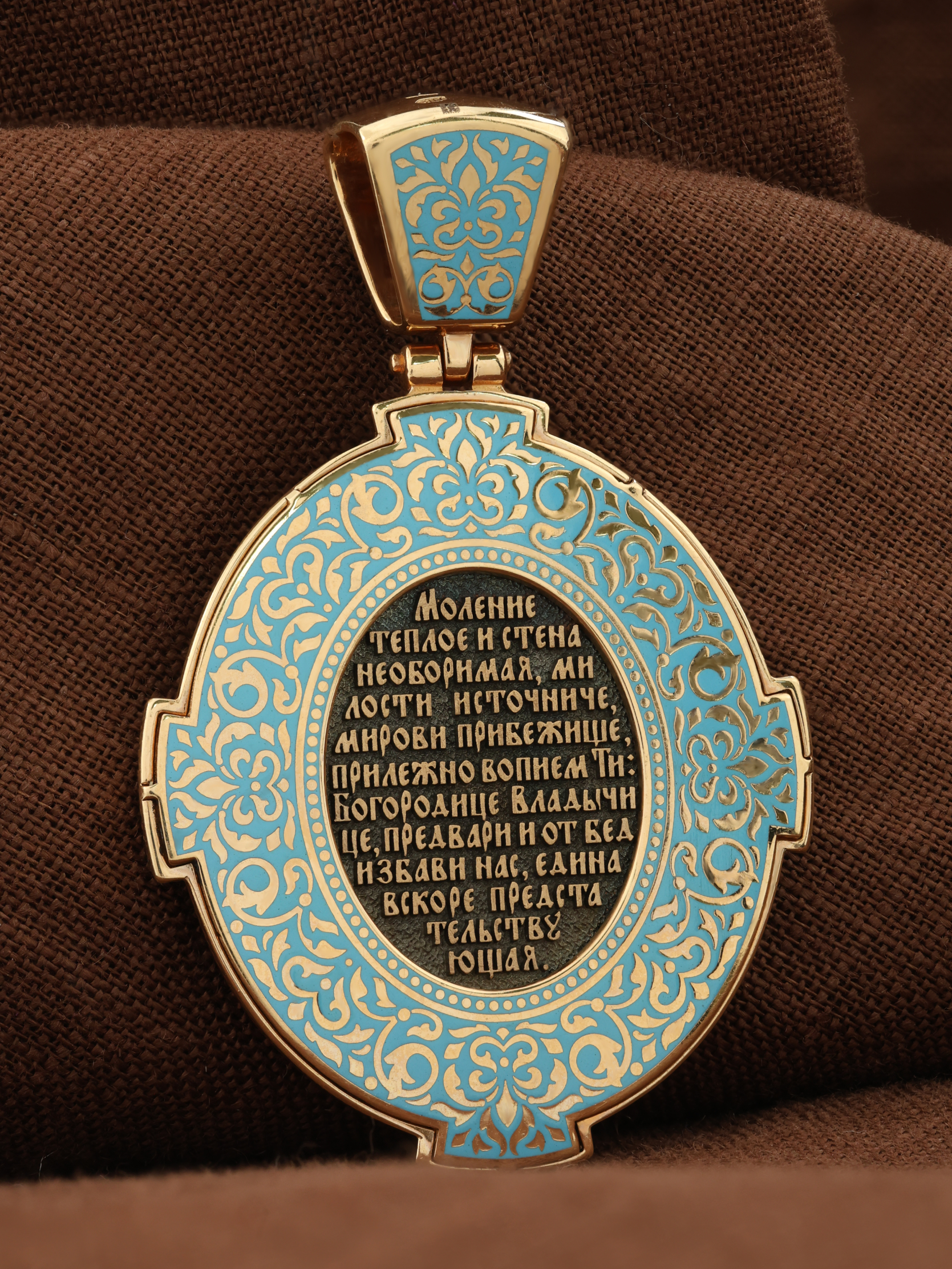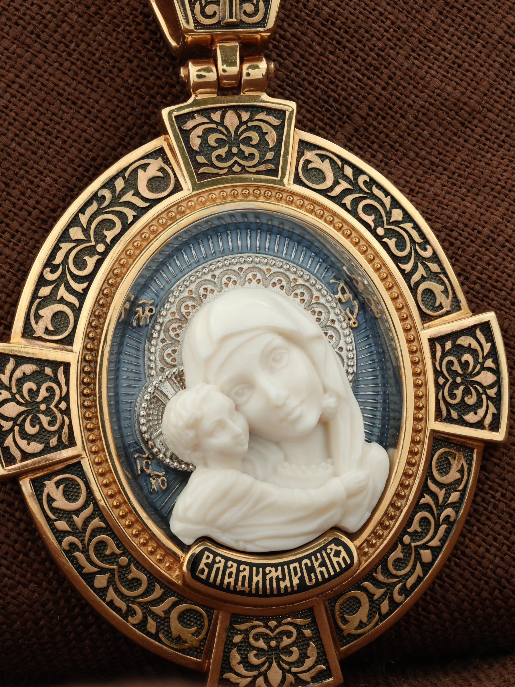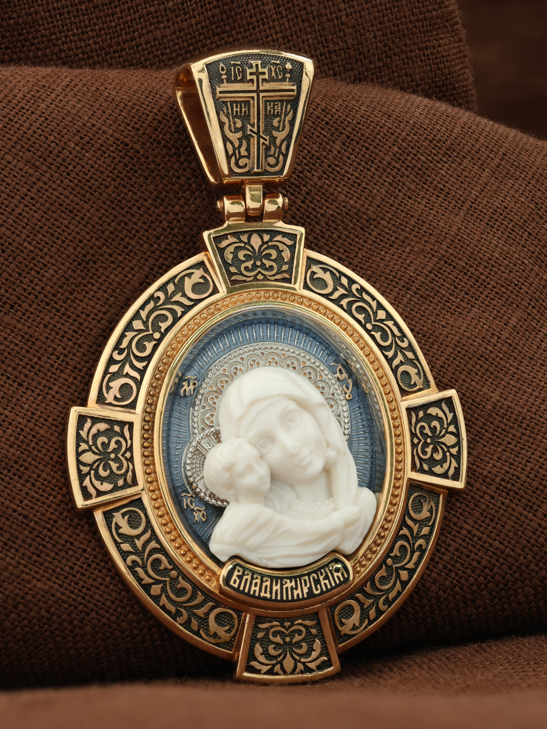 На лицевой стороне образка изображена Владимирская икона Божией Матери — одна из самых чтимых святынь Русской православной церкви. По преданию, икона была написана Святым апостолом и евангелистом Лукой во время земной жизни Богородицы. Дева Мария, увидев Свое изображение, молвила: «Отныне ублажат Мя вси роди. Благодать Рождшегося от Меня и Моя с сим образом да будет». Образ написан в лирическом иконографическом типе «Умиление». Младенец припал щекой к щеке Матери и тянется к ней правой рукой, другой нежно обнимая за шею. Икона вплоть до V века находилась в Иерусалиме, затем была перевезена в Византию. На Русь икона была привезена в 1131 г. За прошедшие столетия святыня неоднократно переезжала из Владимира в Москву и обратно, не раз спасая страну от захватчиков. Русская Православная Церковь установила троекратное празднование Владимирской иконе Божьей Матери. Каждый из дней празднования связан с избавлением русского народа от порабощения иноплеменниками по молитвам ко Пресвятой Богородице. В последующие века у иконы происходили многие важные исторические события: подписание актов, принятие присяги значимых государственных деятелей и возведение на престол. На кулонном кольце изображен Спас Нерукотворный — образ Господа и Спасителя нашего Иисуса Христа, чудесно отпечатавшийся на плате, котором Христос вытер свой лик.