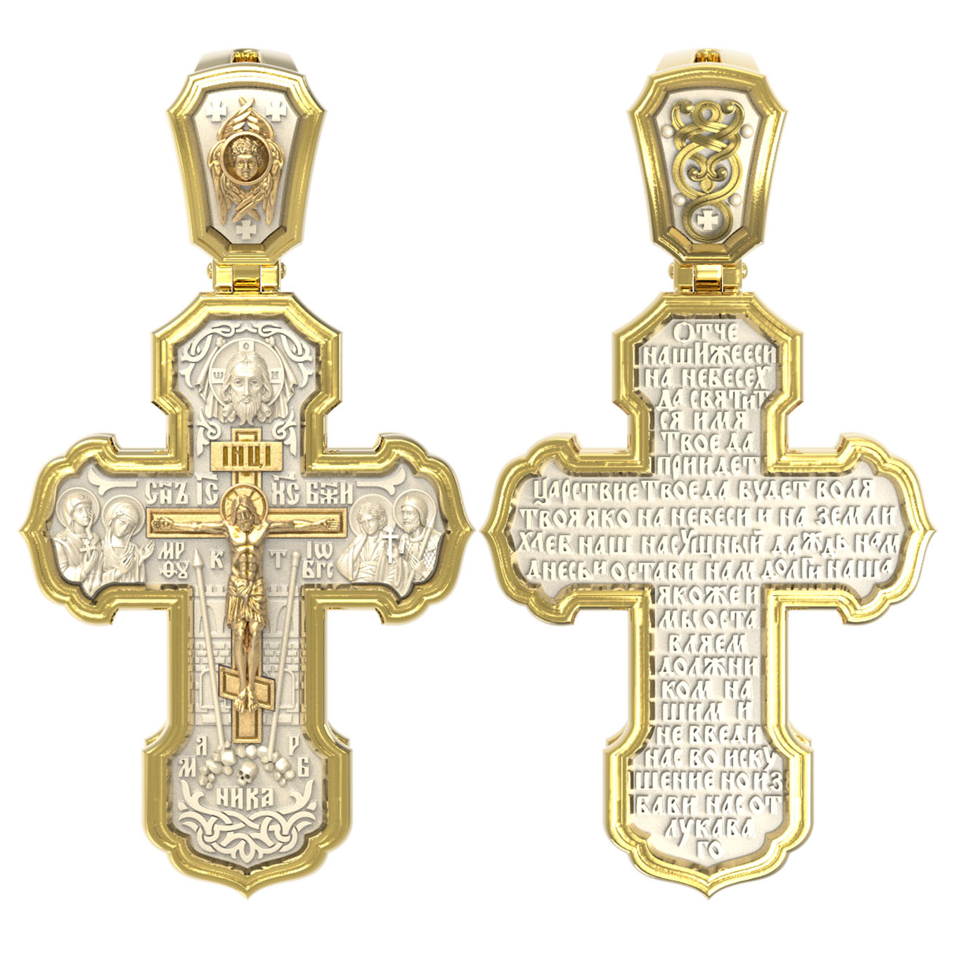 На лицевой стороне креста изображено Распятие Господа и Спасителя нашего Иисуса Христа. Крест- символ спасения и искупления рода человеческого, знамение победы над смертью и адом. Иисус Христос, как искупительная жертва освобождения человечества от власти греха, умер крестной смертью и в третий день воскрес. На верхней табличке, выше головы Иисуса, расположена надпись, составленная Понтием Пилатом — «IНЦI». Она означает «Иисус Назорей, Царь Иудейский». Надпись «IС» « ХС» означает Иисус Христос и помещается на разных сторонах поперечной (большой) перекладины креста. Рядом расположена надпись «Сын Божий». Выше Распятия изображен Нерукотворный образ Господа и Спасителя нашего Иисуса Христа. Слева от Распятия — Пресвятая Богородица и святая мироносица Мария Магдалина с крестом в руке. Справа — апостол и евангелист Иоанн Богослов, один из ближайших учеников Иисуса Христа и сотник Лонгин с крестом в правой руке и копьем — в левой. За крестом высится Иерусалимская стена. Крест стоит на горе камней, символизирующих Голгофу. В ее основании различается череп — это голова Адама. Вдоль креста изображены копие сотника Лонгина и трость с губкой и буквы «К» и «Т». Надпись «МЛРБ» — «место лобное рай бысть» означает, что место лобное стало раем и помещаются в нижней части креста. Рядом — слово «НИКА», что означает «победитель». На православном кресте Христос не умирает, а свободно простирает руки, ладони Иисуса открыты, будто он хочет обнять все человечество, даря им свою любовь и открывая путь к вечной жизни. На кулонном кольце изображен шестикрылый Серафим.