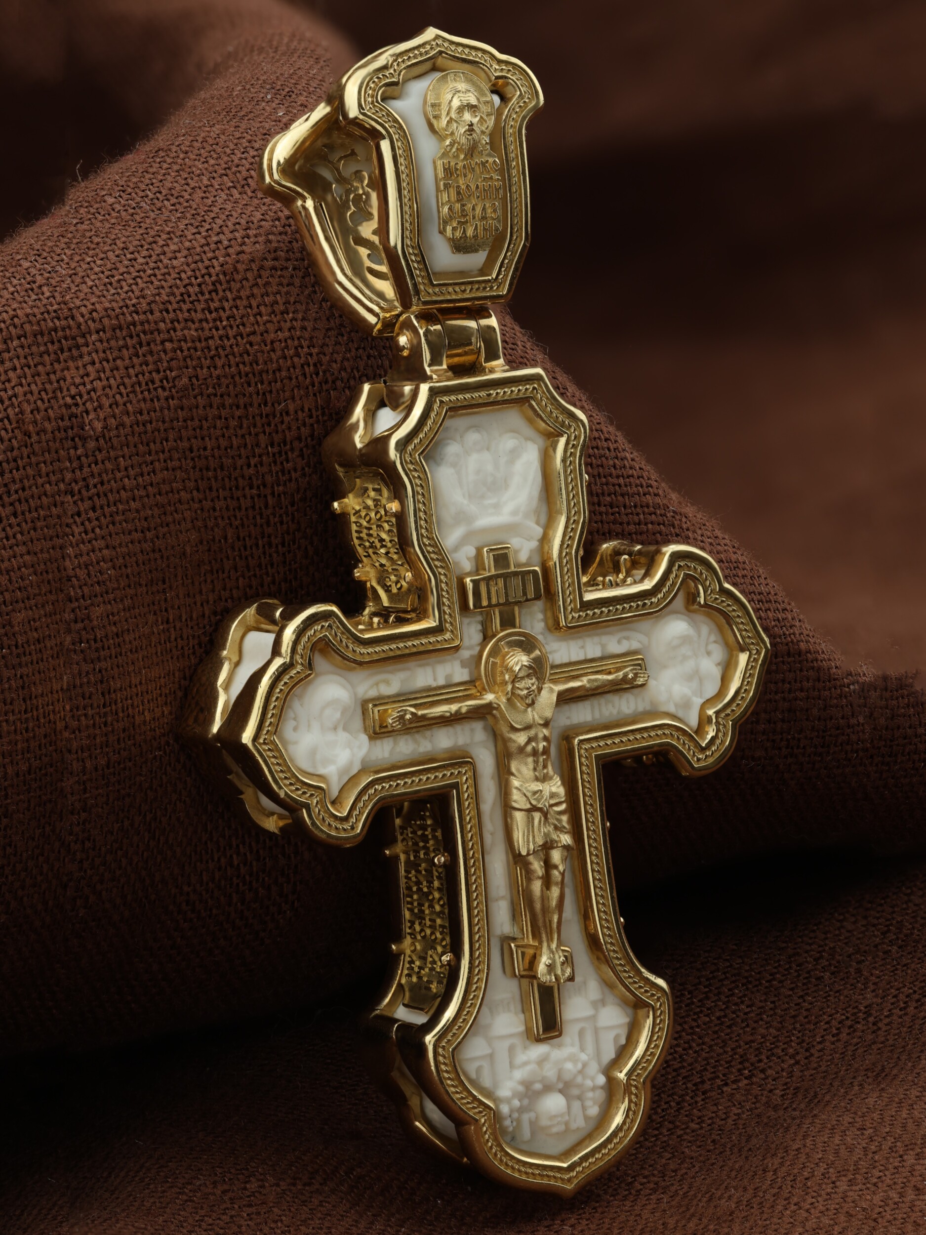 На лицевой стороне креста изображено Распятие Господа и Спасителя нашего Иисуса Христа, отдавшего Себя на смерть, чтобы другие могли жить — жить вечной жизнью, жить с Богом. Через крестную жертву Бог раскрывает нам Свою безмерную любовь и призывает к ответной любви. Своею кровью Господь освятил крест и сделал его проводником Своей благодати, источником освящения верующих. На верхней табличке, выше головы Иисуса, расположена надпись, составленная Понтием Пилатом — «IНЦI». Она означает «Иисус Назорей, Царь Иудейский». Распятие сопровождается каноническими надписями. Надпись «IС» « ХС» означает Иисус Христос и помещается над Распятием. Надпись «Царь Славы» помещается на разных сторонах поперечной (большой) перекладины креста. Ниже расположены надпись «Сын Божий» и слово «НИКА», что означает «победитель». Слева от Распятия изображена Пресвятая Богородица, Справа изображен Пророк Предтеча и Креститель Господень Иоанн. За Распятием высится Иерусалимская стена, в знак того, что Господь был распят вне стен города. Возвышение, на котором стоит Крест, символизирует гору Голгофу, на которой произошло Распятие. Под подножием Креста изображена покоящаяся голова (череп) Адама и надпись «Г.А.». Над распятием помещено изображение иконы Святой Троицы в виде трех ангелов. На кулонном кольце изображен Нерукотворный образ Господа и Спасителя нашего Иисуса Христа, чудесно отпечатавшийся на плате, котором Христос вытер свой лик.