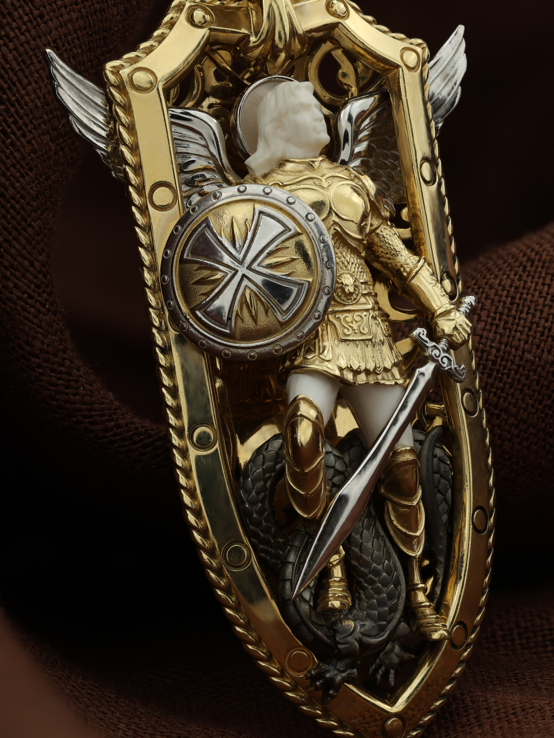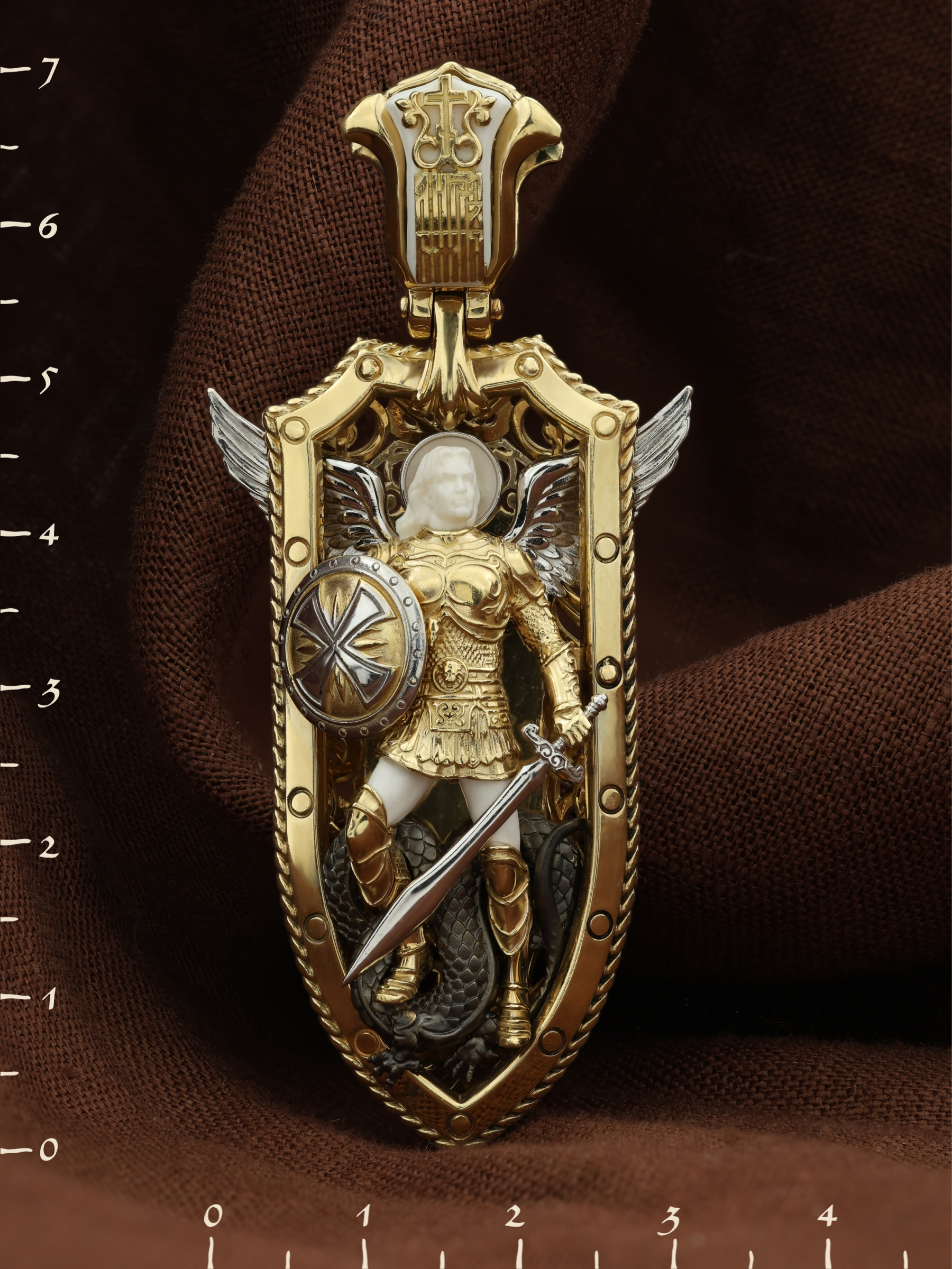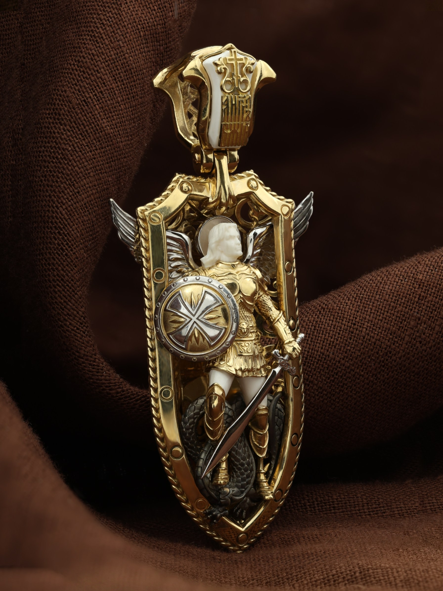 Нательная икона из лимонного золота 585 пробы c эмалью и бивнем мамонта