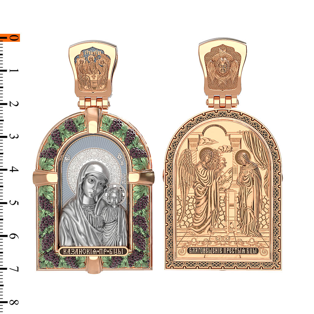 Казанская икона Божией Матери — одна из самых почитаемых в России чудотворных икон Богородицы. Богословское значение Казанской иконы — указать верующим истинный Путь к спасению, который лежит через Христа. Только Божия Матерь имеет настолько сильное дерзновение к Спасителю, что может ходатайствовать перед Ним за всех верных. Именно этот образ дарится новой повенчанной паре, как хранитель очага и семейная реликвия. Молитва перед Казанской иконой Божьей Матери помогает во всех сложных случаях жизни, в болезнях, во всех печалях, невзгодах, скорбях. Уникальная история появления, чудеса, случившиеся по молитвам православных людей возле образа — все это делает Казанскую Богородицу особенной, среди тысяч других икон. Вверху — икона Святой Троицы, на которой запечатлено явление Триединого Бога праотцу Аврааму в виде трех ангелов. Образок обвивает виноградная лоза — один из самых распространенных символических образов христианства. Она является символом Иисуса Христа, Который в Евангелии говорит о Себе: «Я есмь истинная виноградная лоза, и Отец мой — виноградарь». (Ин. 15:1). Поэтому именно из винограда изготавливается вино для Причастия, призванное символизировать Кровь Христову.