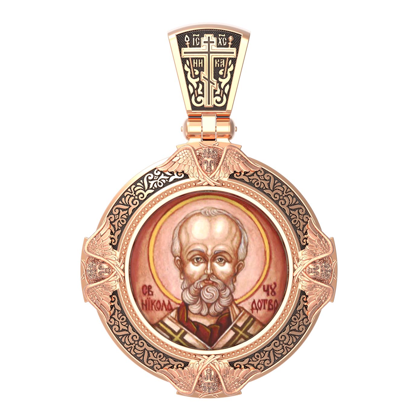 Нательная икона из красного золота 585 пробы c эмалью, иконописью и темперой