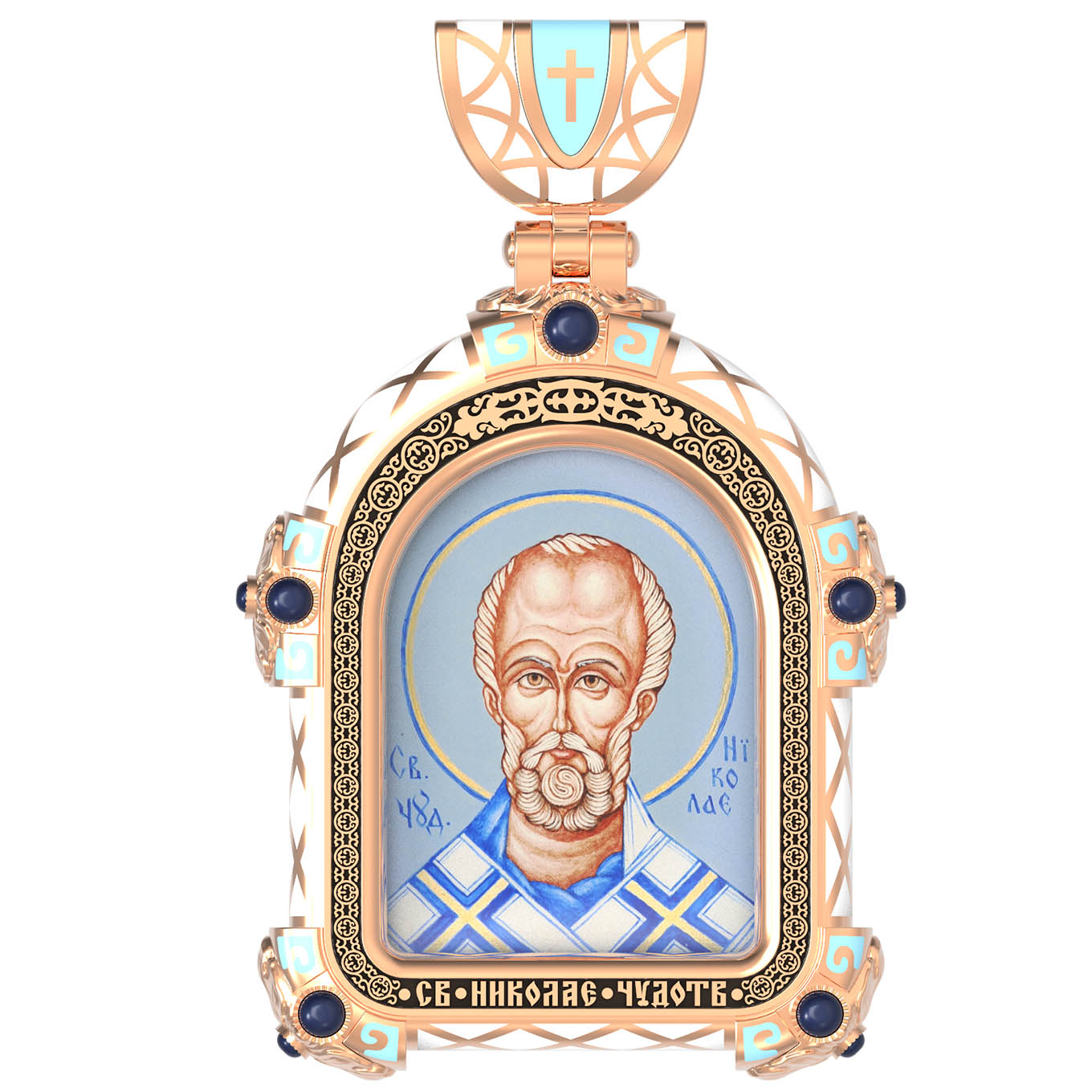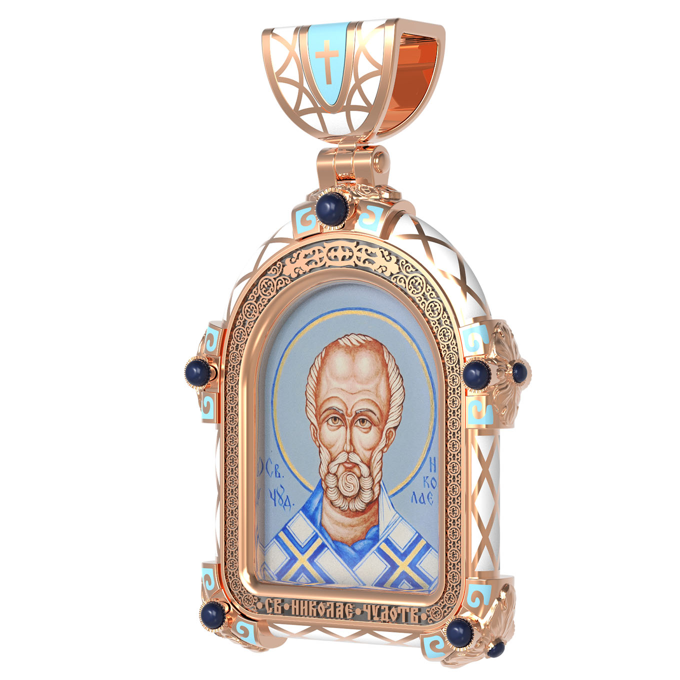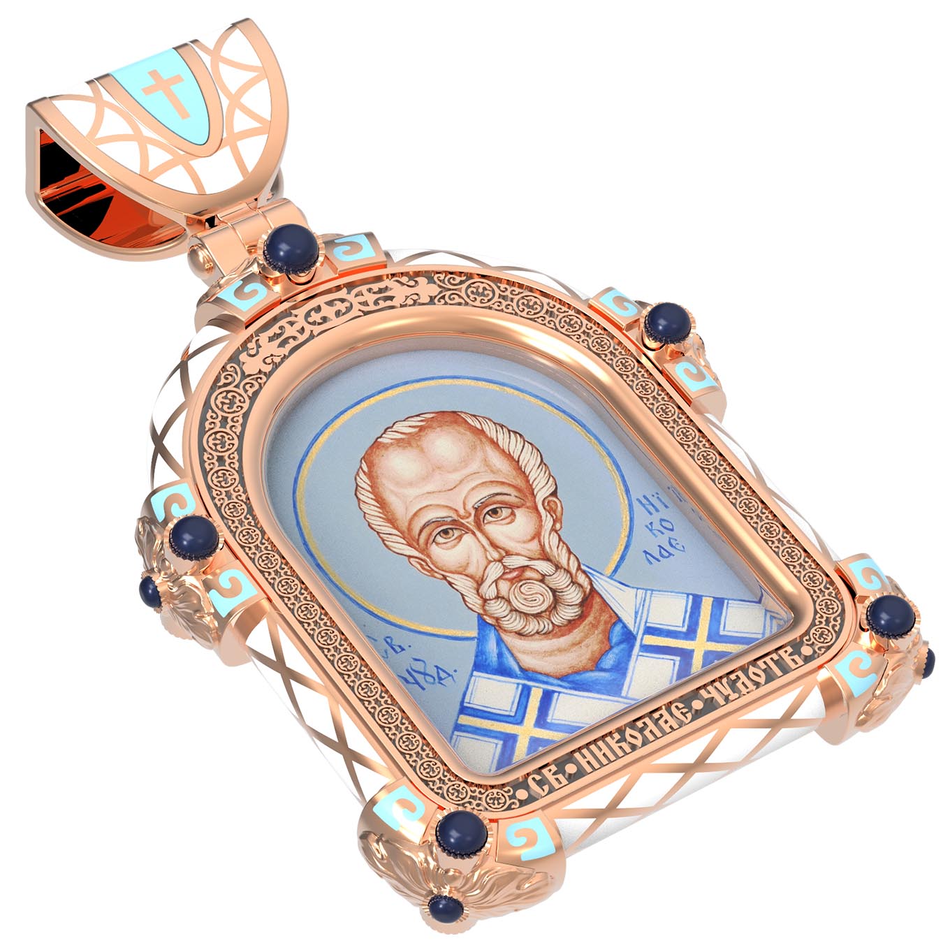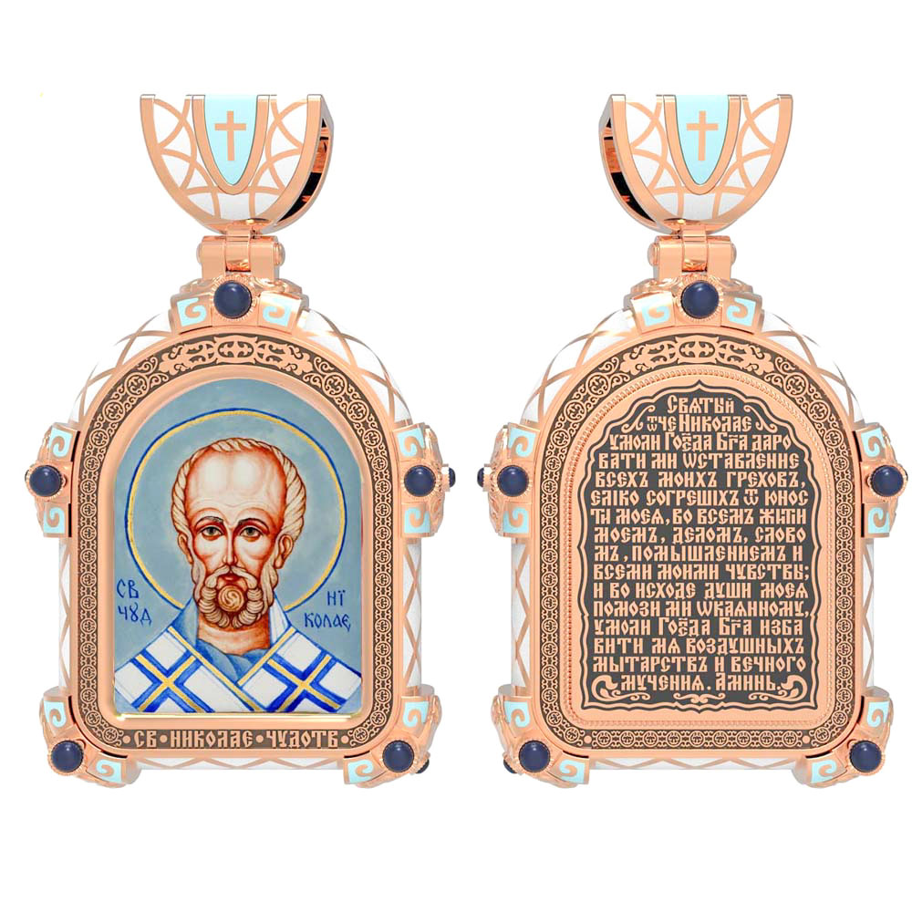 На лицевой стороне образка изображен Святитель Николай архиепископ Мир Ликийских, Чудотворец. Он является одним из самых известных на Руси святых, издревле считающийся помощником и молитвенником за всех, притекающих к нему. Чудес его исчислить невозможно. Николай Чудотворец подавал многим исцеления в болезнях и телесных недугах, обогащал бедствующих в крайней нищете, подавал голодным пищу, спасал от потопления, освобождал из плена и избавлял от смерти.