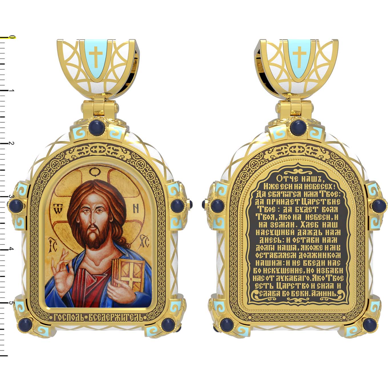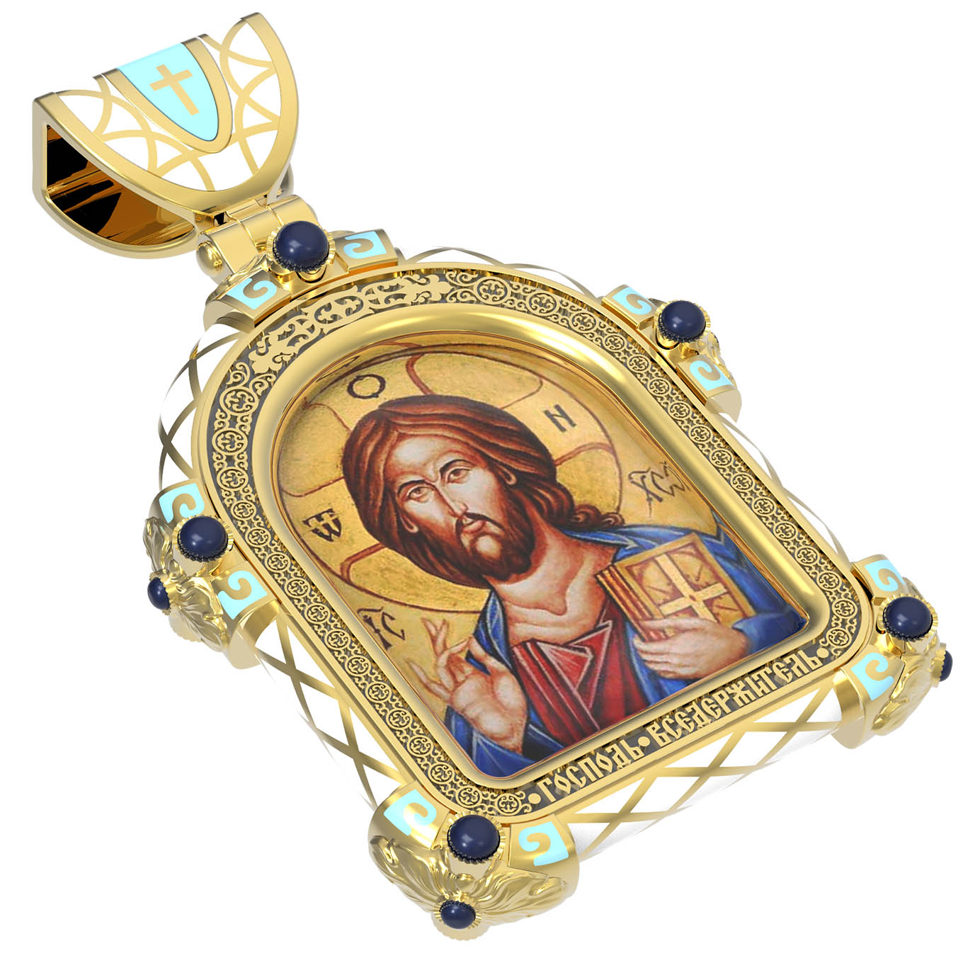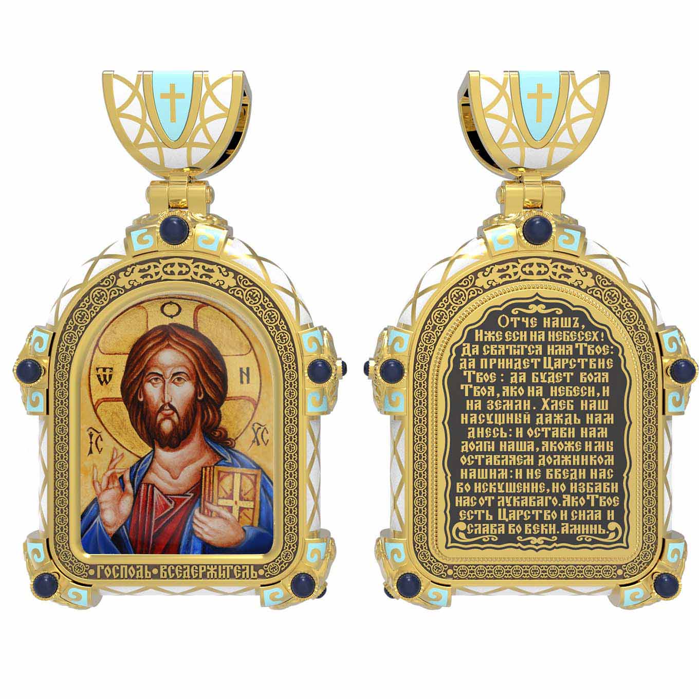 На лицевой стороне образка изображена икона Господа и Спасителя нашего Иисуса Христа — Господь Вседержитель или Пантократор (от греч. всевластный, всесильный). Он представлен как Царь Небесный и будущий Судия мира. Именование Иисуса «Вседержителем» указывает, с одной стороны, на Его Божественную природу: «Аз есмь Альфа и Омега, начало и конец, говорит Господь, Который есть и был и грядет, Вседержитель» (Откр. 1: 8). С другой стороны, такое именование связано и с человеческой природой Христа, искупившего крестной жертвой людские грехи и обновившего тем самым человеческую природу. Господь Иисусь Христос изображен фронтально огрудно. Главу Спасителя осеняет нимб, на нем угадывается крест. Крест символизирует голгофскую жертву Спасителя. По греческой традиции, на нимбе написаны буквы Омега, Омикрон, Ню — вместе они обозначают слово Сущий, одно из имен и характеристику Бога, согласно Священному Писанию. Правой рукой Он благословляет, а левой держит Евангелие — благую весть, принесенную Христом всему миру. Также означает она тот новый мир, который будет сотворен Богом после второго пришествия Христа. Символизирует и Книгу Жизни, где записаны имена всех, возлюбивших Бога. Всемогущий Бог предстает здесь не как обличающий судья, а как милостивый отец, ждущий возвращения блудных детей.