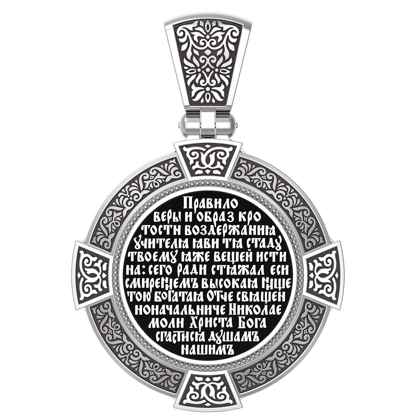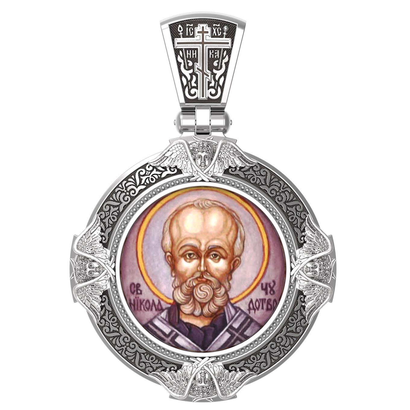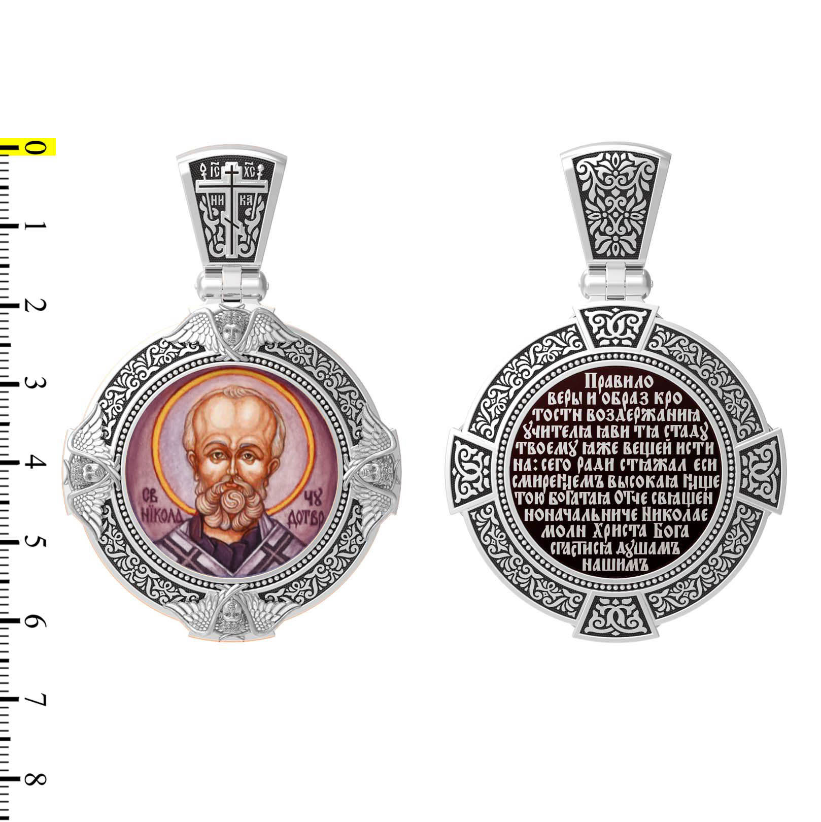 Лицевую сторону возглавляет икона Святителя Николая Чудотворца. Живший в III веке епископ Ликийского города Миры — самый почитаемый святой не только в России, но и во всем мире. Николай Чудотворец, помощник в делах, покровитель учащихся, утешитель обиженных и нуждающихся, целитель самых страшных и тяжелых недугов, предстатель и молитвенник за людей перед Богом. Также Святитель Николай Чудотворец известен своими молитвами за путешественников, когда непрестанный ветер и бушующие волны утихают и корабль заходит в спокойную гавань.