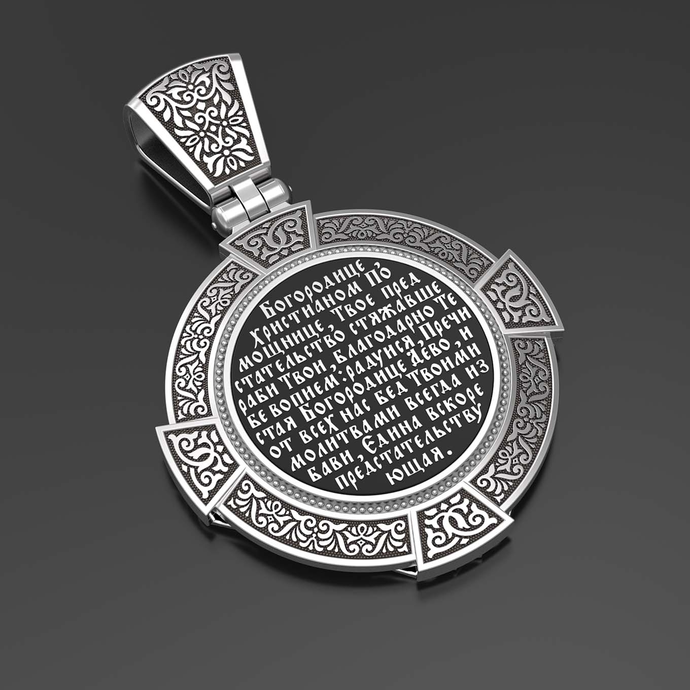 На лицевой стороне образка изображена Казанская икона Божией Матери. Пресвятая Богородица — милосердная заступница, просительница за нас перед Богом. Она стала воистину нашей Матушкой, охраняющей и поддерживающей нас от рождения до самой смерти, а Ее благодатная помощь изливается на нас по молитвам у ее чудотворных икон. Казанская икона явилась в 1579 году в Казани, вскоре после взятия Казанского царства у татар Иоанном Грозным. Этот образ Богородицы не раз сопровождал русский народ в бедствиях. Икона Божией Матери Казанская вдохновляла русских ратников в период Смутного времени при освобождении Москвы от поляков. Перед Казанской иконой в 1709 году, накануне Полтавской победы, император Петр I молился о даровании победы русскому войску. В 1812 году накануне отъезда в действующую армию перед чудотворной иконой Божией Матери молился князь Михаил Кутузов. Не только государственным мужам и дружинам указывала путь икона — по доброй традиции именно этой иконой благословляют на брак молодых родители, длинным списком чудес сопровождается этот образ Богоматери — один из самых любимых на Руси. Существует множество древних списков с этой удивительной иконы. На кулонном кольце изображен Спас Нерукотворный — образ Господа и Спасителя нашего Иисуса Христа, чудесно отпечатавшийся на плате, котором Христос вытер свой лик.