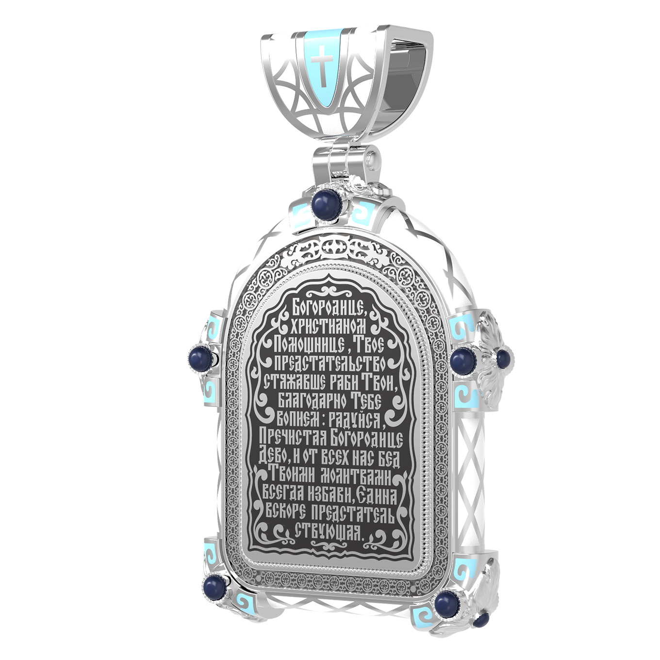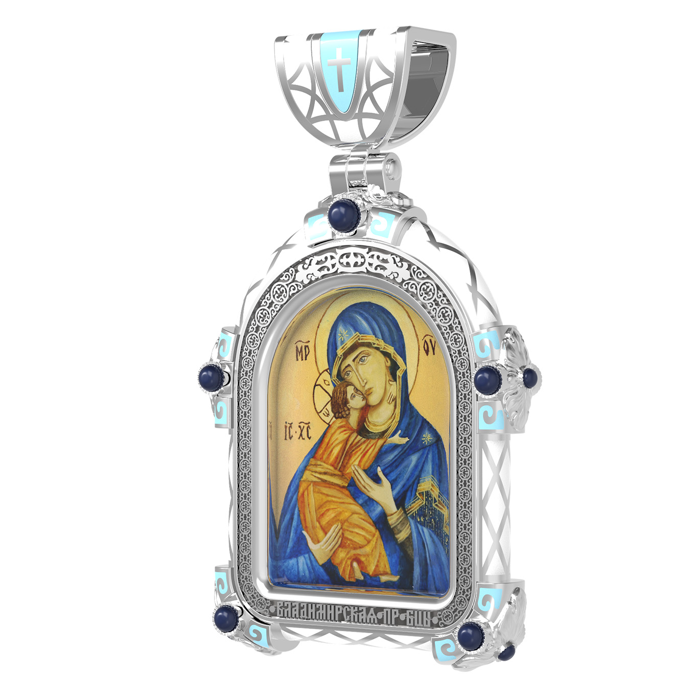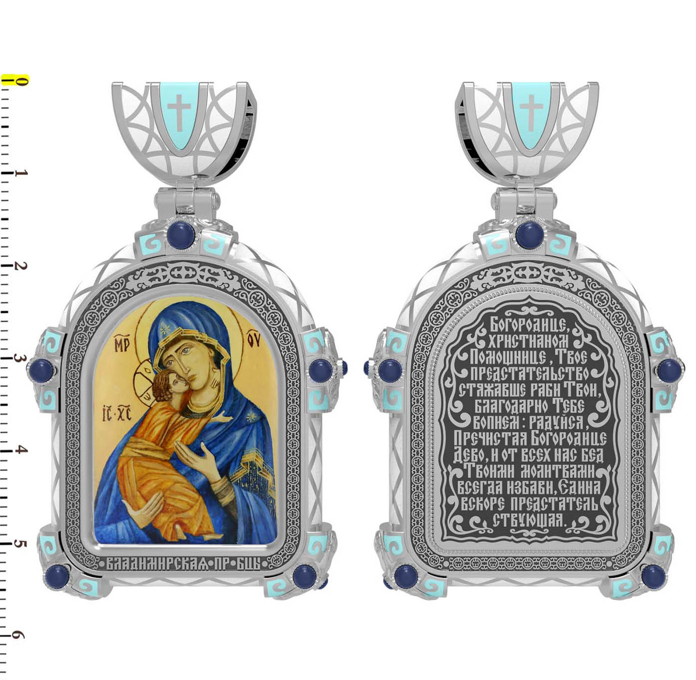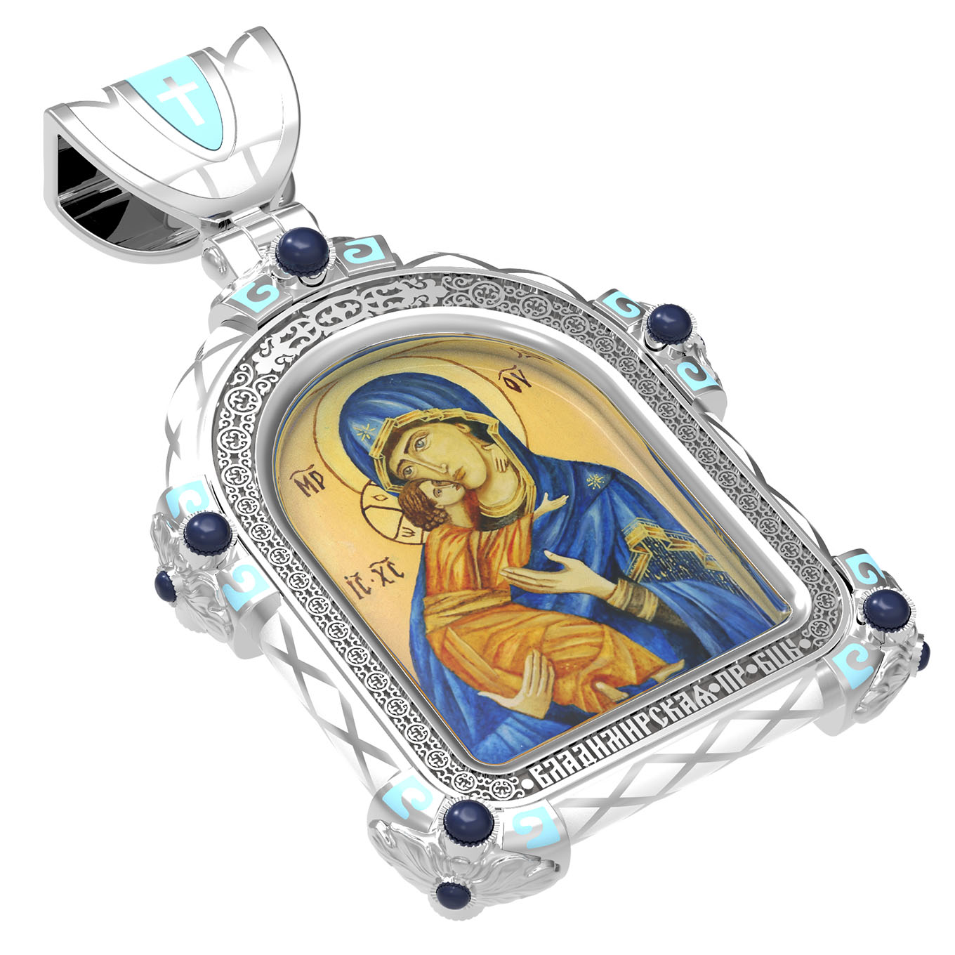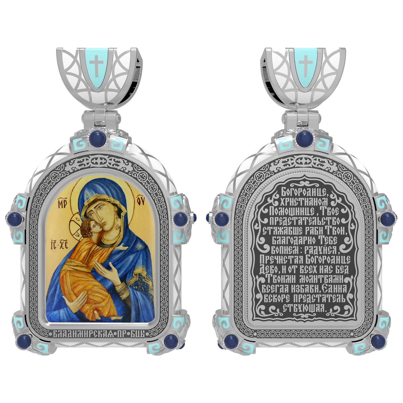 На лицевой стороне образка изображена Владимирская икона Божией Матери — одна из самых чтимых святынь Русской православной церкви. По преданию, икона была написана Святым апостолом и евангелистом Лукой во время земной жизни Богородицы. Дева Мария, увидев Свое изображение, молвила: «Отныне ублажат Мя вси роди. Благодать Рождшегося от Меня и Моя с сим образом да будет». Образ написан в лирическом иконографическом типе «Умиление». Младенец припал щекой к щеке Матери и тянется к ней правой рукой, другой нежно обнимая за шею. Икона вплоть до V века находилась в Иерусалиме, затем была перевезена в Византию. На Русь икона была привезена в 1131 г. За прошедшие столетия святыня неоднократно переезжала из Владимира в Москву и обратно, не раз спасая страну от захватчиков. Русская Православная Церковь установила троекратное празднование Владимирской иконе Божьей Матери. Каждый из дней празднования связан с избавлением русского народа от порабощения иноплеменниками по молитвам ко Пресвятой Богородице. В последующие века у иконы происходили многие важные исторические события: подписание актов, принятие присяги значимых государственных деятелей и возведение на престол. На кулонном кольце изображен Спас Нерукотворный — образ Господа и Спасителя нашего Иисуса Христа, чудесно отпечатавшийся на плате, котором Христос вытер свой лик.