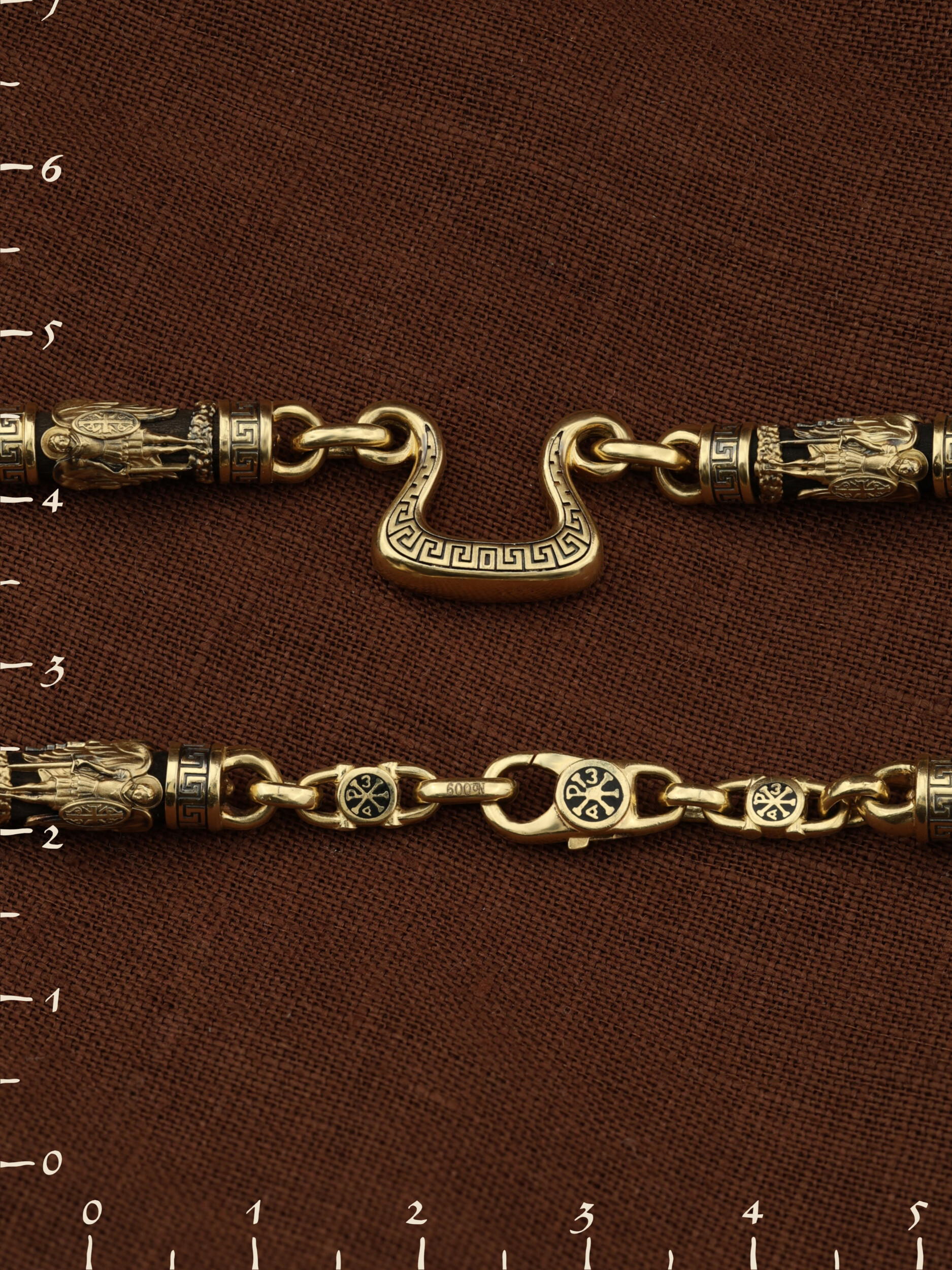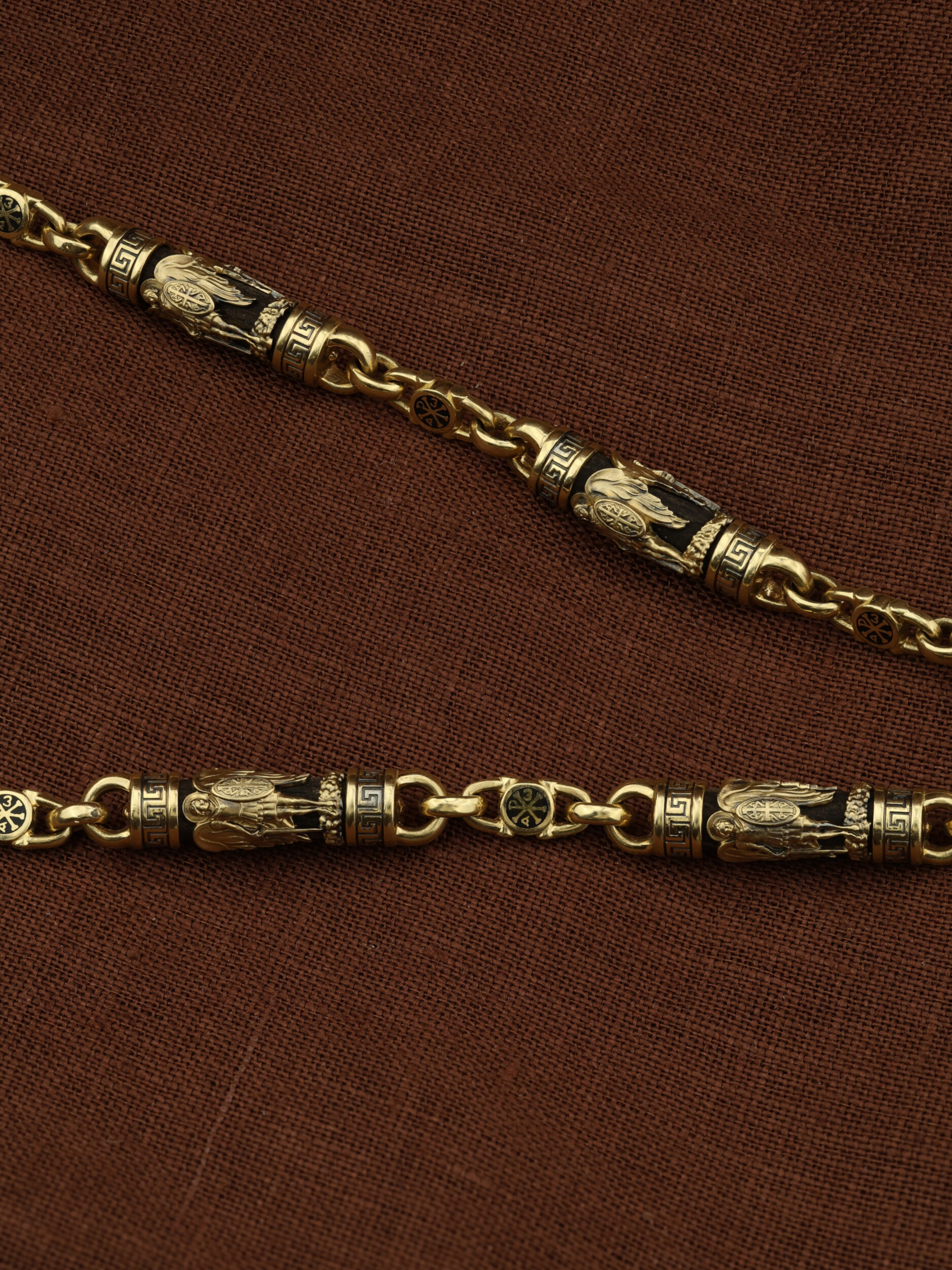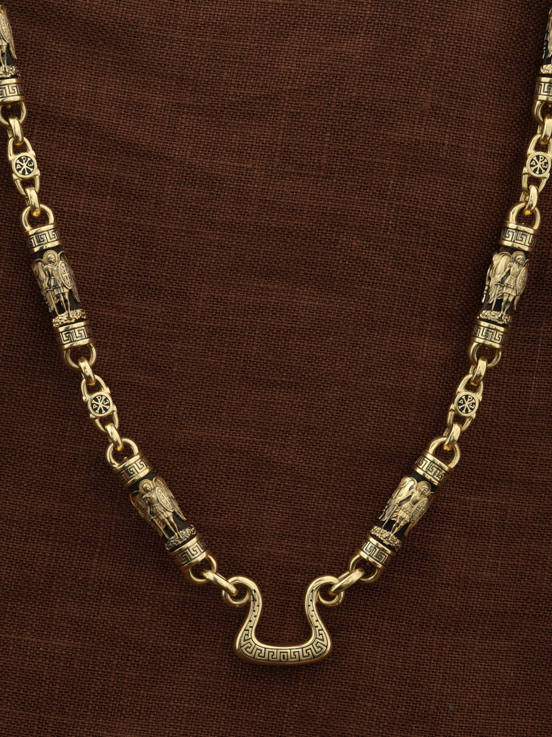 На звеньях цепи изображена Хризма — монограмма имени Христа, которая состоит из двух начальных греческих букв имени — Х (хи) и Р (ро), скрещённых между собой. По краям монограммы помещены греческие буквы a и w. Такое употребление этих букв восходит к тексту Апокалипсиса: «Аз есмь Альфа и Омега, начало и конец, говорит Господь, Который есть и был и грядет, Вседержитель.» (Откр. 1:8; см. также Откр. 22:13). Также на звеньях изображен Святой Ангел-Хранитель в виде прекрасного юноши держащего в правой руке мечь, а в левой — щит. Ангел-Хранитель — это Ангел приставляемый Богом к человеку при крещении для охраны и помощи в добрых делах. Он невидимо находится при человеке на протяжении всей его жизни, если человек сохраняет в себе любовь к Богу и истинную веру перед Ним. Ангел-Xранитель делают для нас все, что служит к истинному нашему благу и спасению. Невидимо пребывая при нас постоянно, он, руководствуя нас ко спасению, не только по нашему желанию таинственно наставляет нас на все доброе и полезное, не только возносит наши молитвы к Богу, но еще и сам от себя охраняют и защищают нас от врагов видимых и невидимых и ходатайствует за нас пред Богом. Ангел-Хранитель так любит нас, как никто на земле любить не может. Одного лишь каждому из нас он желает — спасения души; к этому он направляет все свои заботы. И если видит нас также заботящимися о спасении, радуется, если же видит нас пребывающими в нерадении о душе своей, скорбит. Но и самый великий грешник может примириться со своим Ангелом-Хранителем посредством искреннего раскаяния в грехах и оставления их навсегда. В таком случае, по слову Писания, великая радость бывает для всех ангелов на небесах (Лк. 15:10). Цепь украшена орнаментом.