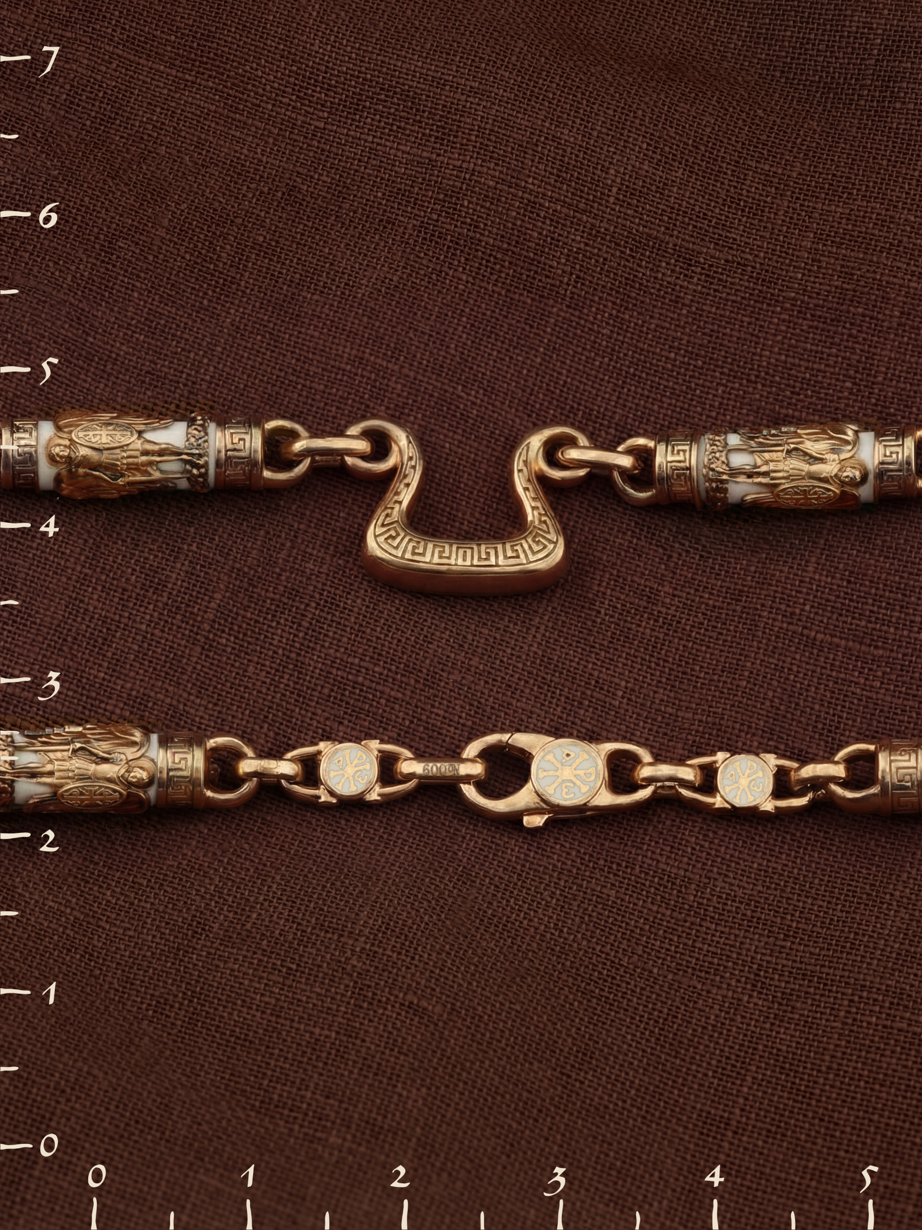 На звеньях цепи изображена Хризма — монограмма имени Христа, которая состоит из двух начальных греческих букв имени — Х (хи) и Р (ро), скрещённых между собой. По краям монограммы помещены греческие буквы a и w. Такое употребление этих букв восходит к тексту Апокалипсиса: «Аз есмь Альфа и Омега, начало и конец, говорит Господь, Который есть и был и грядет, Вседержитель.» (Откр. 1:8; см. также Откр. 22:13). Также на звеньях изображен Святой Ангел-Хранитель в виде прекрасного юноши держащего в правой руке мечь, а в левой — щит. Ангел-Хранитель — это Ангел приставляемый Богом к человеку при крещении для охраны и помощи в добрых делах. Он невидимо находится при человеке на протяжении всей его жизни, если человек сохраняет в себе любовь к Богу и истинную веру перед Ним. Ангел-Xранитель делают для нас все, что служит к истинному нашему благу и спасению. Невидимо пребывая при нас постоянно, он, руководствуя нас ко спасению, не только по нашему желанию таинственно наставляет нас на все доброе и полезное, не только возносит наши молитвы к Богу, но еще и сам от себя охраняют и защищают нас от врагов видимых и невидимых и ходатайствует за нас пред Богом. Ангел-Хранитель так любит нас, как никто на земле любить не может. Одного лишь каждому из нас он желает — спасения души; к этому он направляет все свои заботы. И если видит нас также заботящимися о спасении, радуется, если же видит нас пребывающими в нерадении о душе своей, скорбит. Но и самый великий грешник может примириться со своим Ангелом-Хранителем посредством искреннего раскаяния в грехах и оставления их навсегда. В таком случае, по слову Писания, великая радость бывает для всех ангелов на небесах (Лк. 15:10). Цепь украшена орнаментом.